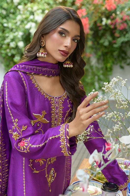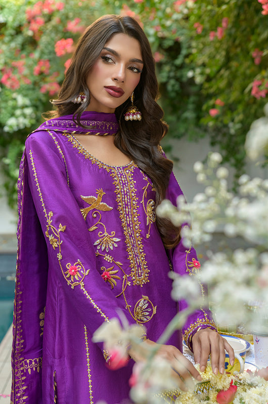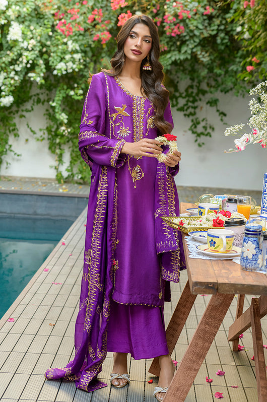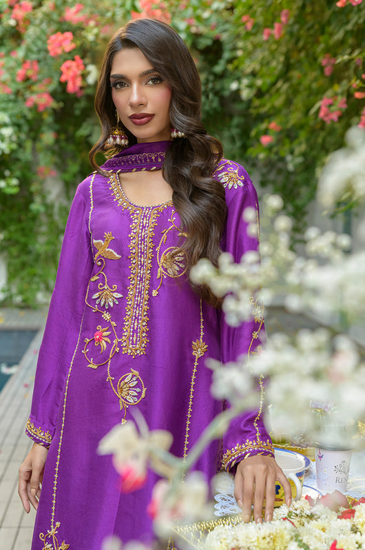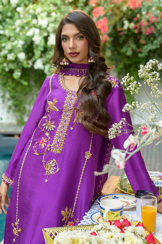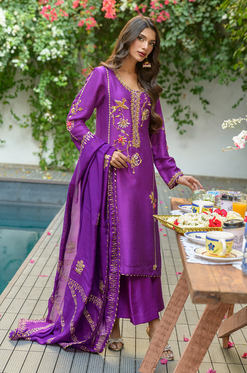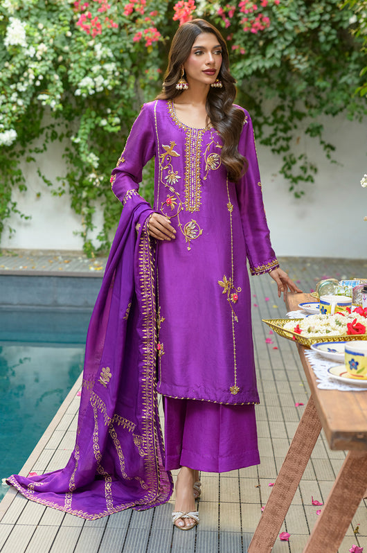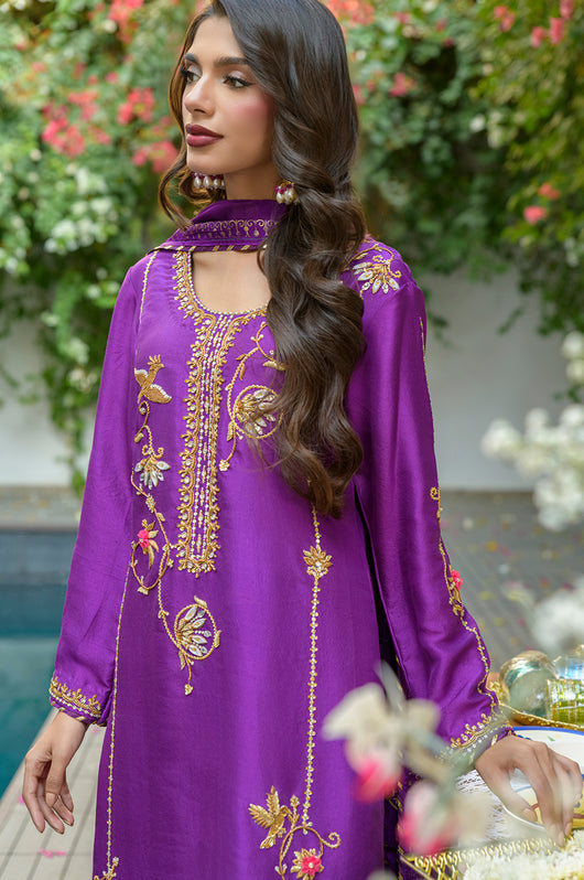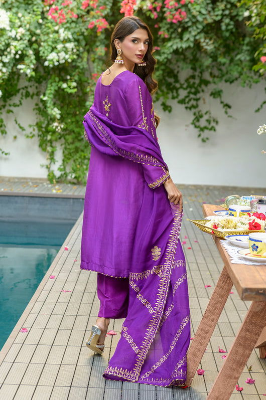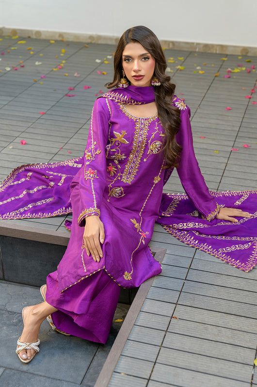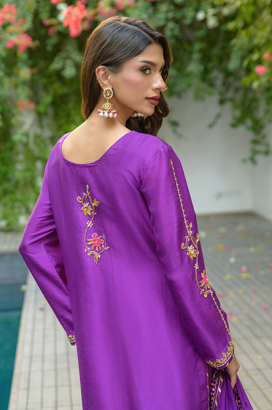 The beautifully designed Jamni purple shirt adorned in multi shades of hand work which includes copper, gold and silver tones with pink flowers to add contrast. The dress is made in very soft flowy Pure Raw silk (80 gms), and comes with a pure silk dupatta with block print on it. Chatapati lace finishes run all throughout the dress.