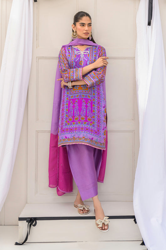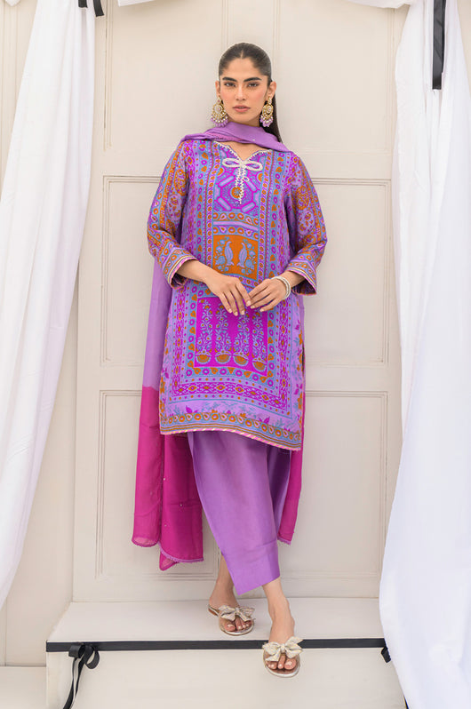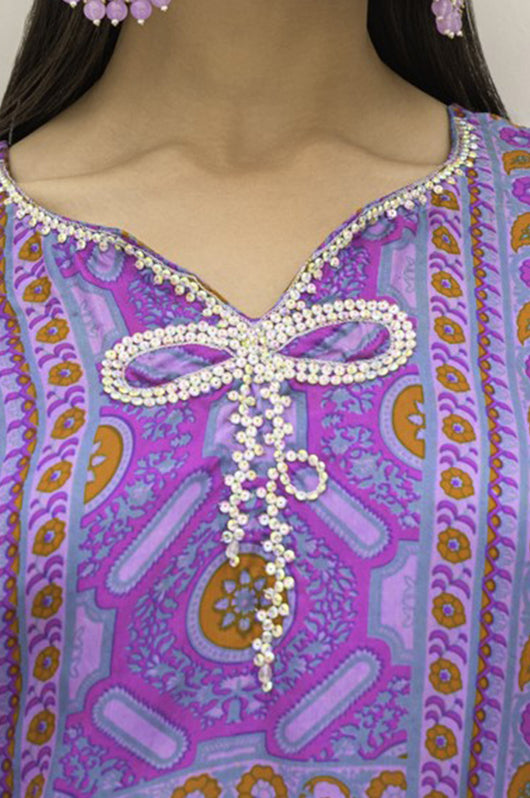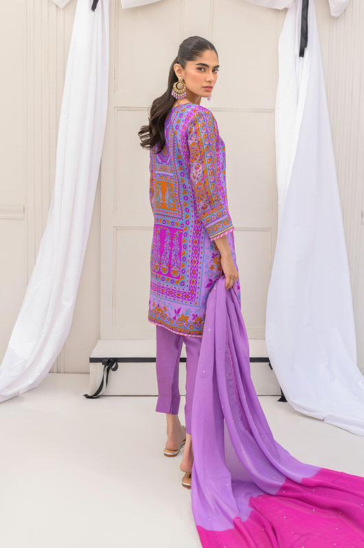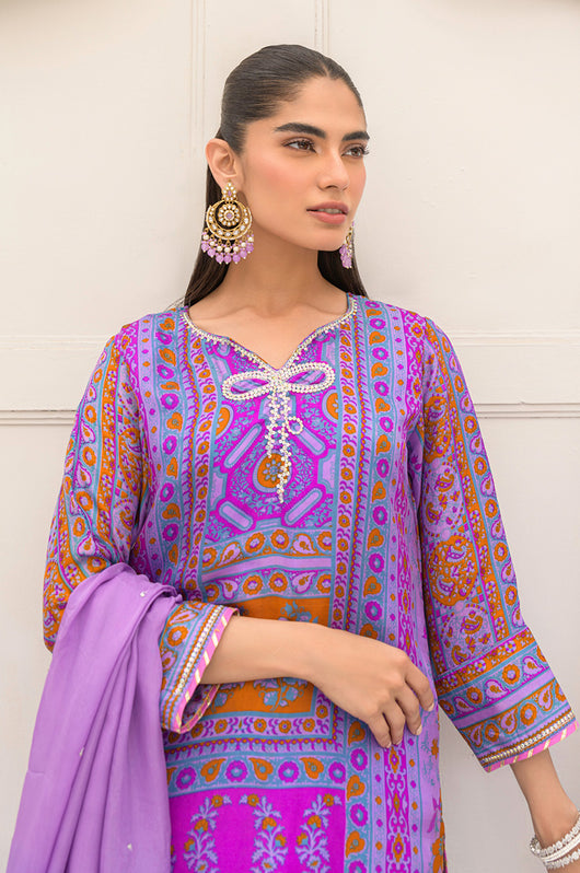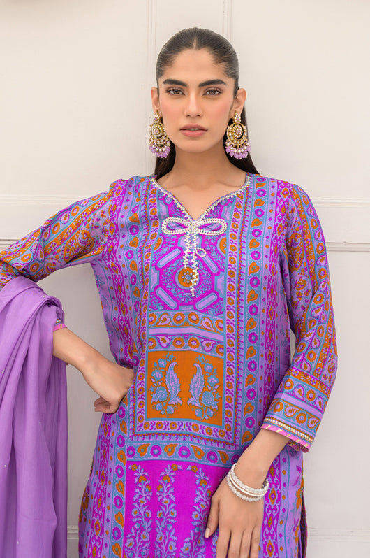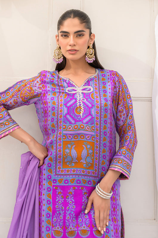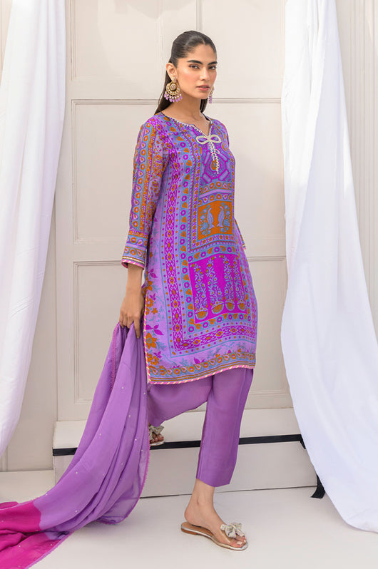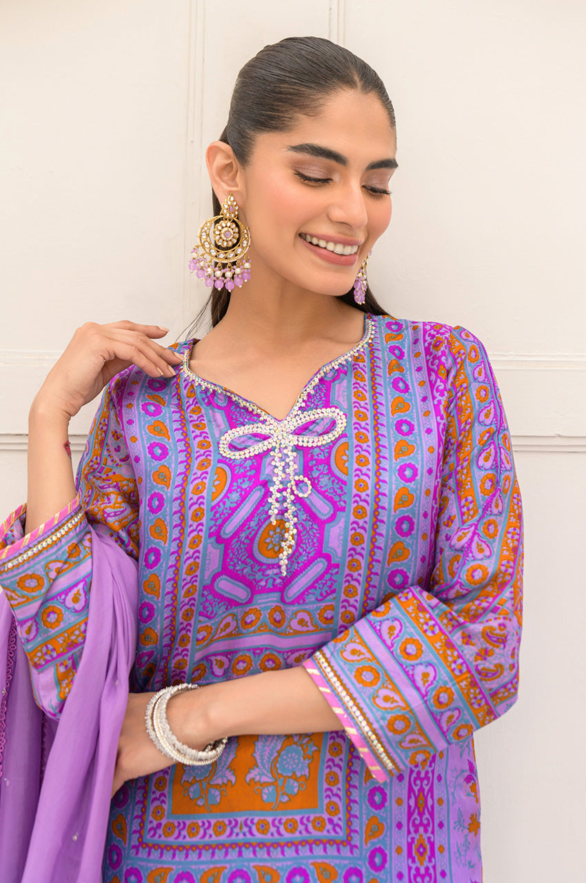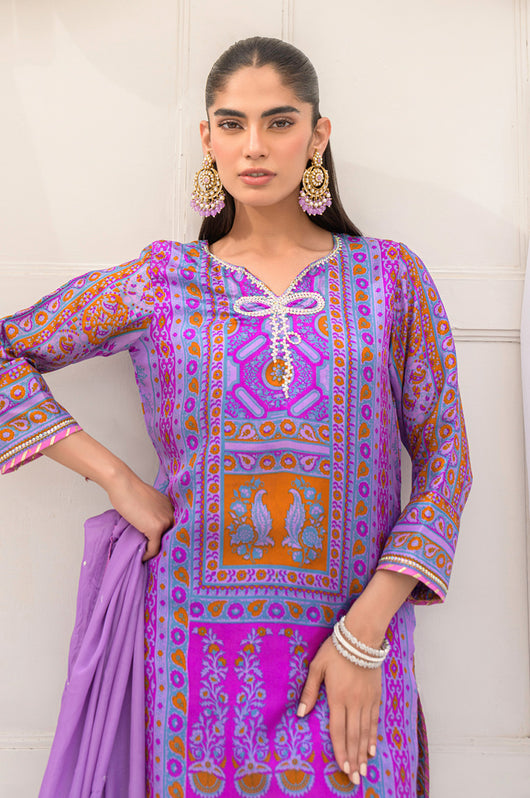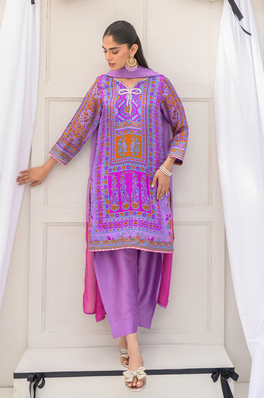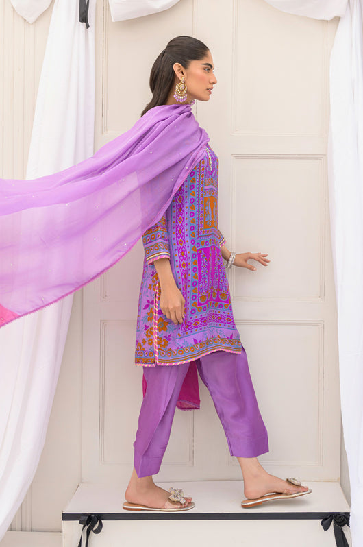 Kiya is a short shirt made in digital pure medium silk shirt. Comes with a blingy neckline and a shalwar made in butter silk. Comes with a two toned dupatta with chan and lace details.