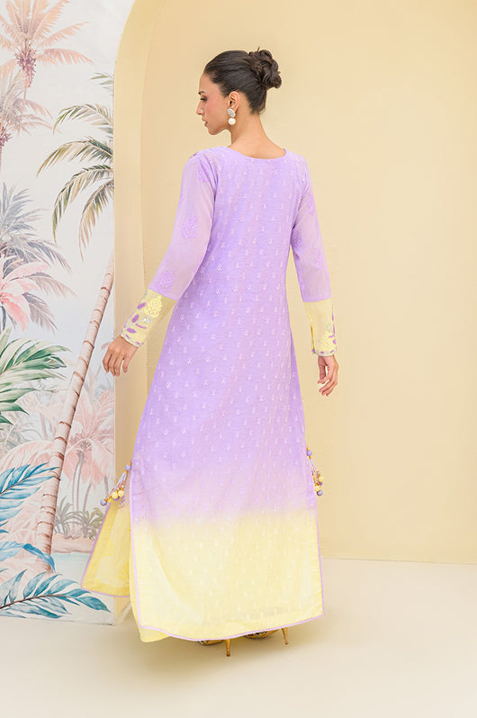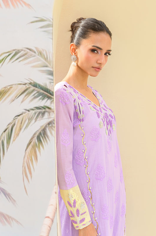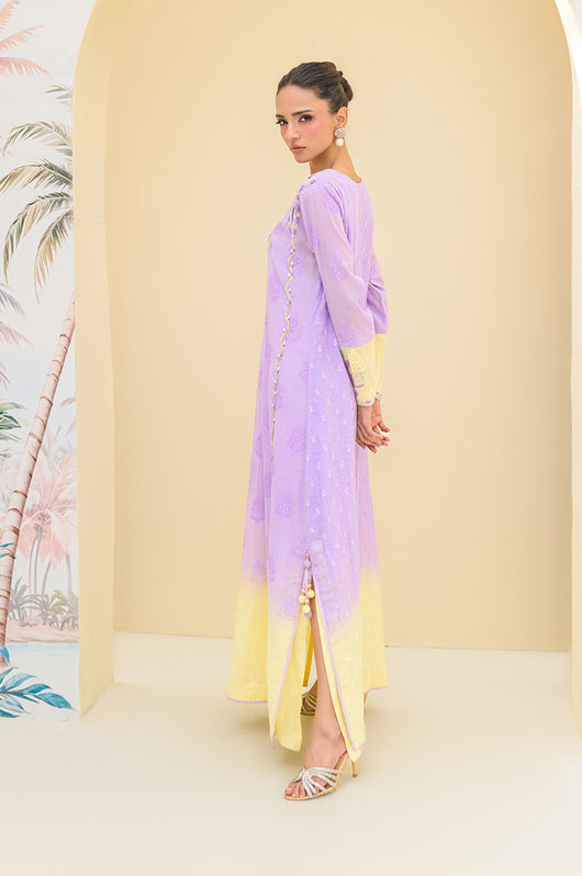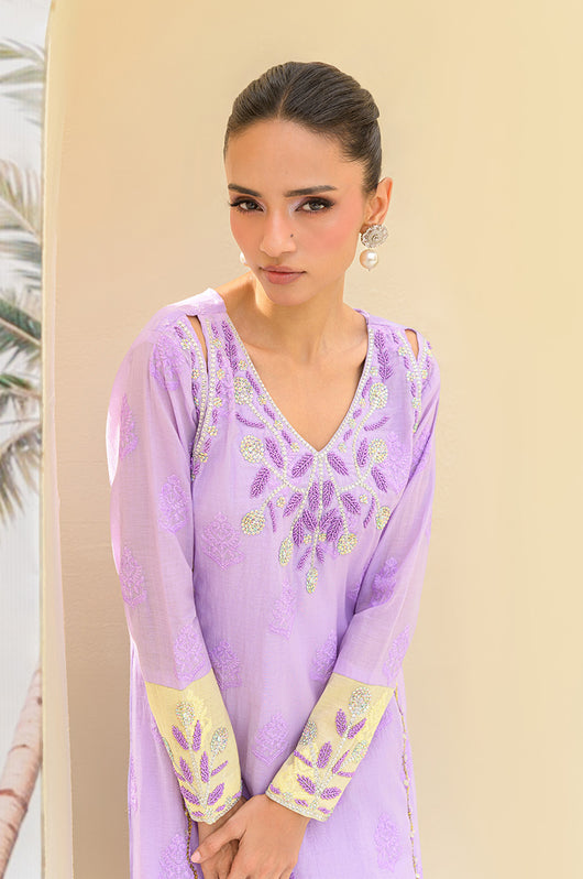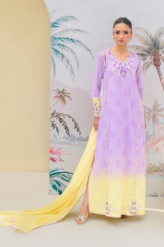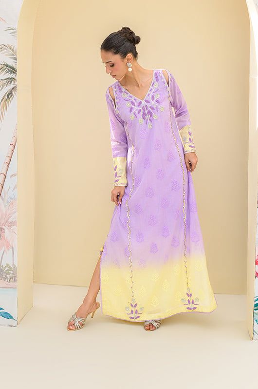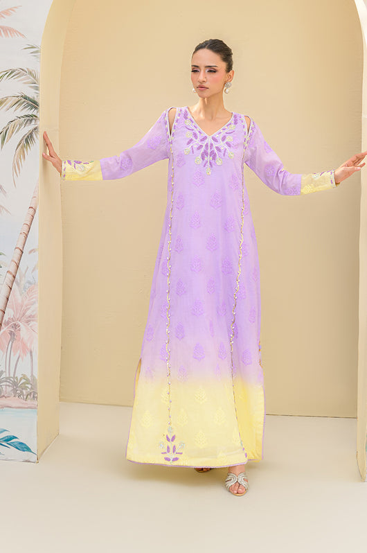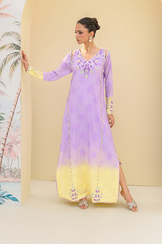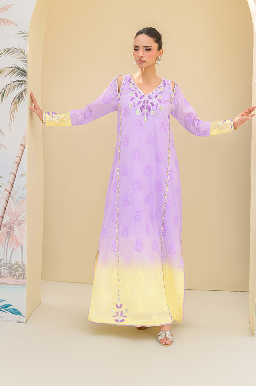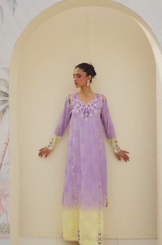 Lavender butter is a butter silk kaftan on a self-embroidered base made in two-toned ombre shades. The outfit has a heavily hand-embellished neckline and front with cut work on the sides of the shoulders. The material used for hand embellishments is shiny sequins, same colored cut danas, kora and multi tikki stones for the shine. The outfit comes with a butter yellow colored dupatta with chan and lace finishes. You can also order butter silk pants along with this kaftan for modest reasons.