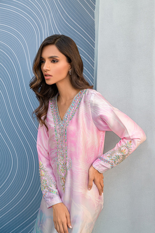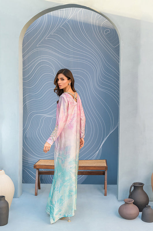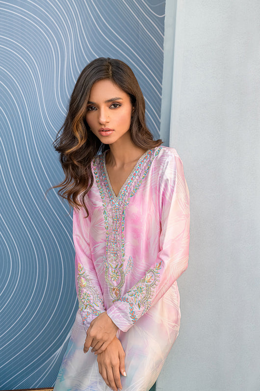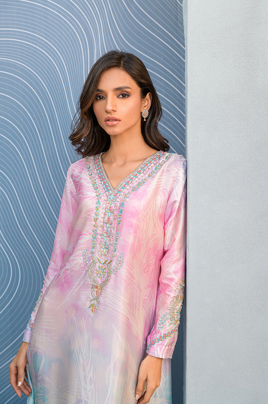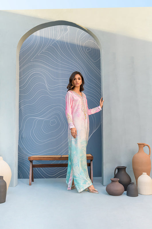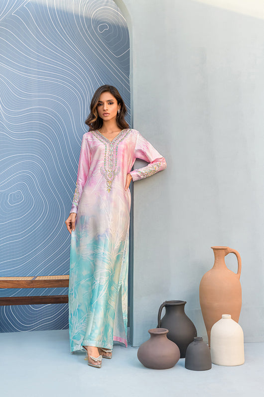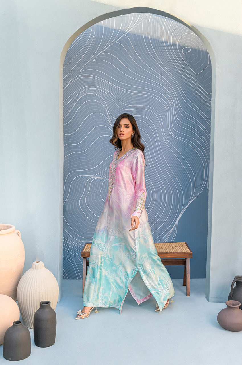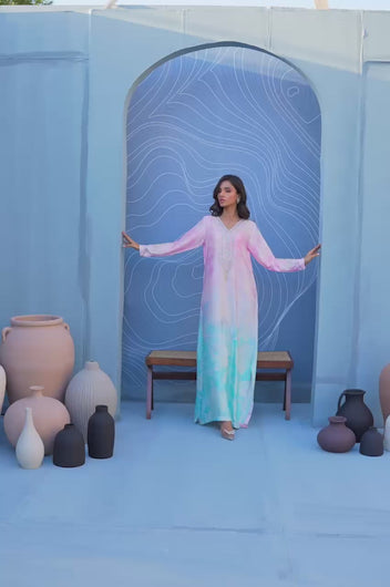 Layali is a beautiful ombre kaftan made in Charmeuse silk. The shade of pink go to the bottom of the shirt and turn into blue. The dress has a detailed neckline with multicolored sequins and sitara. Hand work on the sleeves and cross finishes on the back add to the oomph of the dress.