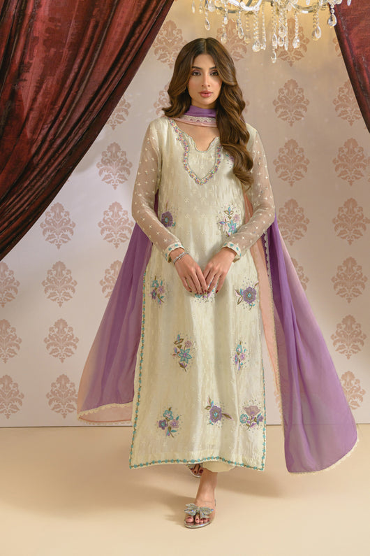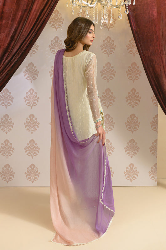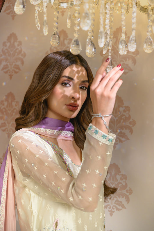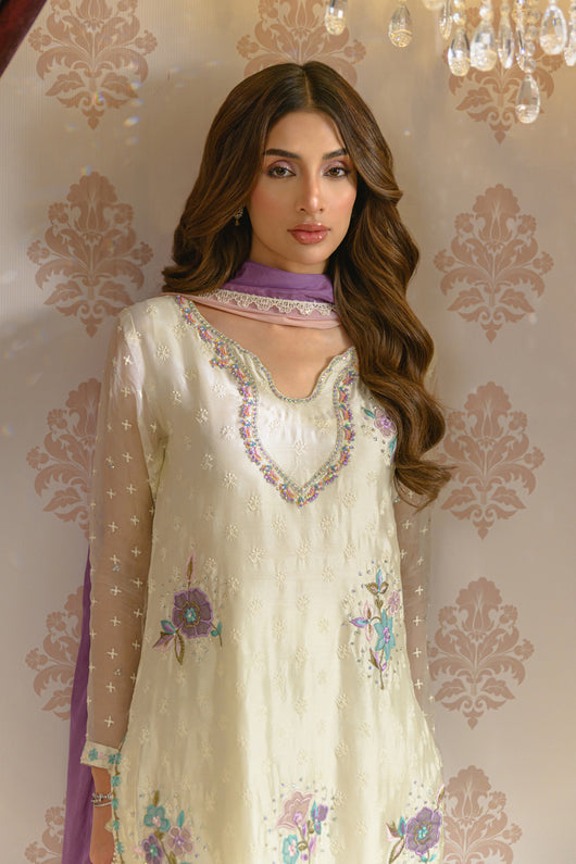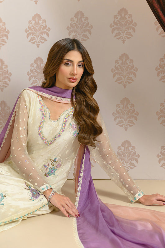 The ultimate cool-girl ensemble. A pristine ivory self-embroidered seesha silk canvas with scattered embroidered floral motifs all across the fabric. These artistic blooms are further elevated with handwork in multi-tones on the neckline to create a blend of texture and colors. Embroidered detailing all through the chak slits and frames of daman, lending a graceful finished look. The outfit is completed with a two-toned dupatta in mauve and peachy pink and lace finishes that run throughout. Comes with a seesha silk pants.