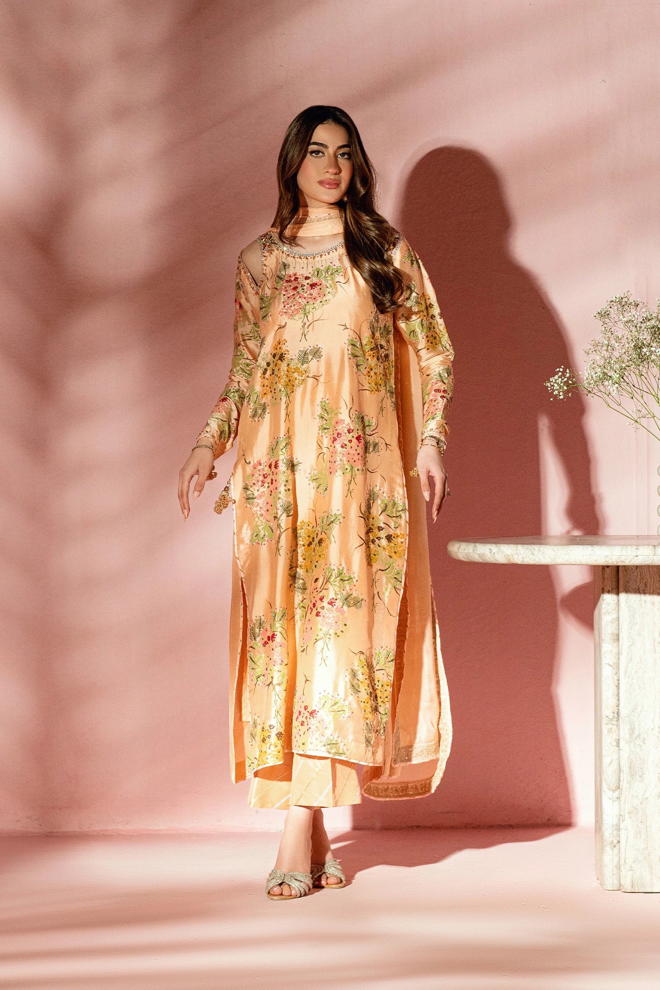 Crafted in luxurious sheesha silk, the shirt features a refined block-printed base highlighted by heavy hand embellishment along the neckline. Cutout detailing and embellished sleeves introduce texture, while soft powder pink accents add gentle contrast. Paired with matching sheesha silk pants and a medium silk dupatta finished with lace-embellished borders, the ensemble feels balanced and carefully composed.