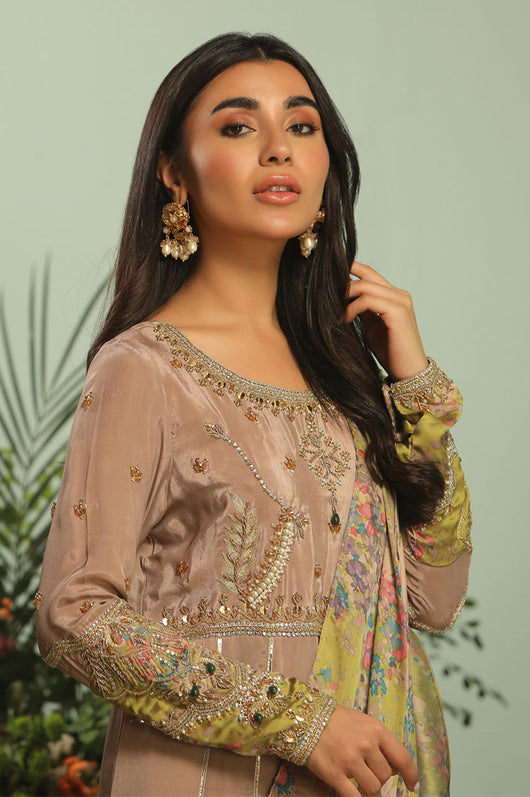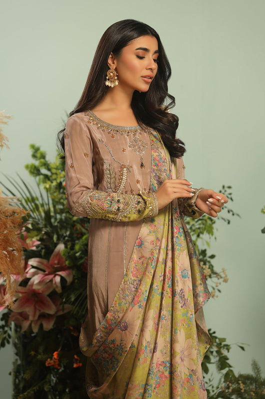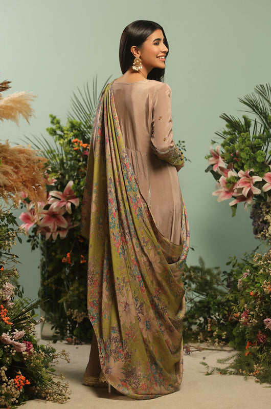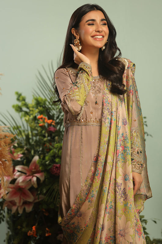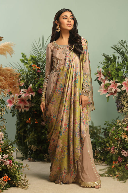 This lilac colored flowy gown is heavily embellished on the body and sleeves. It comes with a drape style dupatta with motifs on the shoulder and accompanied with same colored silk plain pants.