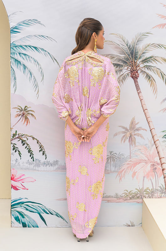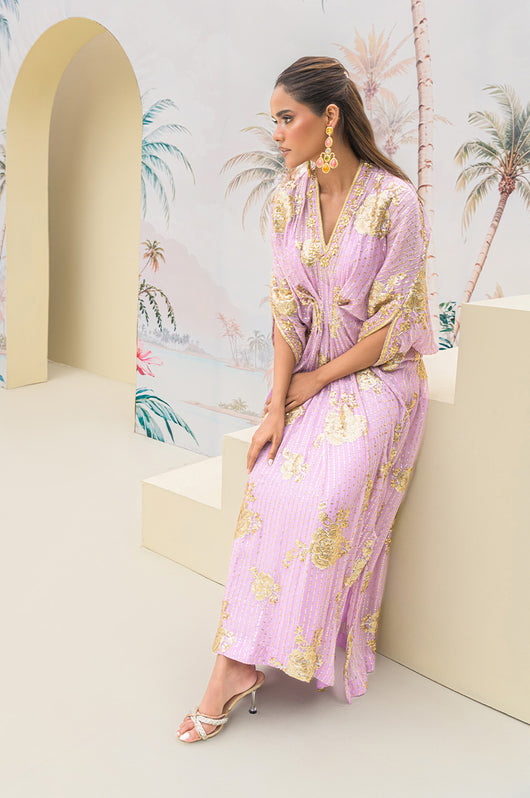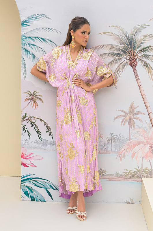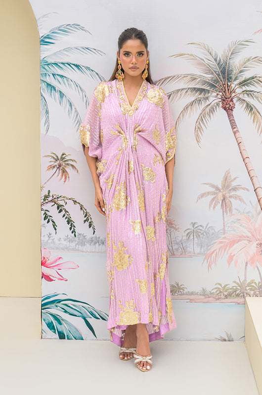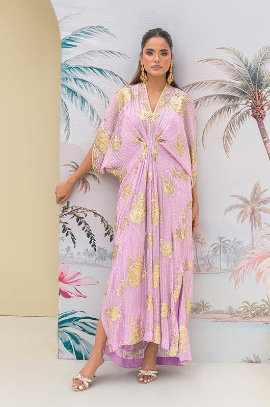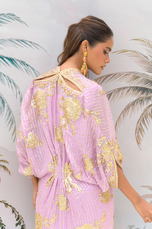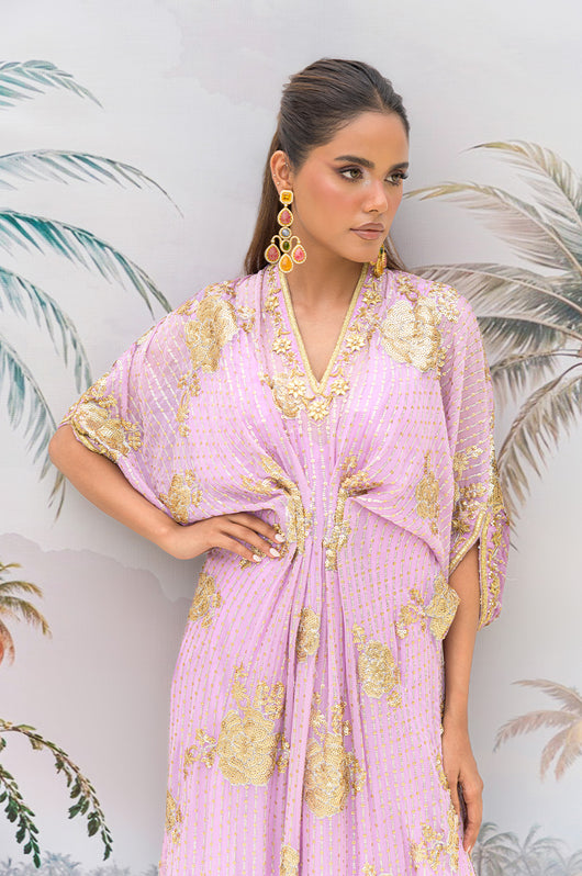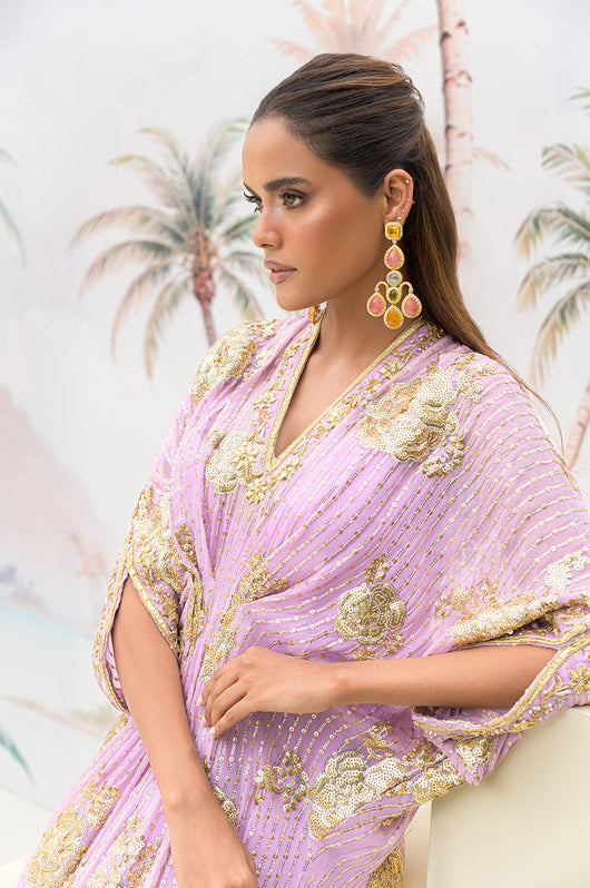 Lilac sorbet is a heavily embellished kaftan made in georgette chiffon with hand work in the front and back of the outfit comes with an inner and pants made in sheesha silk. The handwork is made in gotta, tila, kora and dabka with heavy sequins all throughout.