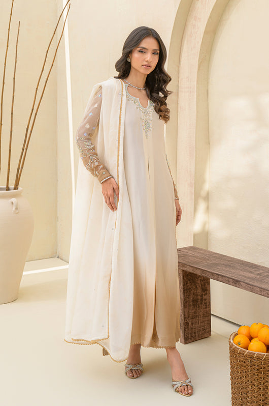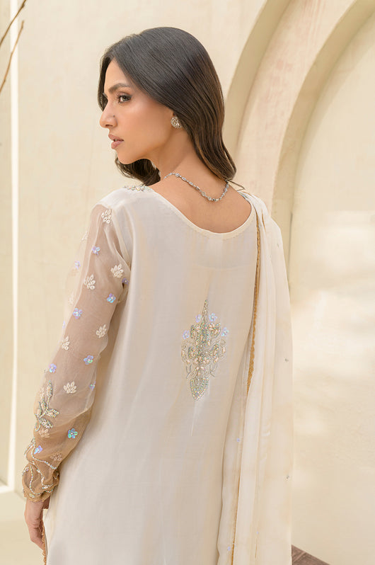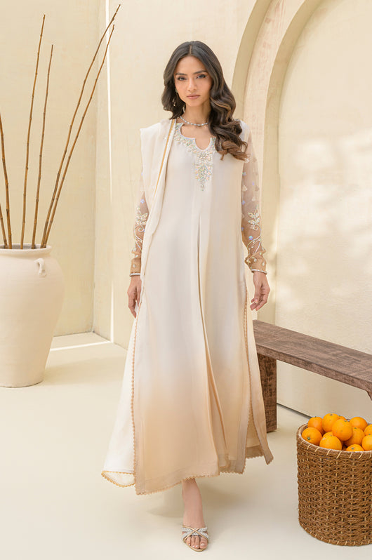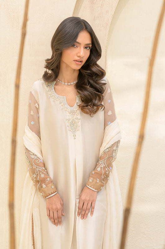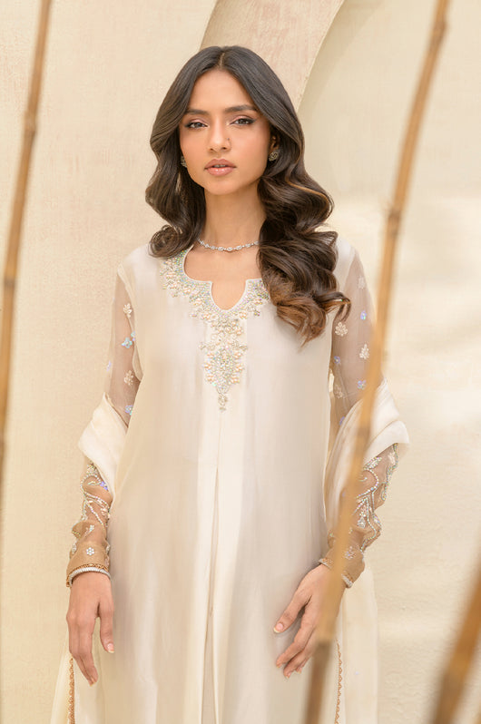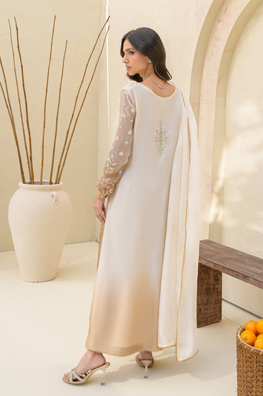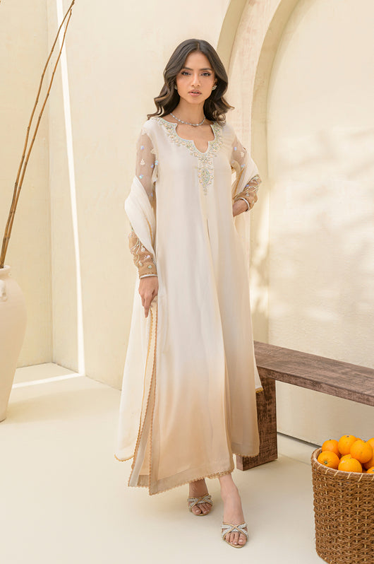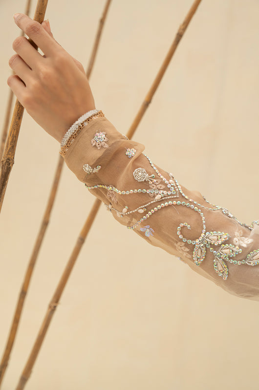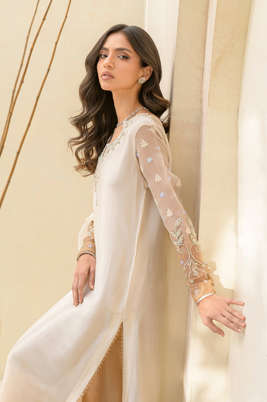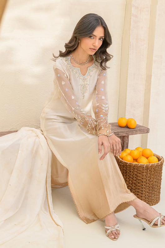 The perfect choice for year-round celebrations. A striking off white sand hued shirt, that seamlessly flows into a whimsical mocha colored hue is cut from shiny shisha/butter silk and features a delicately hand embroidered modern neckline and romantic sleeves. The statement sleeves are cut from embroidered organza shimmering sequins as well. The perfect outfit to see you through brunches, afternoon teas and dinners with effortlessly chic ease. Comes with our silk pants and sparkly marble shaded dupatta for an utterly captivating look.