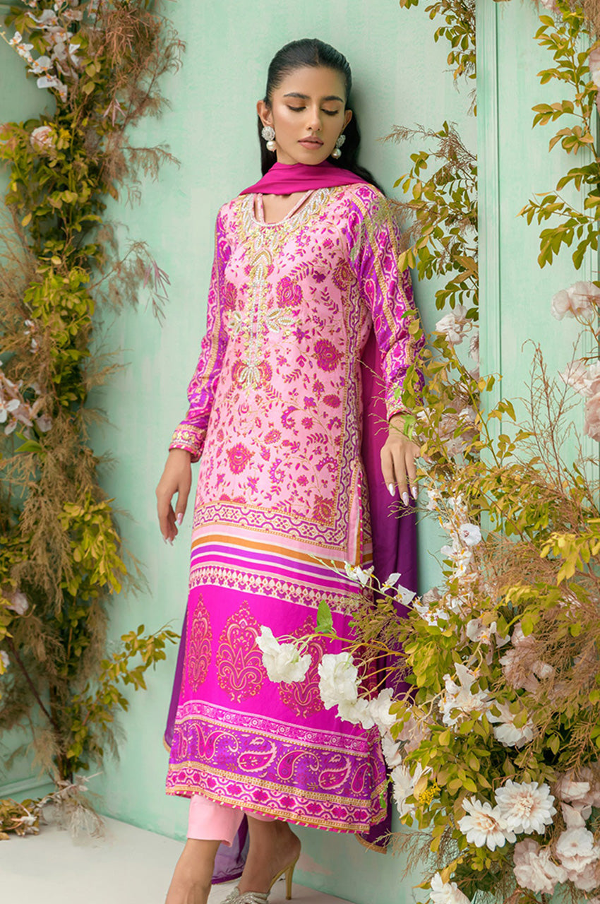 Maani is a digitally printed pure medium silk shirt made in 60 gms fabric. The dress has a pink and purple themed pattern with borders all over the shirt, is made with a stand out neckline with heavily embellished neckline and sleeves, The dress comes with based colored pants an inner and two toned dupatta with golden lace finishes. Length of shirt is 48 inches.