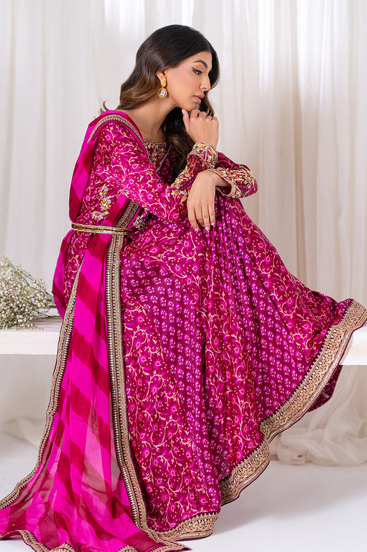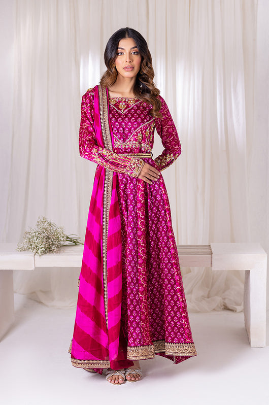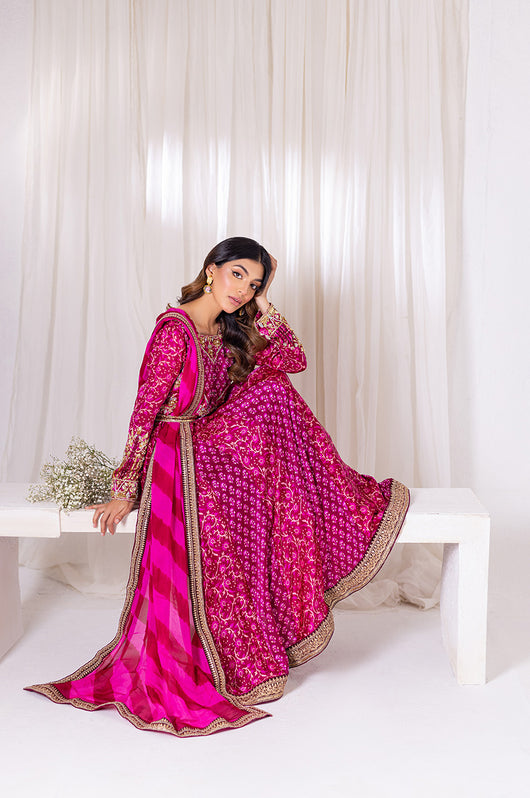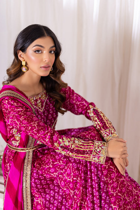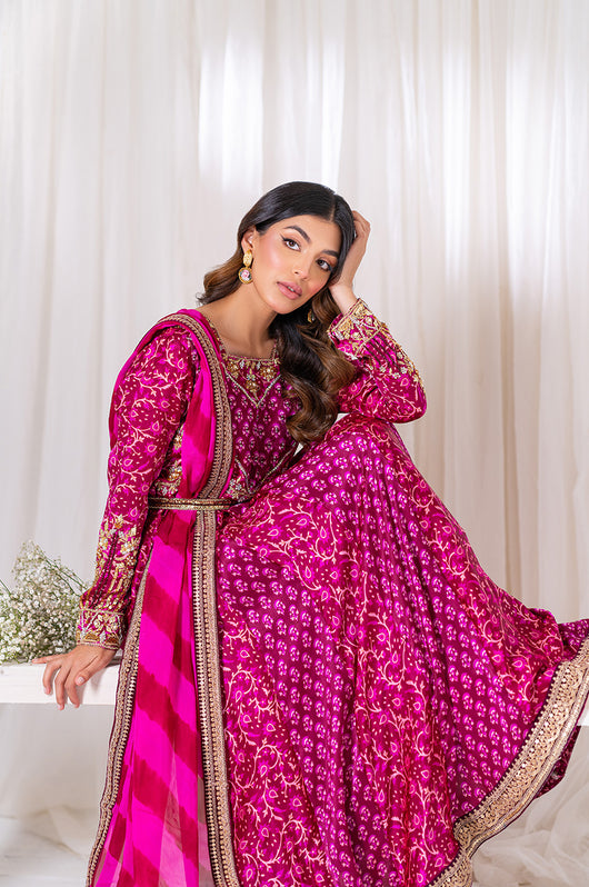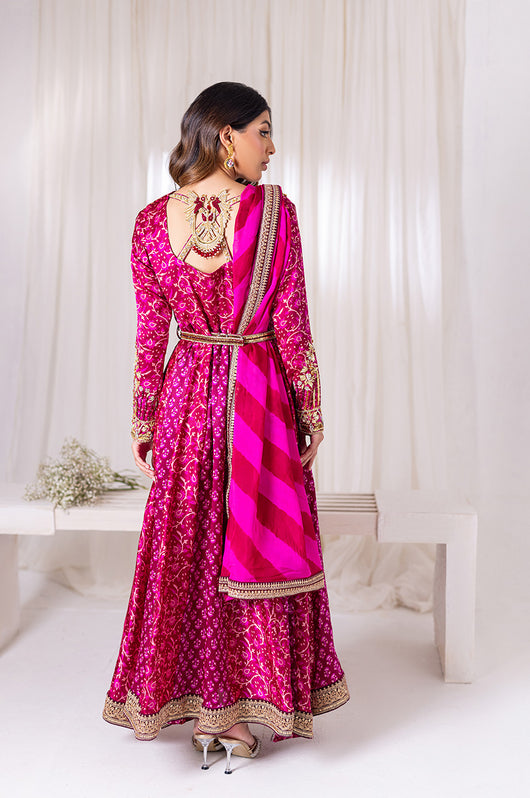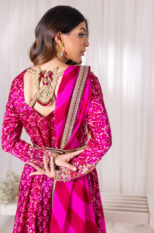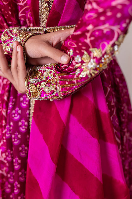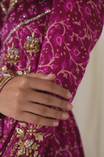 Mahira is a formal heavily embellished pure Charmeuse silk kalidar shirt made in 80 gms with a beautiful pattern all over in mix and match kalis and a lace embellished border at the bottom. The outfit has a heavily embellished body made in falsa and fuschia pink color, the handwork is made in gold, silver along with self falsa colored small stones all over in the sleeves and belt.