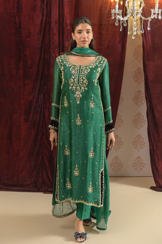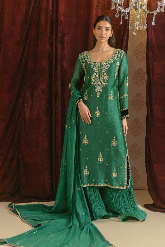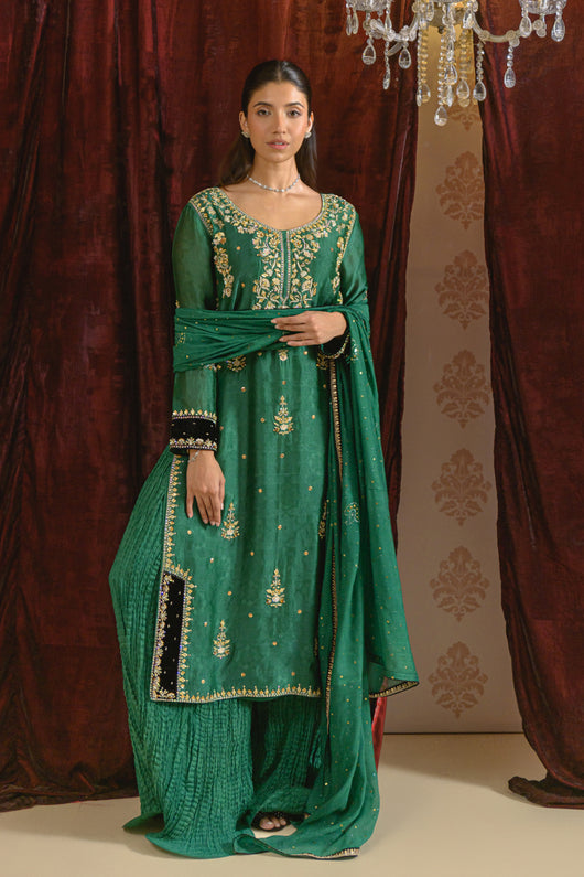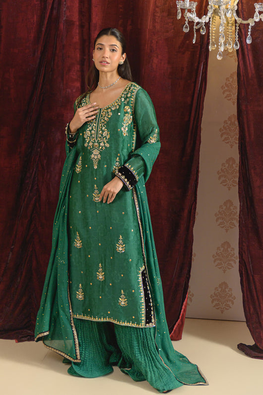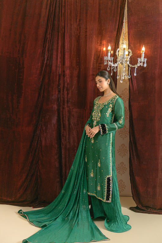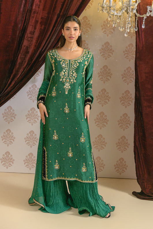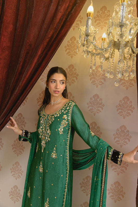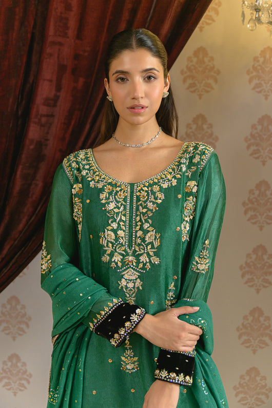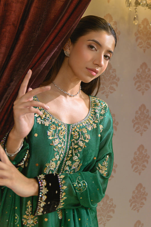 Malina, an emerald green self-patterned seesha silk long shirt with fully embellished front and sleeves, comes with crushed pants. The astonishing assortment of techniques and tiny beads and sequins, along with appliqué of the rich plush, textured velvet, amplifies the exquisite handwork on the monochrome ensemble. The outfit comes with a fully embellished kamdani dupatta in the same emerald color with contrasting lace finishes that run all throughout the 3.25-meter dupatta.