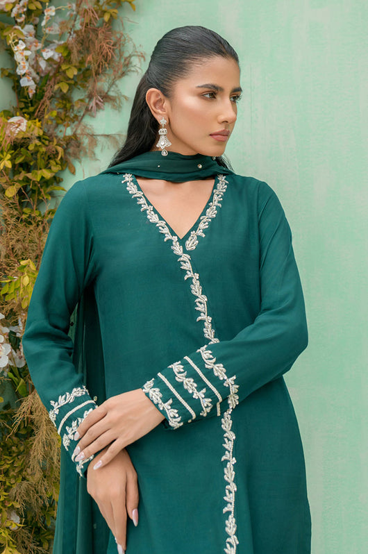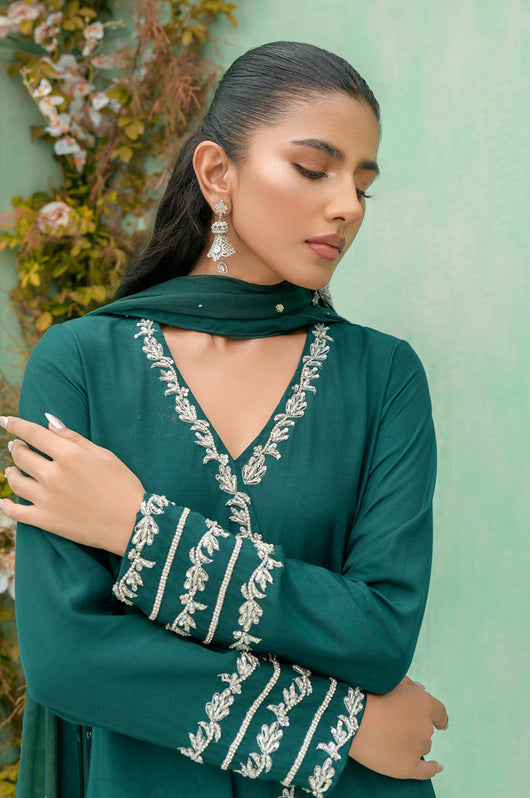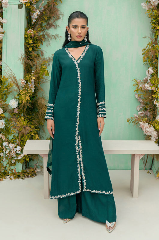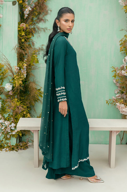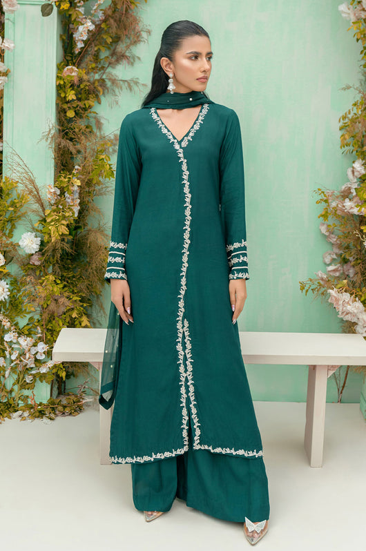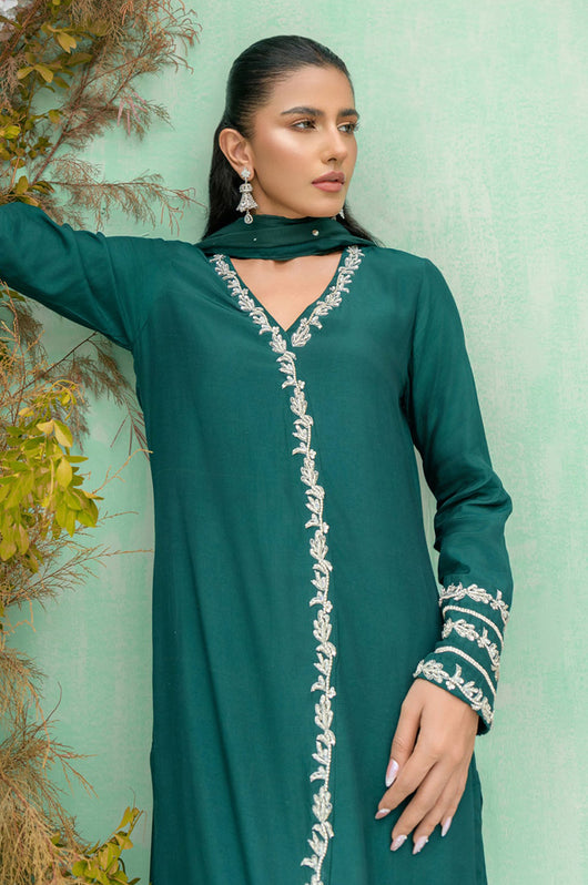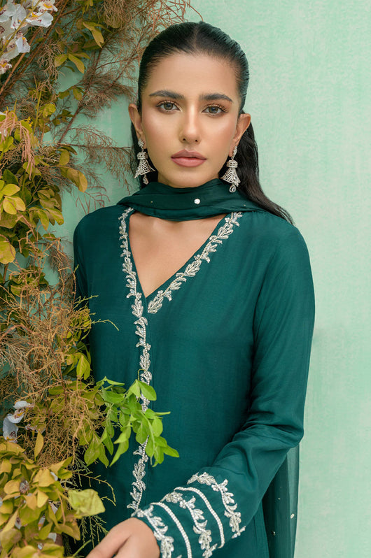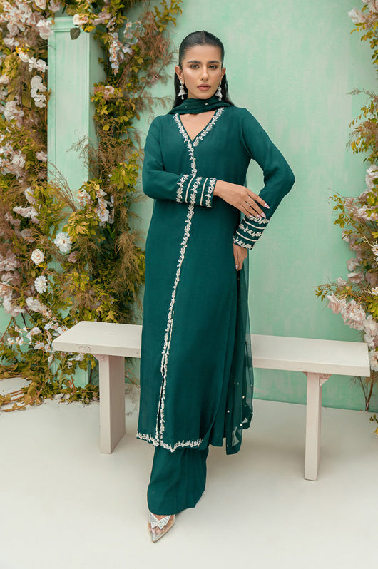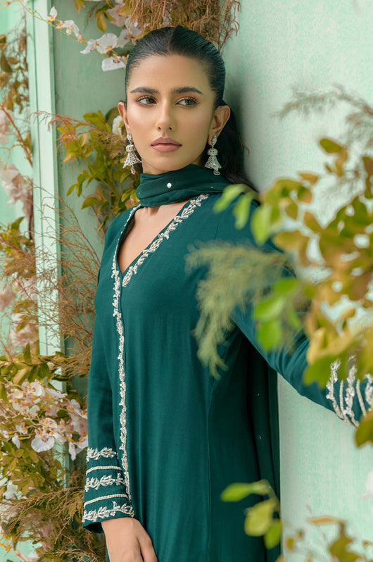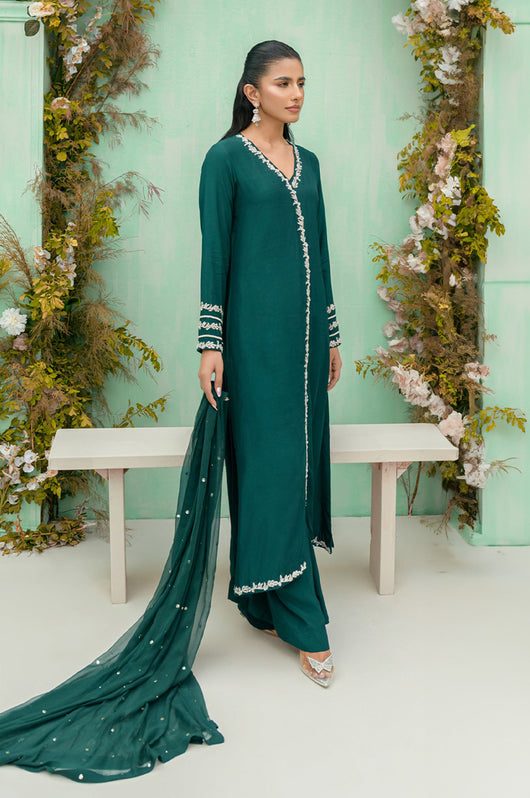 Maneen is a bottle green base made in Rion silk, with silver hand work all over the shirt and sleeves, the shirt is hand embellished with stones and all silver material like pearls, crystals, silver stones and other complimenting materials. The dress comes with a chiffon dupatta with silver mukesh all over finished with the same fabric finishes.