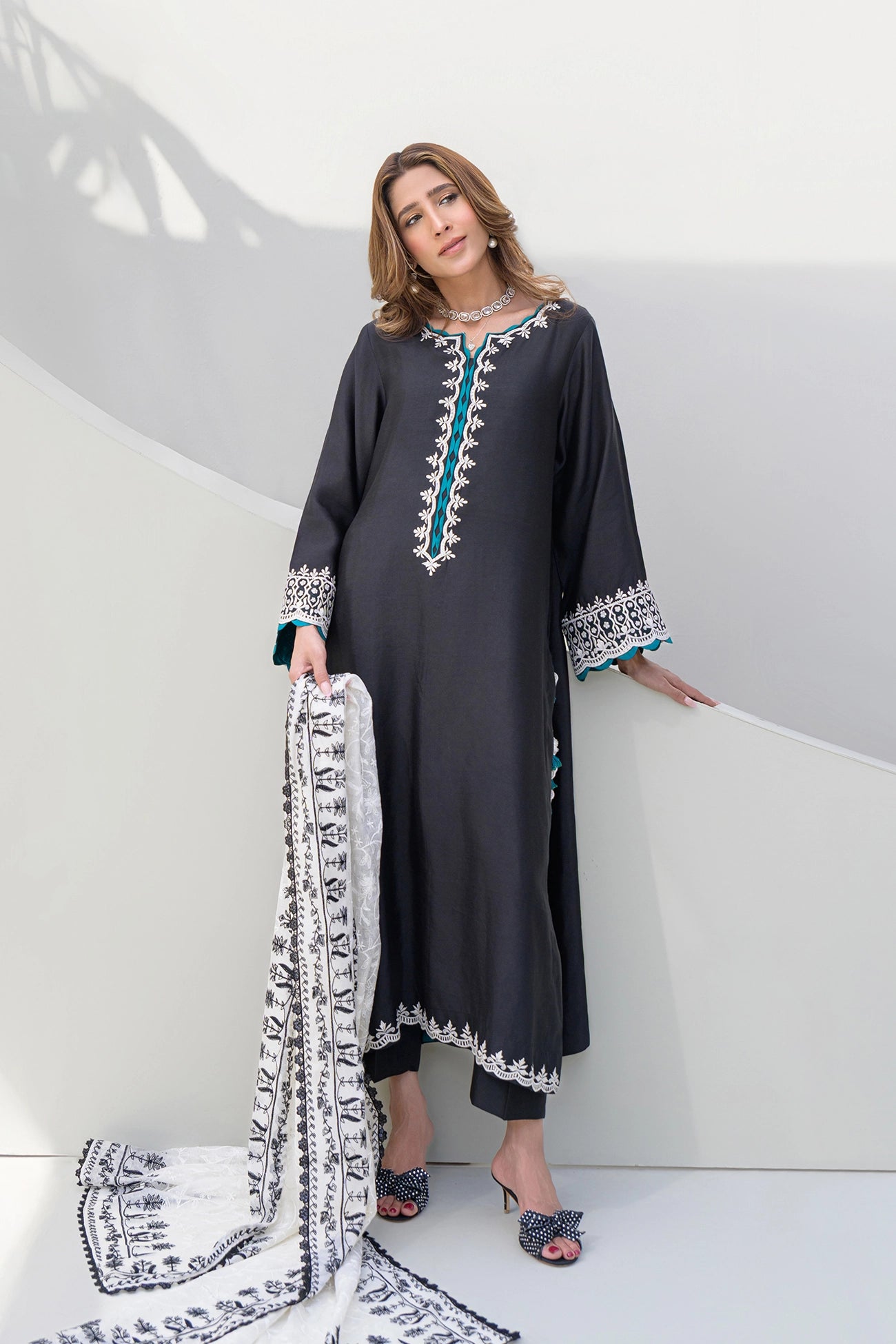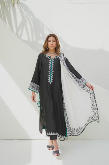 This sophisticated ensemble is crafted from luxurious sheesha silk, offering a fluid drape and elegant sheen. The outfit features intricate white embroidery along the neckline, sleeves, and hem, creating a striking contrast against the deep base color. Subtle pops of emerald green add richness to the design, highlighted further by delicate tassel details on the chak, giving the outfit a graceful and polished finish. Paired with a beautifully crafted white soft khaddi silk dupatta, adorned with fine black embroidery, this look blends traditional charm with contemporary elegance. Perfect for formal dinners, festive evenings, and refined gatherings, this outfit makes a timeless style statement with effortless grace.