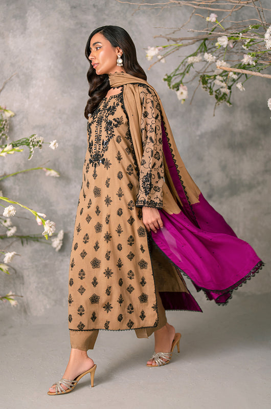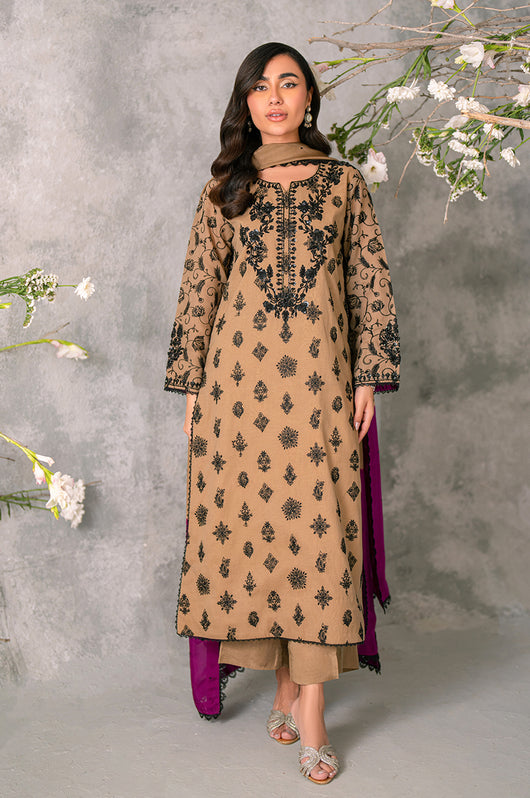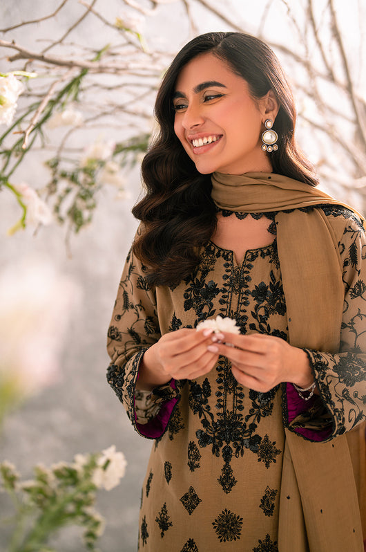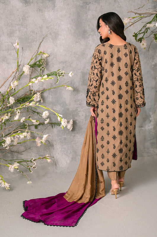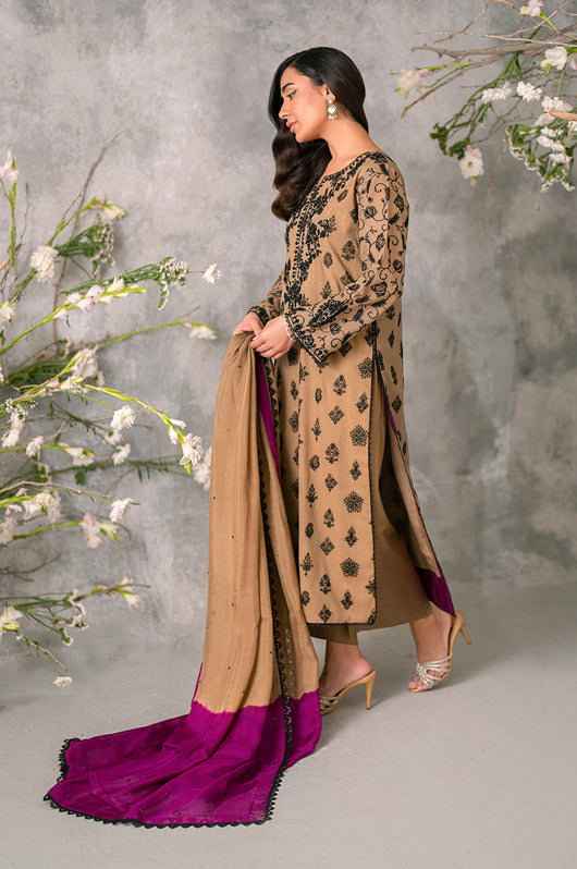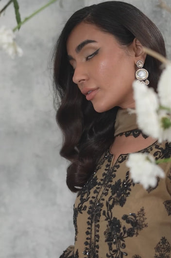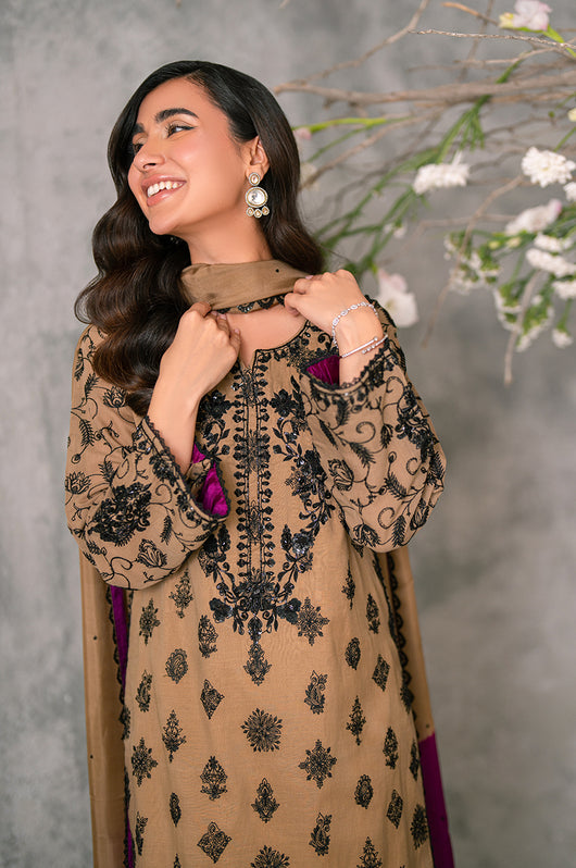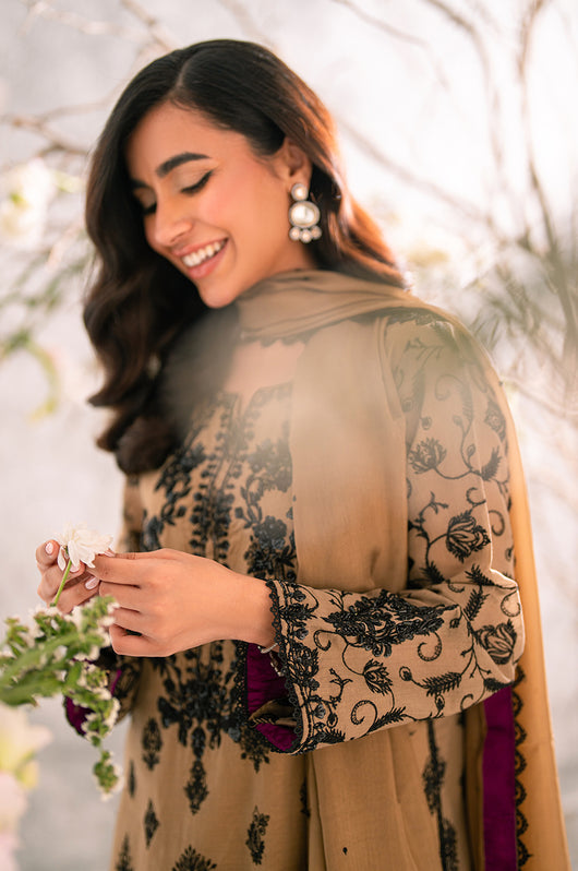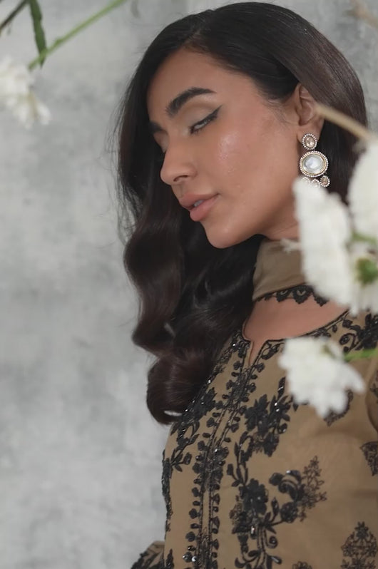 Meryam, is a premium butter silk made in A line structure in Mocha Mousse color (Pantone color of the year 2025). With a heavily embellished neckline and sleeves all made in black material the dress comes in shades of dark purple contrast. The shirt is lined on the finished edges in purple all over the inner shirt and sleeves. This three piece outfit comes in culotte pants in mocha mousse color and a two toned dupatta with black chan and lace finishes all over.