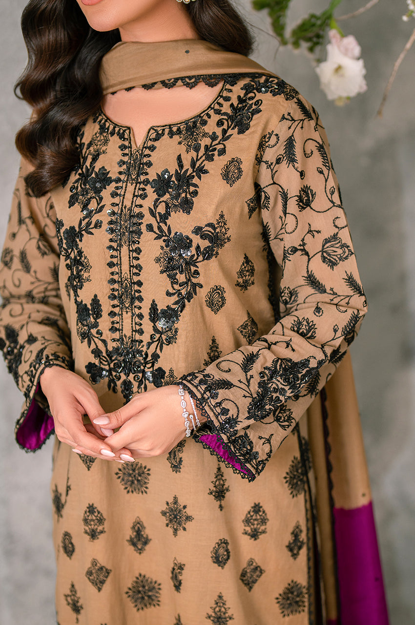 Meryam, is a premium butter silk made in A line structure in Mocha Mousse color (Pantone color of the year 2025). With a heavily embellished neckline and sleeves all made in black material the dress comes in shades of dark purple contrast. The shirt is lined on the finished edges in purple all over the inner shirt and sleeves. This three piece outfit comes in culotte pants in mocha mousse color and a two toned dupatta with black chan and lace finishes all over.