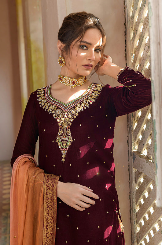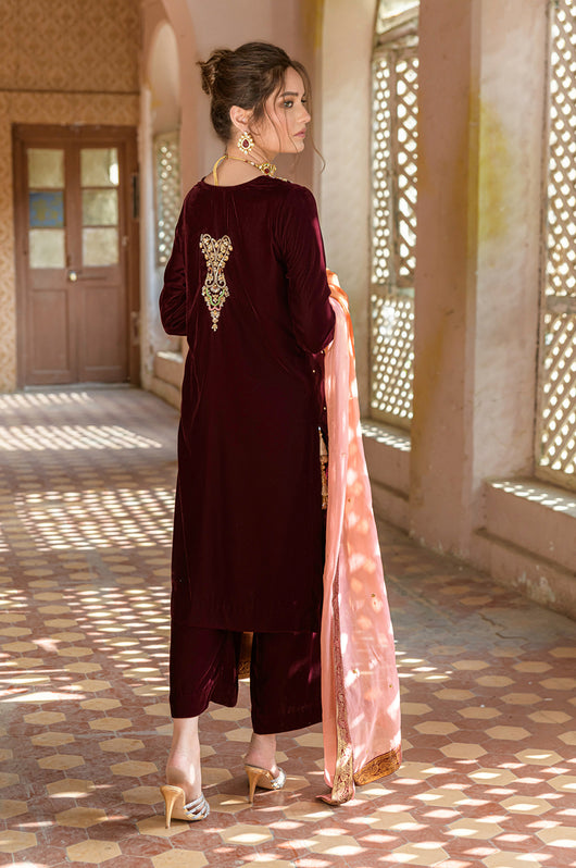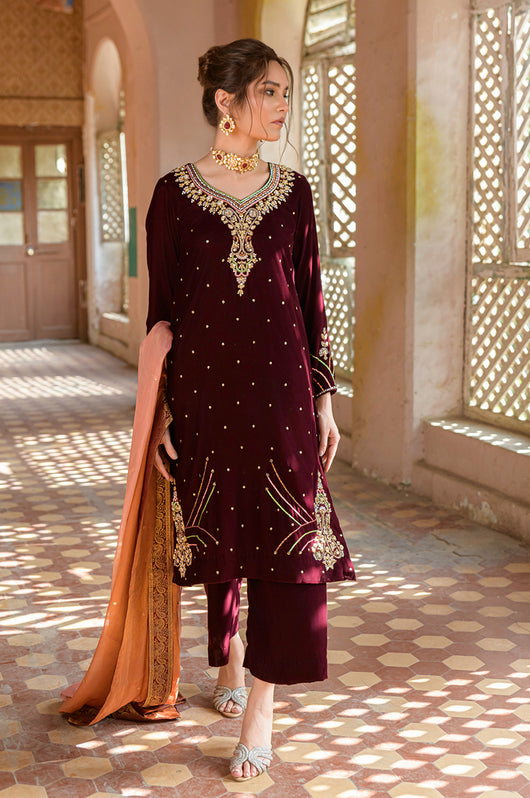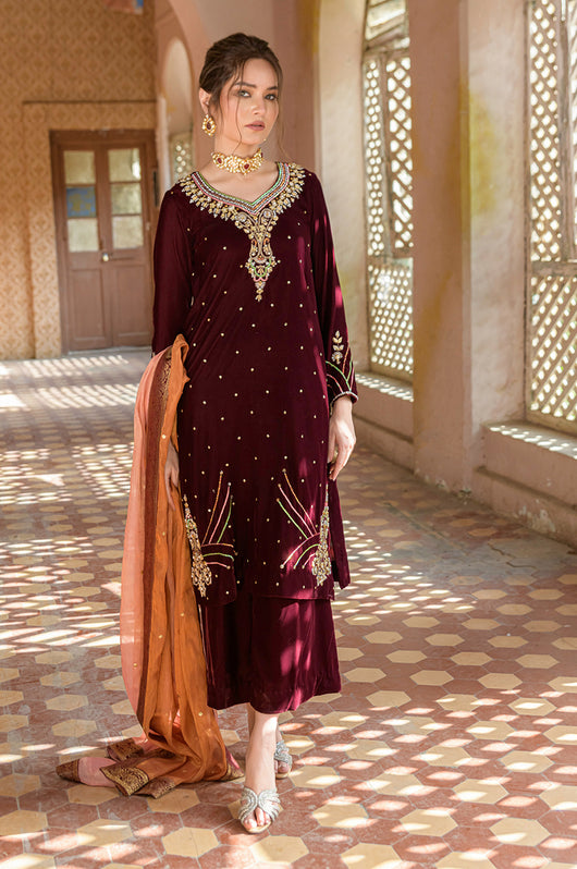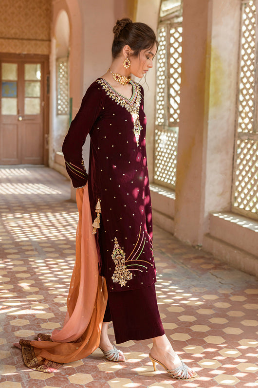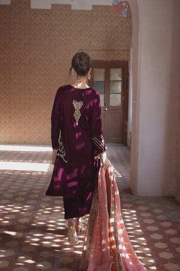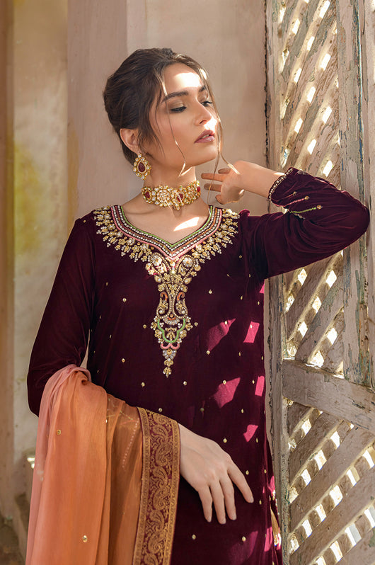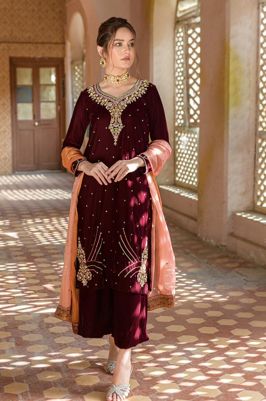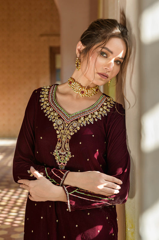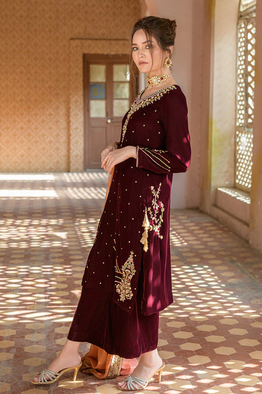 Maroon velvet dress with heavily embellished neckline and sleeves with contrasting notes of pink and peachy hues. There are motifs on the back and a side motif on the back as well. The dress comes with two toned mysori chiffon dupatta with jamawar finishes. Signature RZT gold tassels on the chak of the shirt. The length of the shirt is 42 inches and can be customized according to your requirements.
