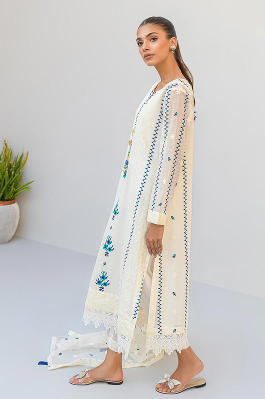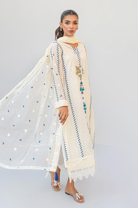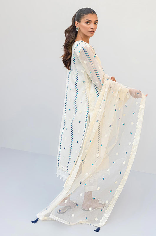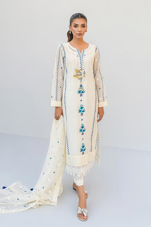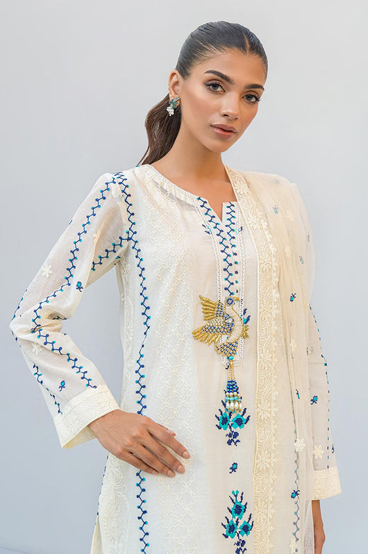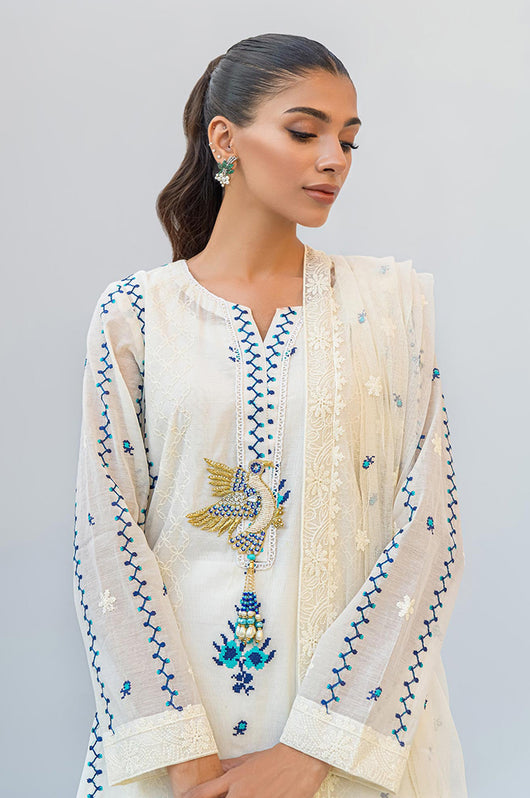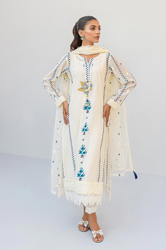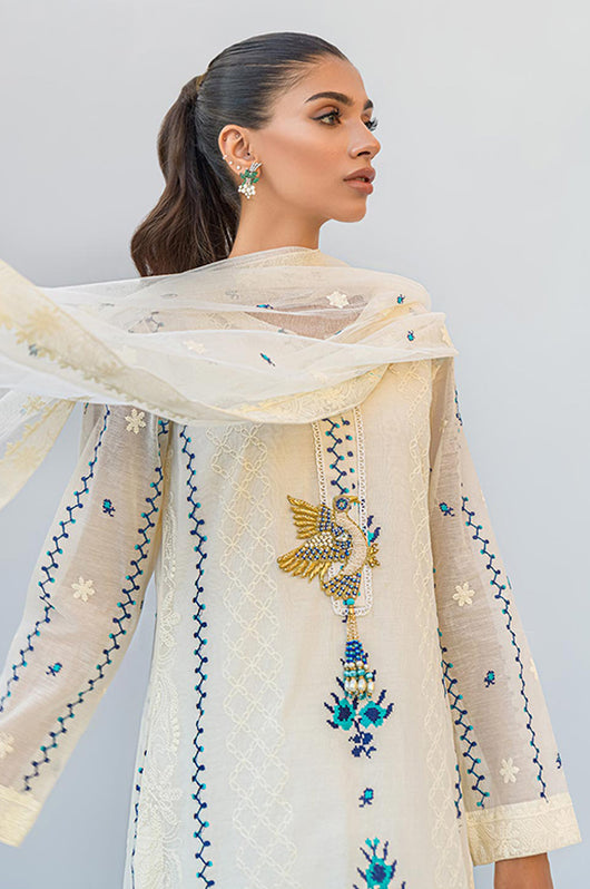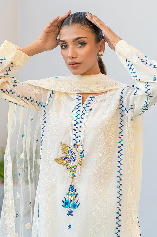 A classic white chikankari swiss voile shirt with cross stitch detailed embroidery in shades of firozi and dark blue composed with a geometrical neckline and a handwork motif with tassel detail to add to the outfit. Comes with straight ivory colored pants and an embroidered dupatta with tassel details.