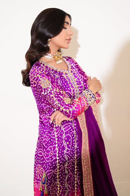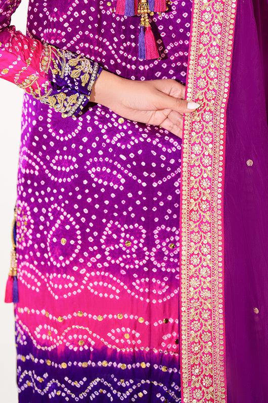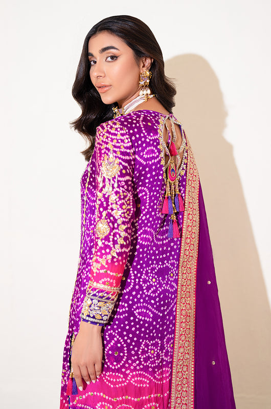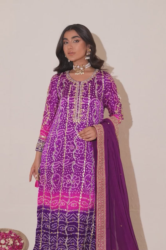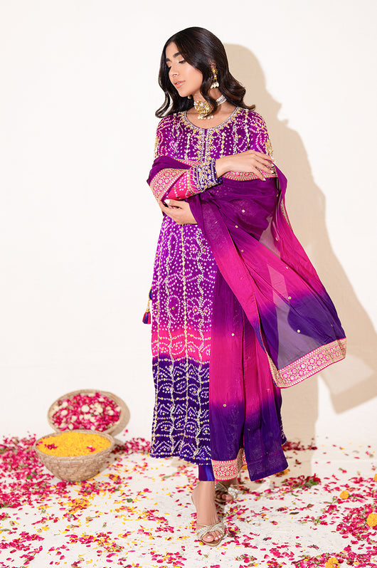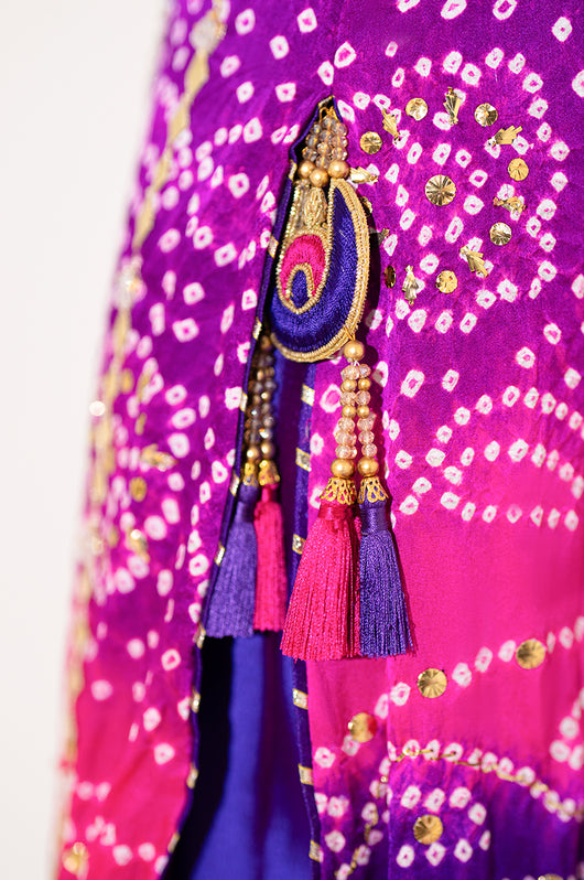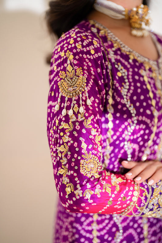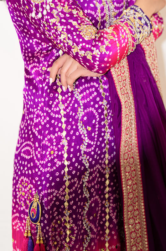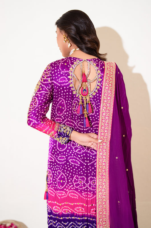 Naushi is a three toned chunri made in pure Charmeuse silk with kamdani work all over which is later handworked on the adda with kora, dabka, gotta, zardoze and other materials. The dress has a detailed back neckline with tassel details along with mukesh/kamdani work all over the back. The side chaks have tassel details on both sides with 10 inches chand bali shaped motifs with hanging colored resham tassels which add oomph to the outfit. The look is completed with a three toned dupatta with chan and bouti all over the dupatta with deep pink colored contrast borders. Comes with Charmeuse silk pants. The length of the shirt is 49 inches, kindly mention in additional notes in case of customization of length.