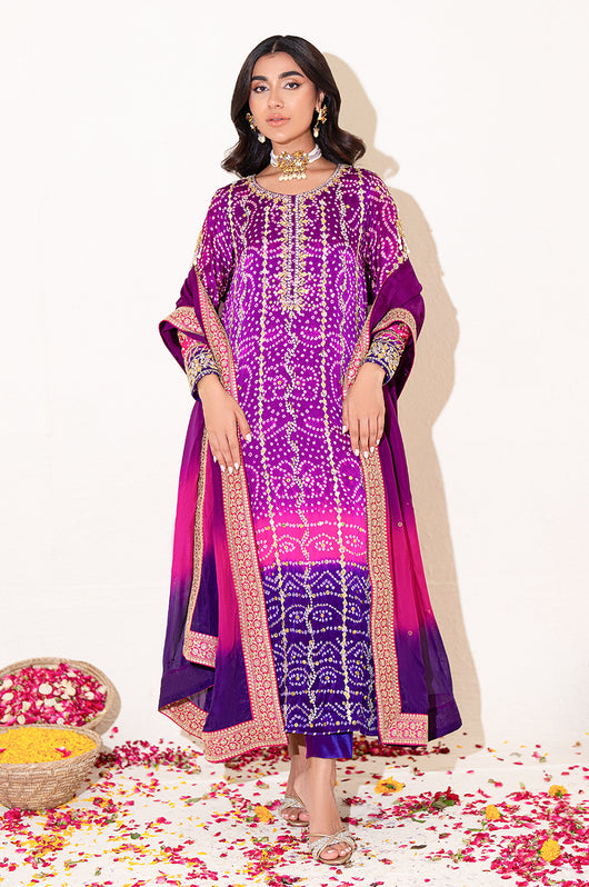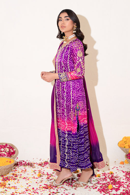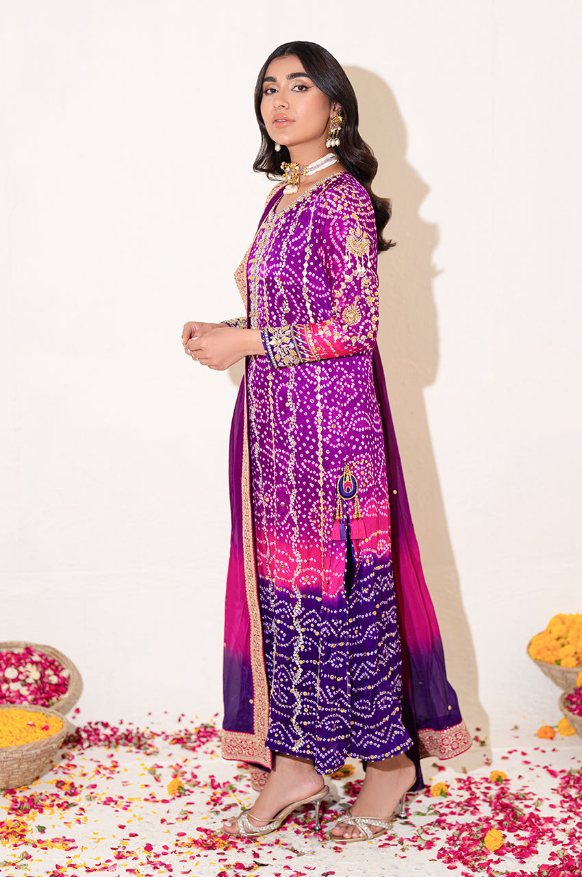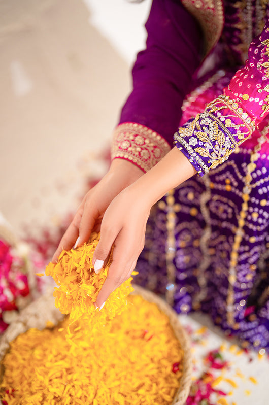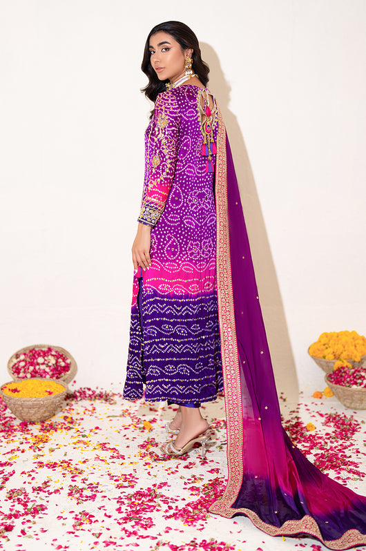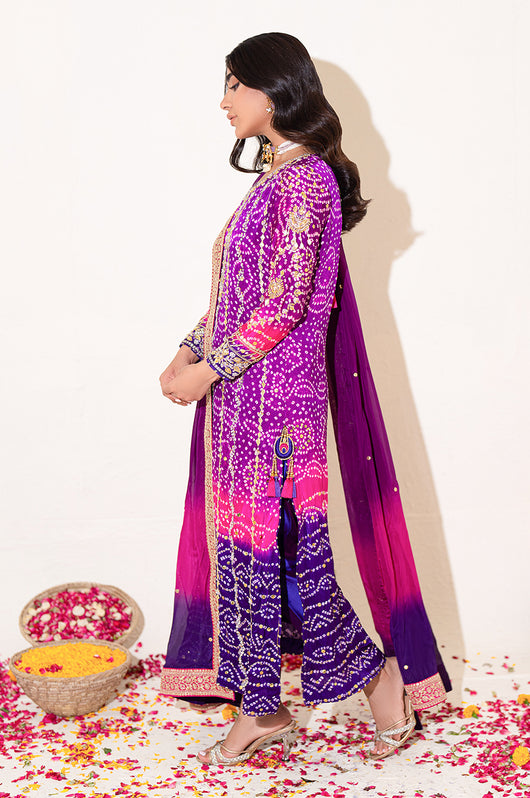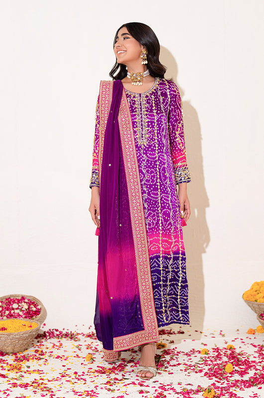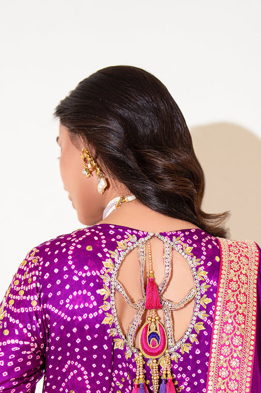 Naushi is a three toned chunri made in pure Charmeuse silk with kamdani work all over which is later handworked on the adda with kora, dabka, gotta, zardoze and other materials. The dress has a detailed back neckline with tassel details along with mukesh/kamdani work all over the back. The side chaks have tassel details on both sides with 10 inches chand bali shaped motifs with hanging colored resham tassels which add oomph to the outfit. The look is completed with a three toned dupatta with chan and bouti all over the dupatta with deep pink colored contrast borders. Comes with Charmeuse silk pants. The length of the shirt is 49 inches, kindly mention in additional notes in case of customization of length.