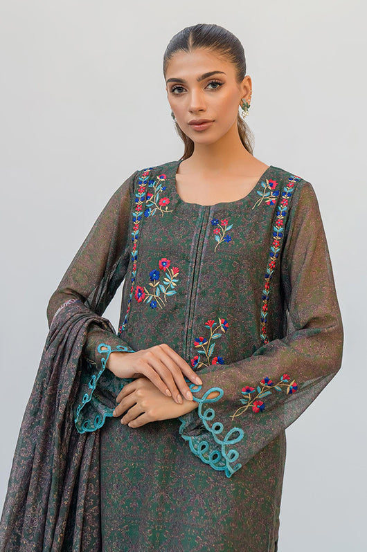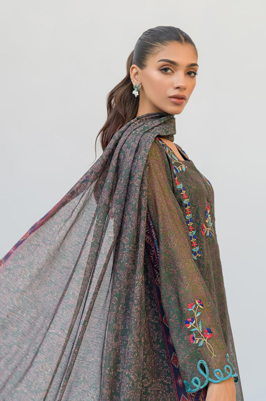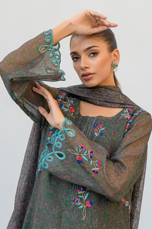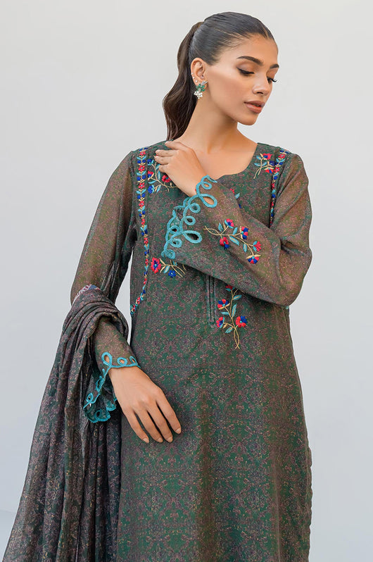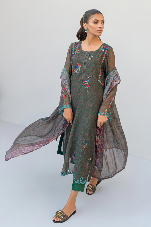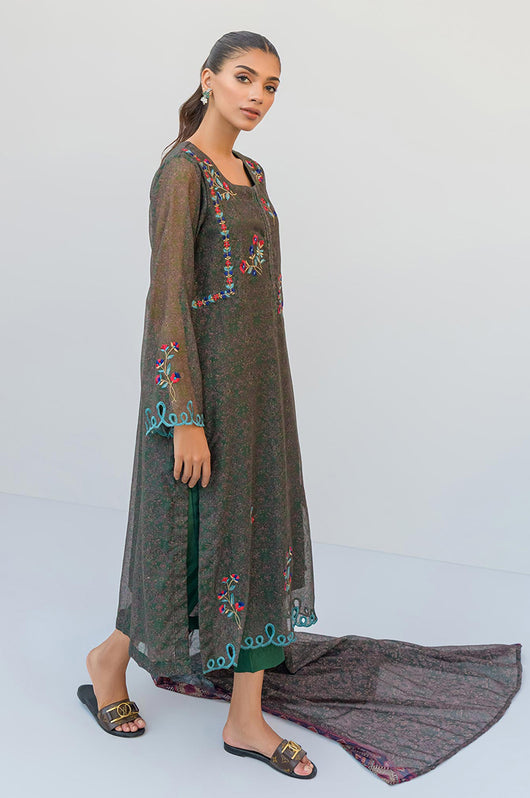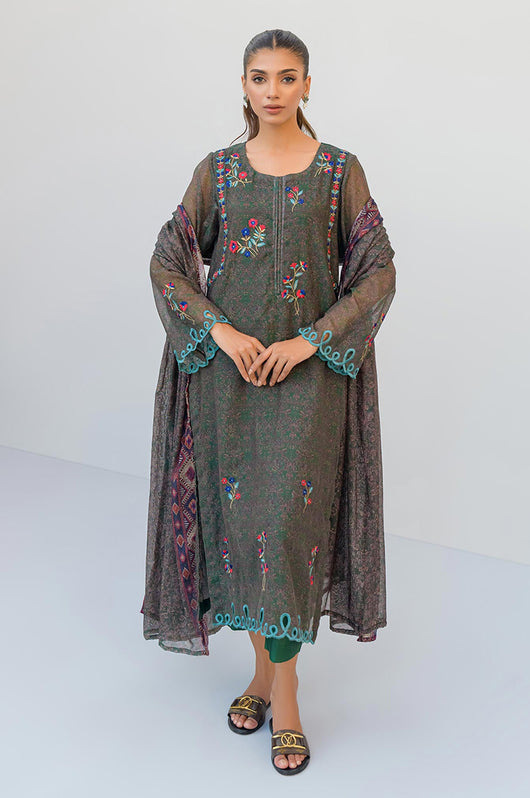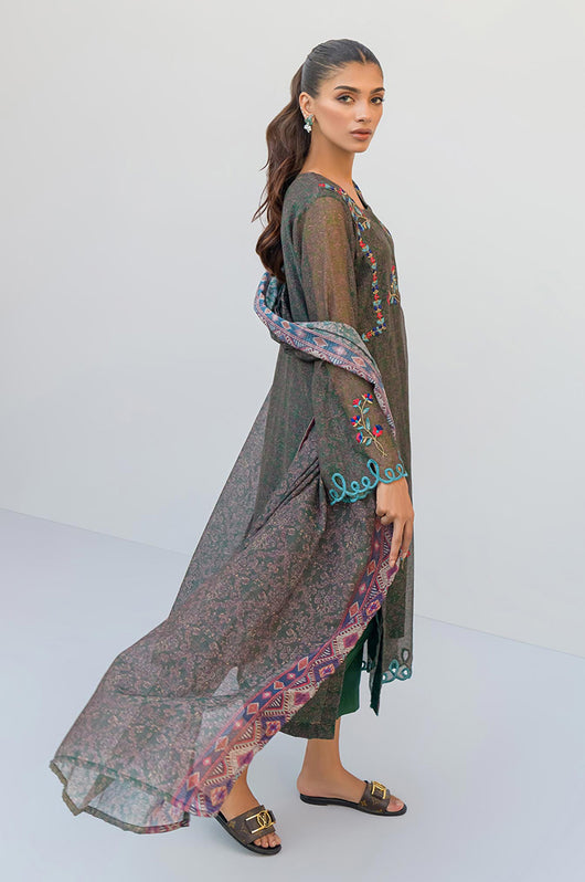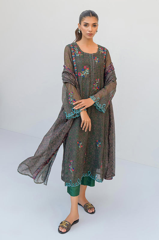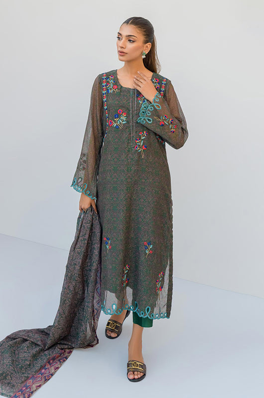 A classic dark colored print on the cotton net is beautifully composed of floral imagery combined with the forest feel. This shirt has multicolored embroidered detailing along the neckline and sleeves with embroidered borders all throughout the shirt. Paired with cotton net printed dupatta and our classic silk trousers.