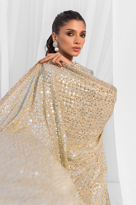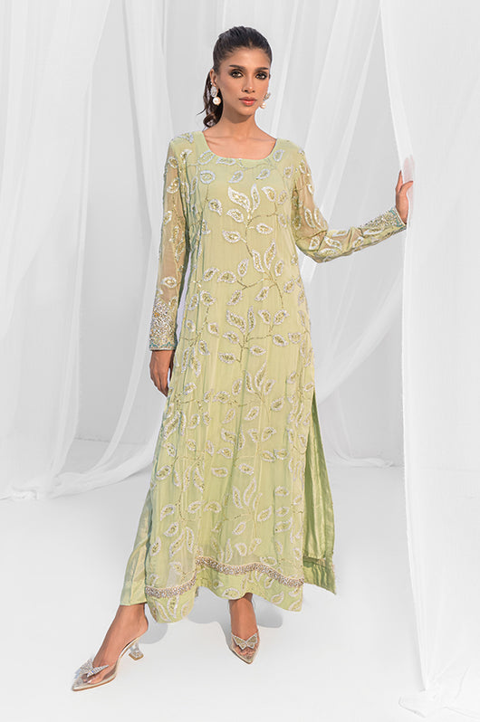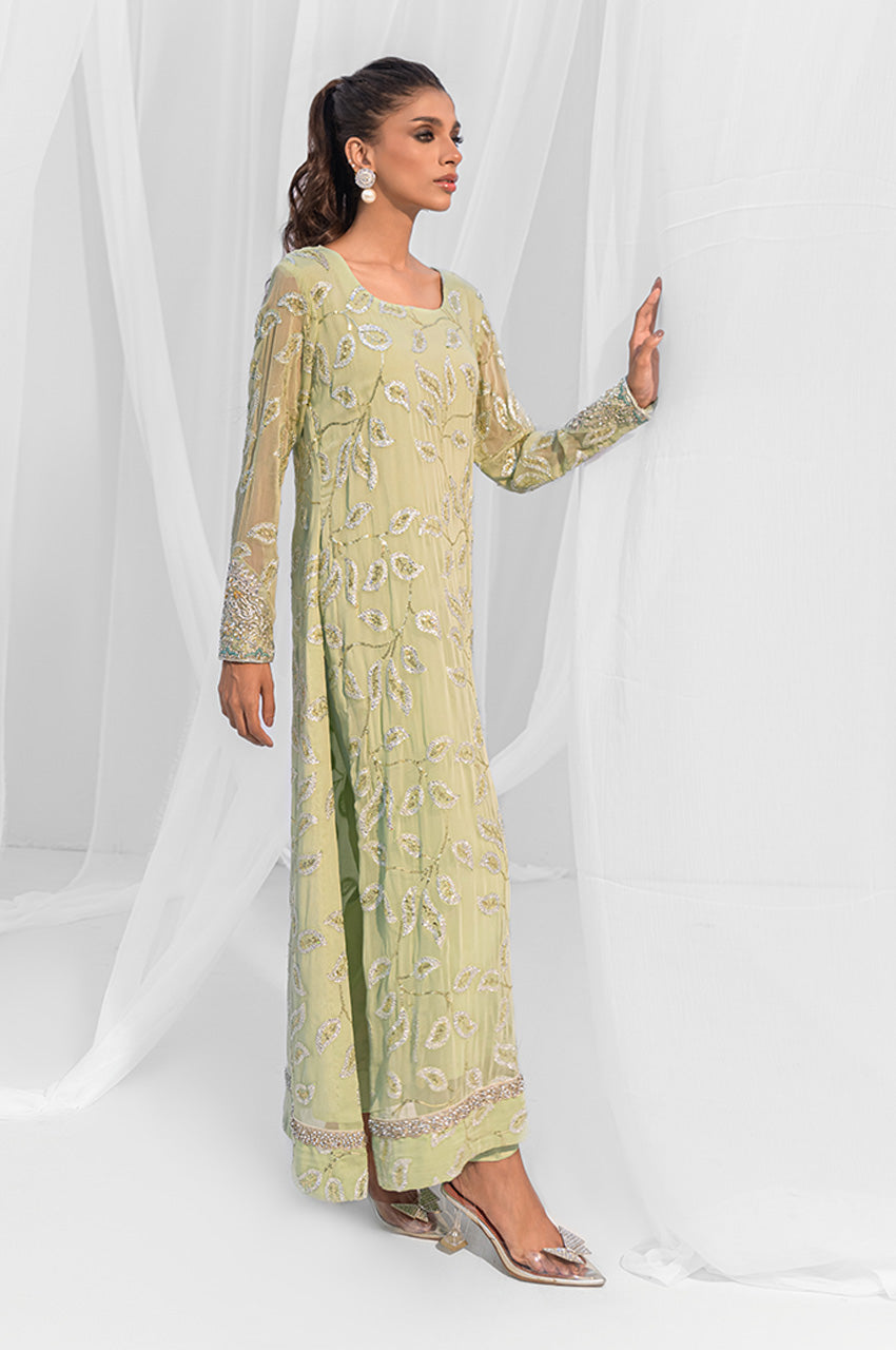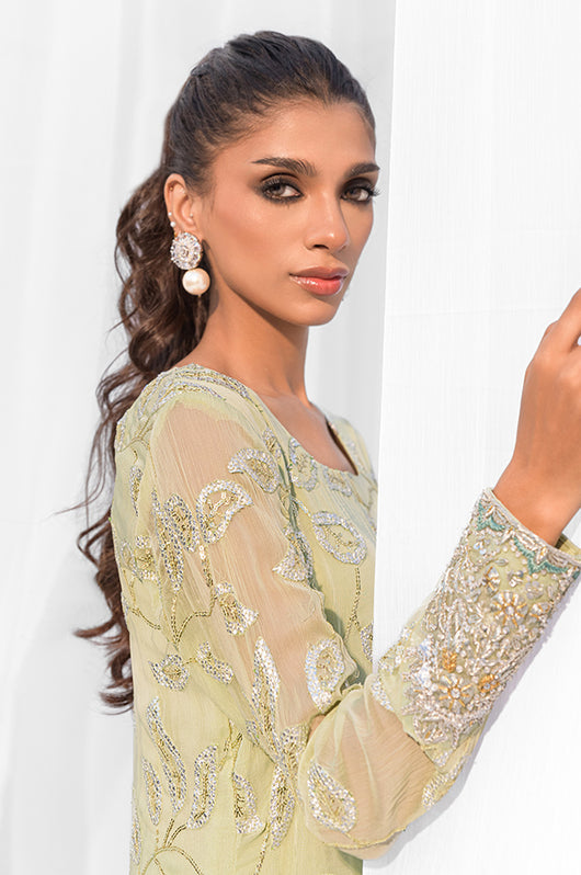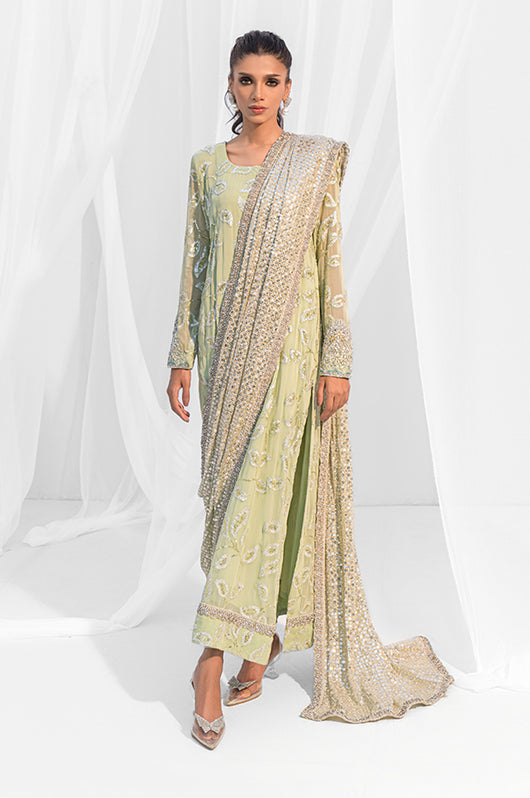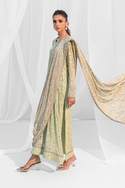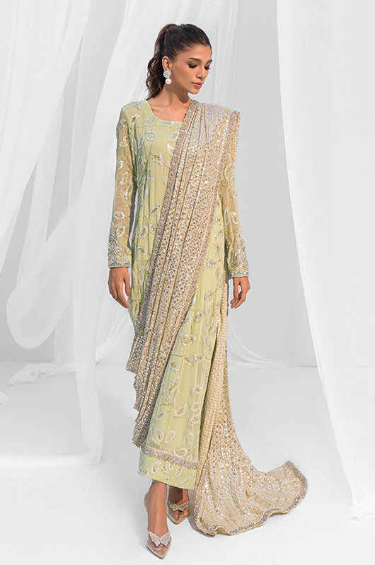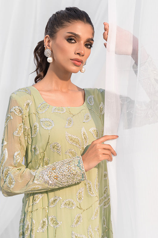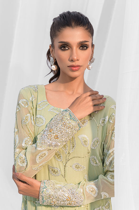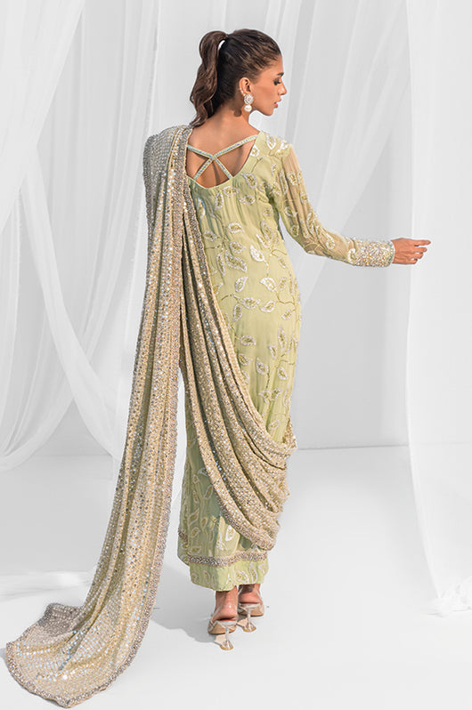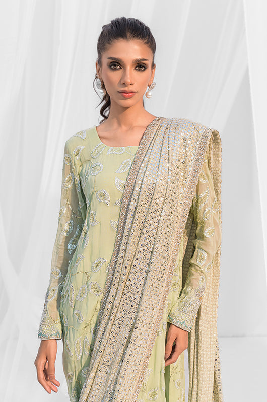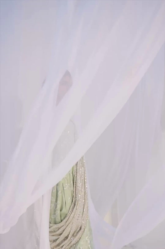 Nehr is a beautiful mint green colored chiffon georgette shirt made in gotta motifs and embroidery all over. The pattern is hand made delicately and comes with care instructions. The dupatta is detachable and is in a contrasting color of grey silver with handwork borders all over the dupatta. It’s supposed to be worn like a sash on the shoulder in the middle or on one side. The handwork finishes are on the daman of the shirt as well and all handwork made in kora dabka and zardoze on the sleeves as well. The back has our signature design details hand worked as well. Comes with straight green pants. Length of the shirt 49 inches. Length customizations are available by mentioning in additional notes section when placing the order.