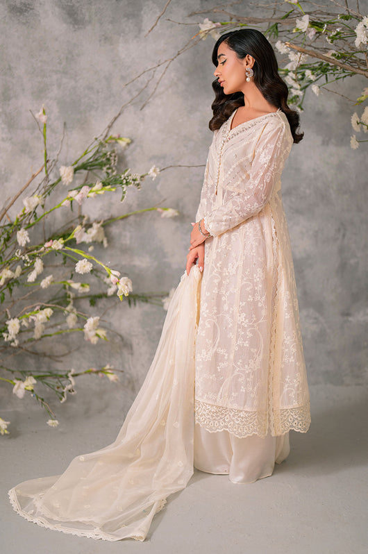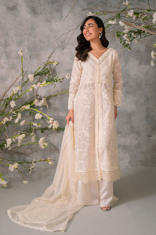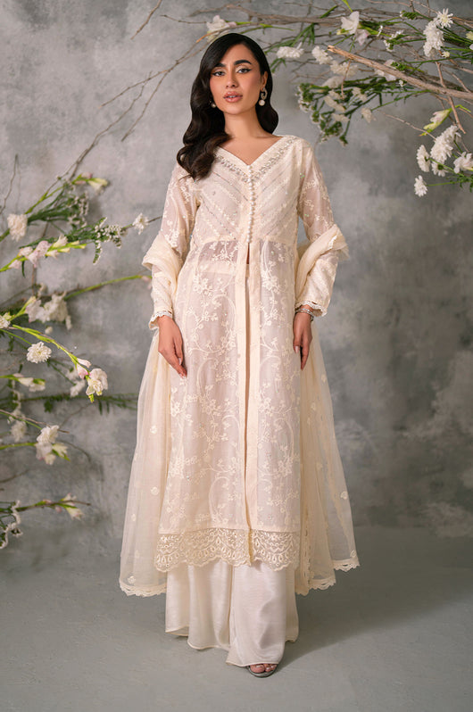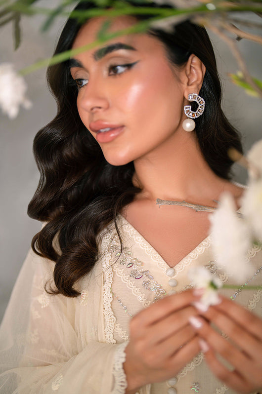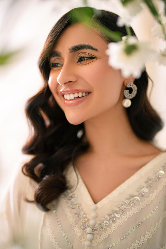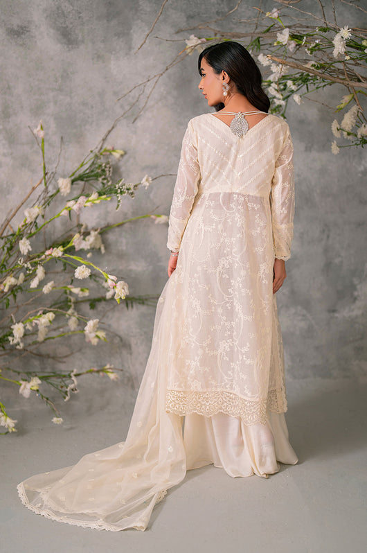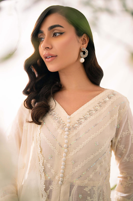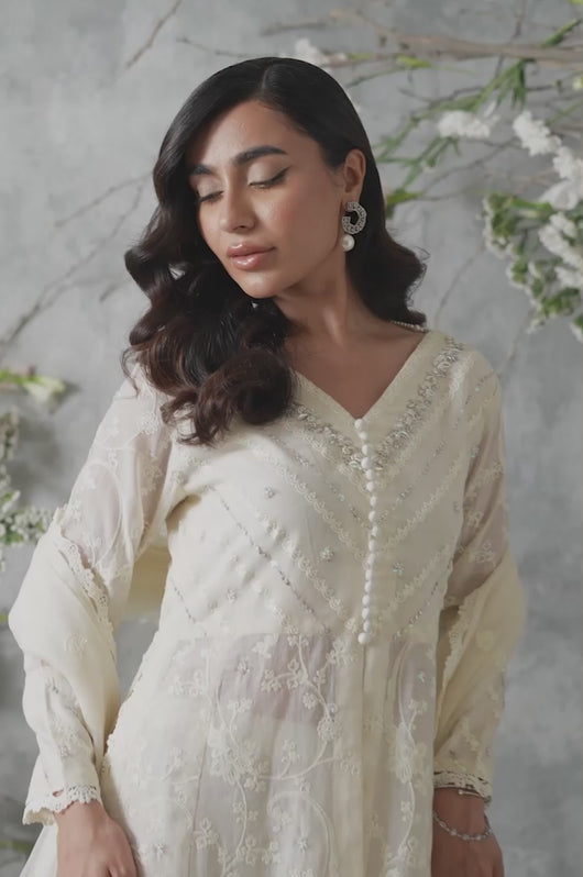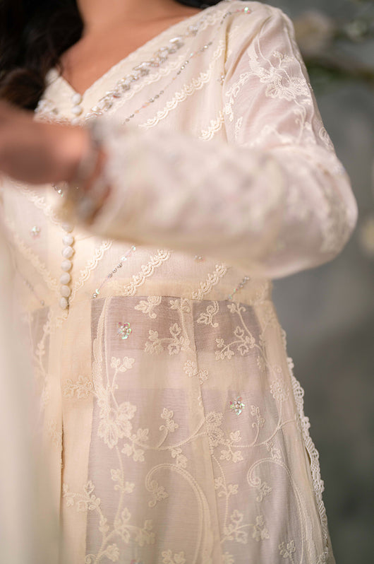 Nora is a premium swiss voile kalidar with full open slides with lace details. The body is lightly embellished in the same colored material with premium sitara, kora, dabka all over. The back has a motif with handwork and pearl details. The dress comes with khadi net dupatta with sitara chan and lace finishes along with flared silk pants to complete the look.