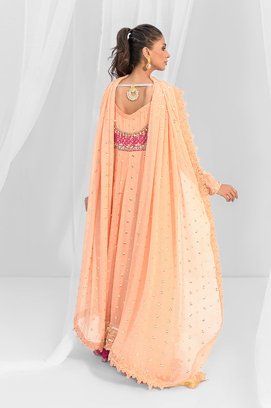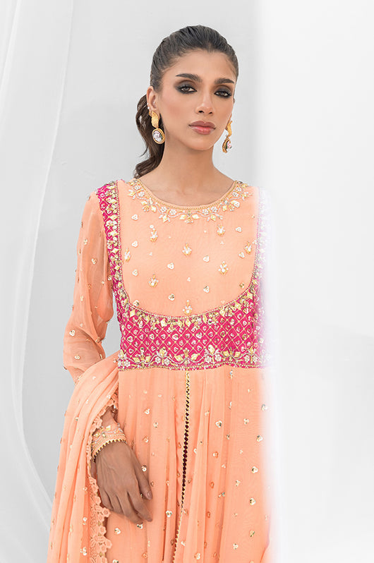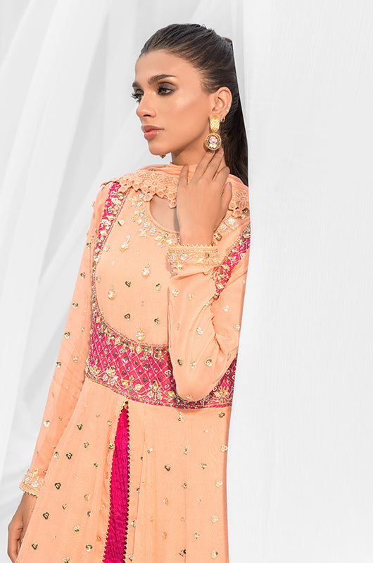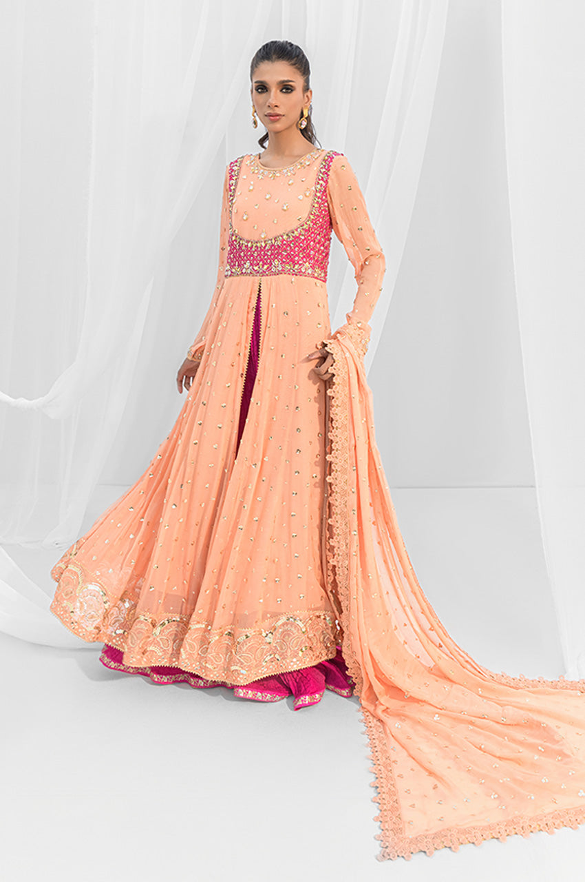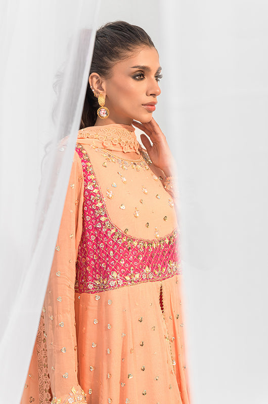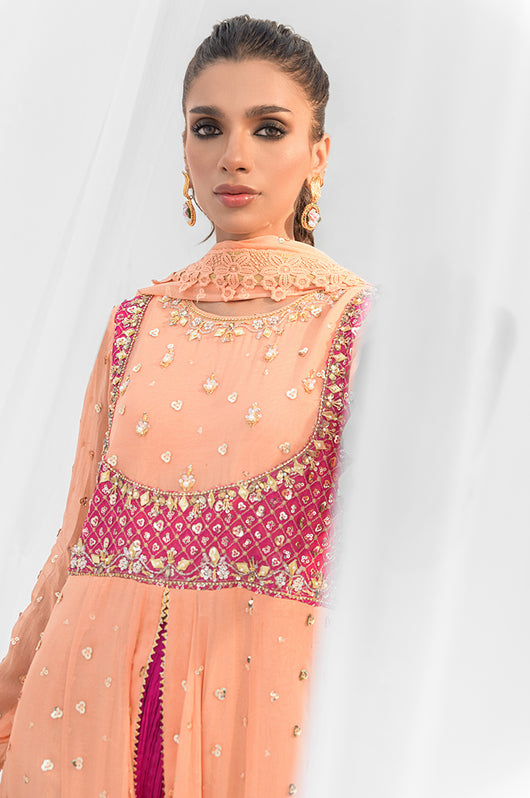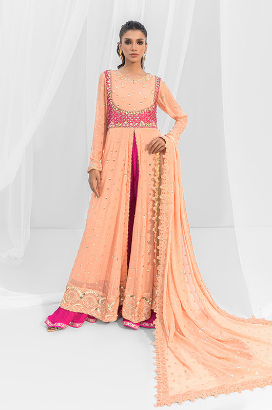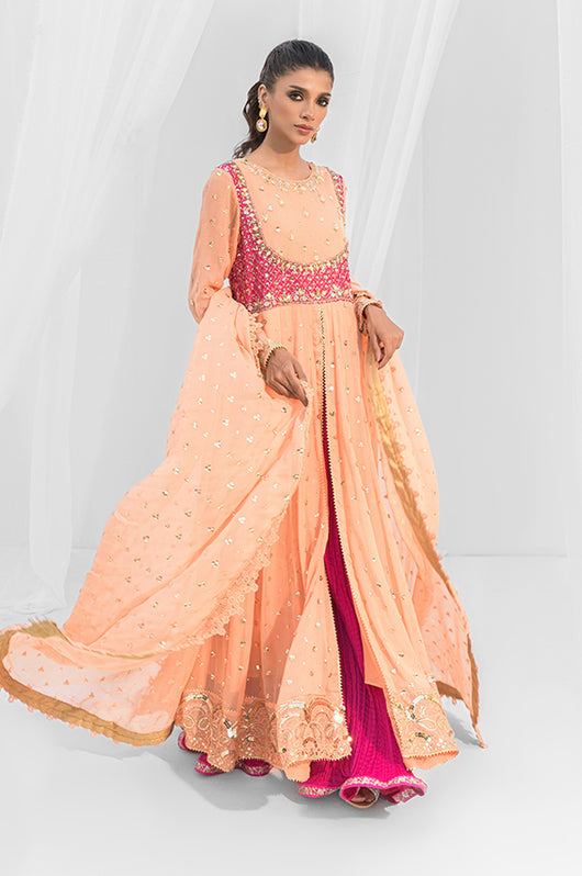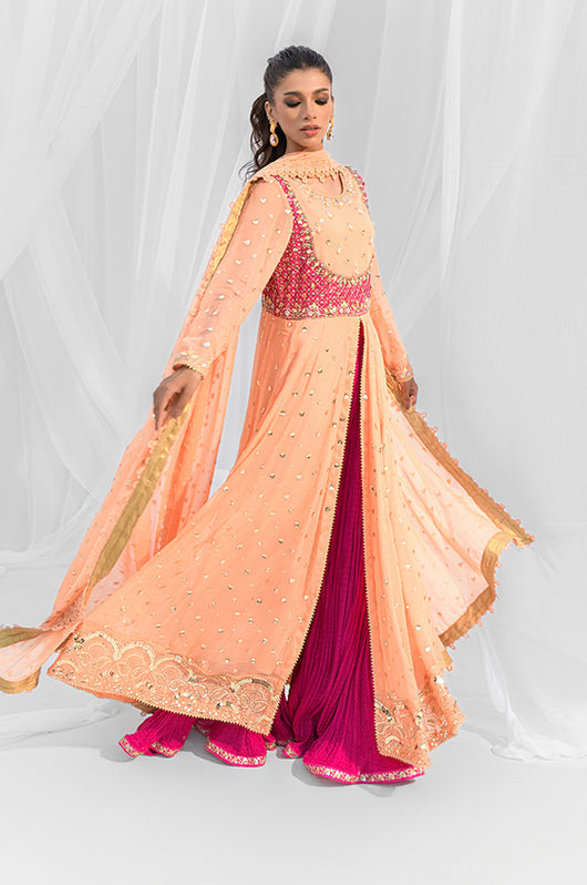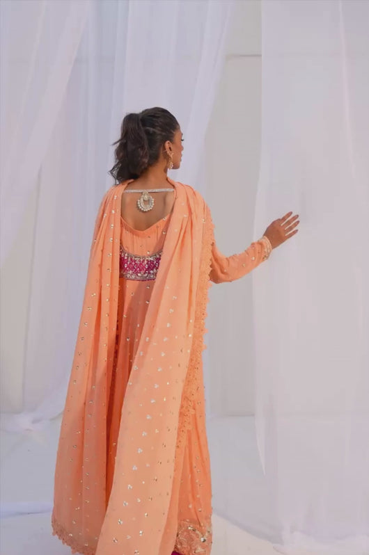 Nour is a beautiful tangerine peachish colored flared peshwas with front open details in pure georgette chiffon fabric. The dress is contrasted in shades of hot pink and has hand embellishments all around in the front and back. There are our signature RZT tassel details on the back and an embellished border all over the shirt. There is a crushed lehnga made in 7 yds fabric and lace details for the bottom of the shirt. The dress comes with a beautiful dupatta with all multiple chan details and gold borders underneath lace finishes in same color to complete the look. Showstopper outfit for this upcoming wedding season. The length of the shirt is 50 inches. It can be customised according to your requirements. Mention in the additional notes section about length customisations when placing the order.