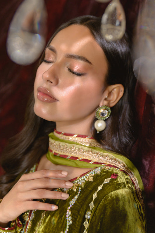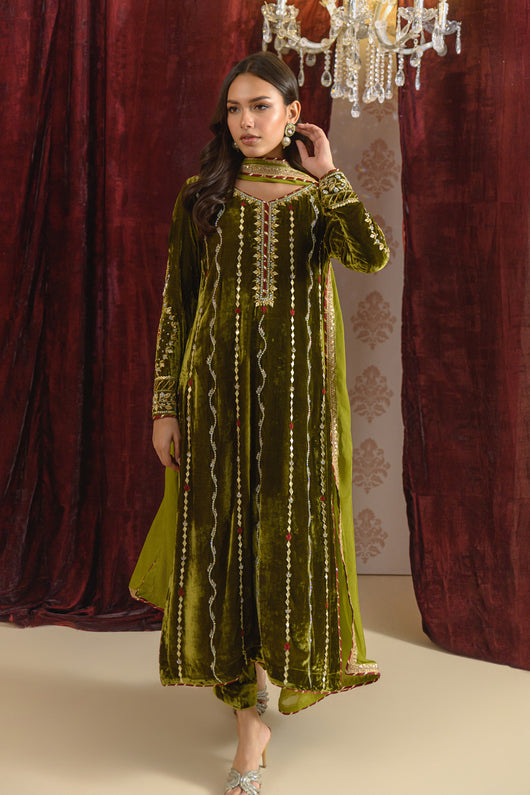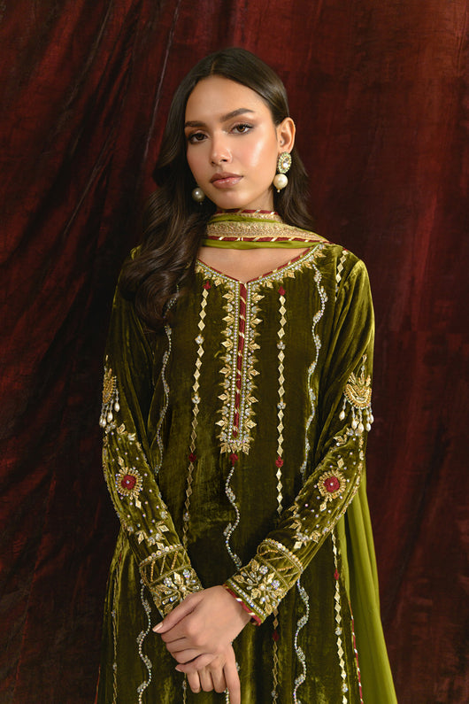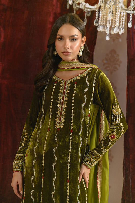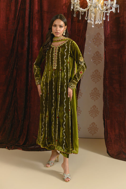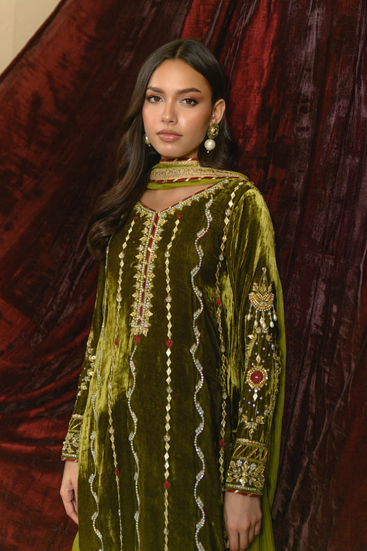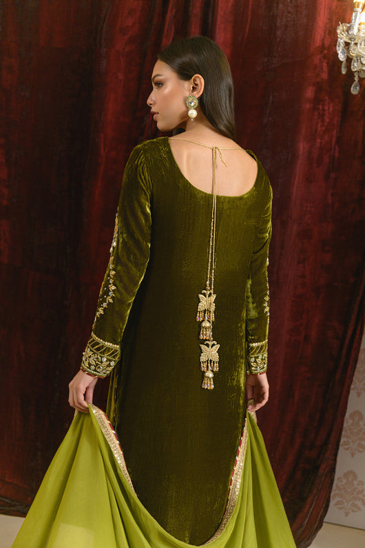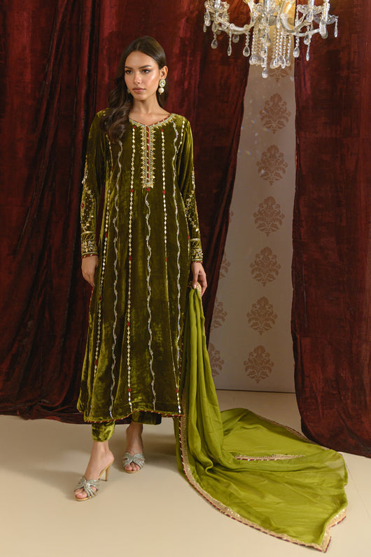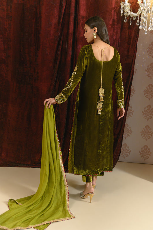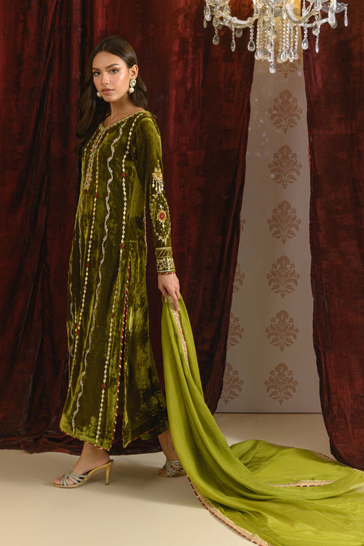 Cut from plush French olive green velvet, a very flattering A-lined shirt is richly handworked with subtle gold sequins and multi-toned crystals in an off set with striking maroon silk threadwork. The full sleeves add a touch of timeless elegance to the outfit designed for chilly festive nights. Comes with a medium silk dupatta in the shades of ombre and an additional pants made in the same plush olive velvet to complete the look.