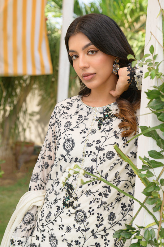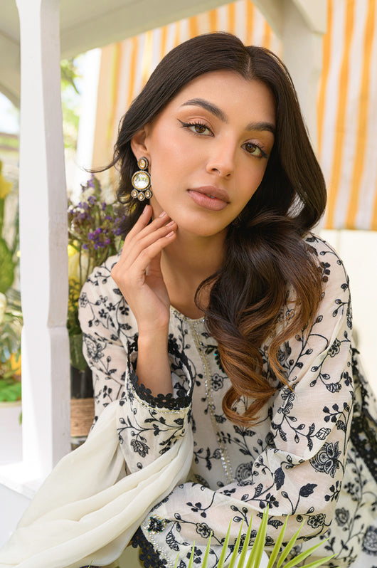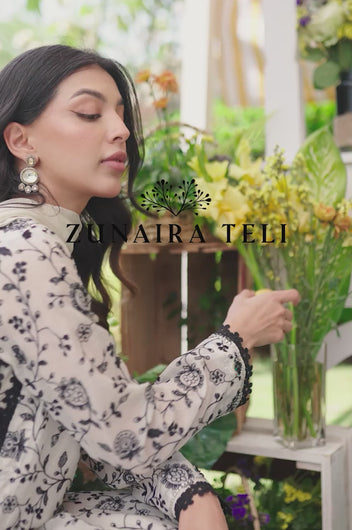 Nyre is an ivory-colored swiss voile or butter silk base with black embroidery all over. Comes with an embellished neckline with a hint of emerald green. The outfit has a boxy cut side slits with lace and cut dana lace finishes. The outfit comes with the same colored pants and a two toned dupatta with lace finishes.