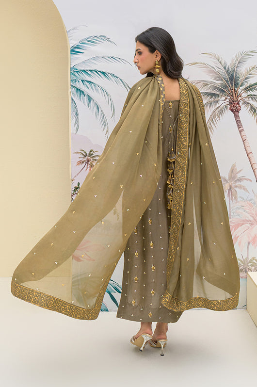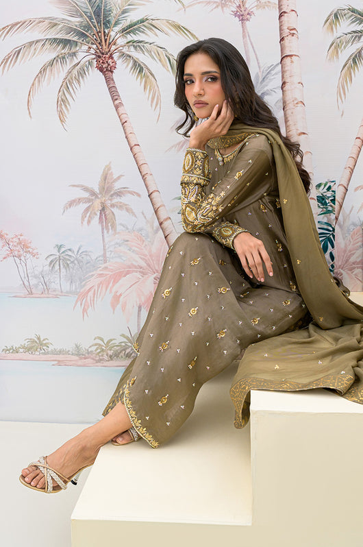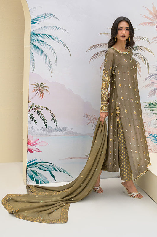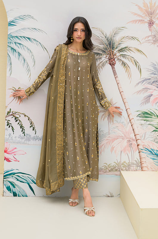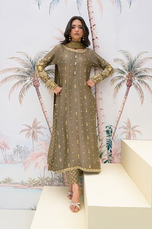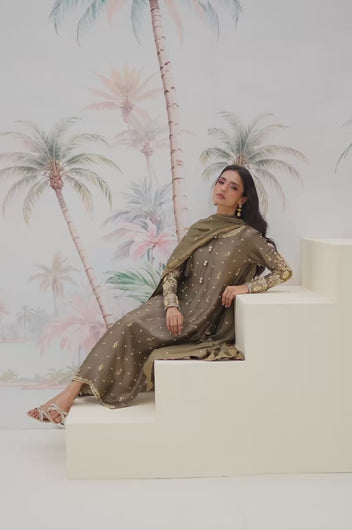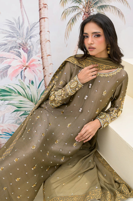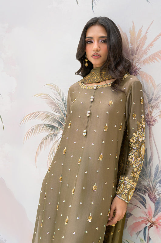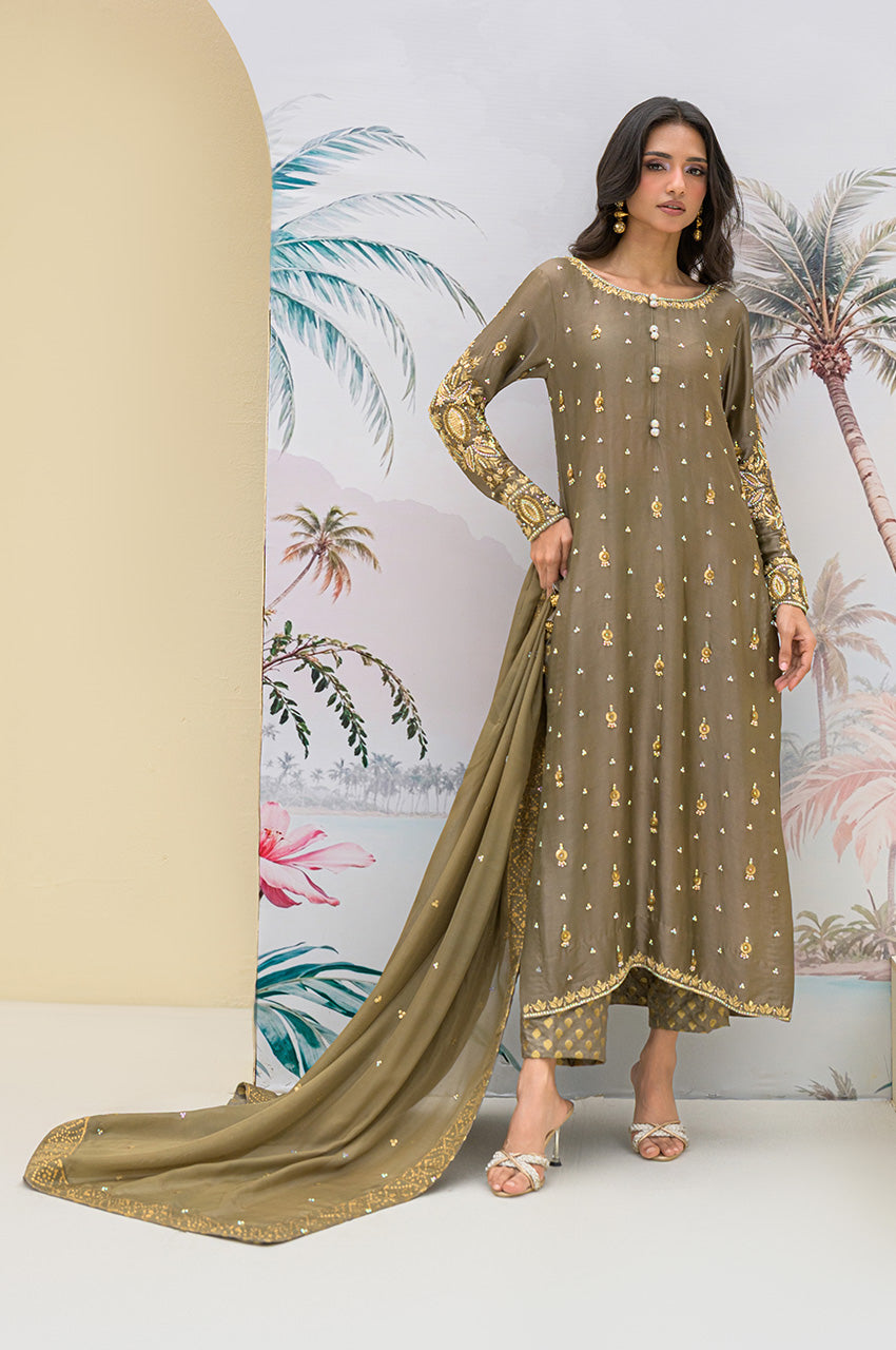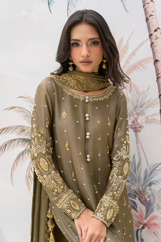 Olive gold is a heavily embellished shirt made in sheesha silk/butter silk. There is a bold bay shaped neckline and heavily embellished sleeves with small motifs and chan all over in back and front of the shirt. There are tassel details on the side chaks and back dori to give it that standout look. The outfit comes with banarsi pants in olive color and a medium silk dupatta with gold block print details and chan and stone flowers all over.