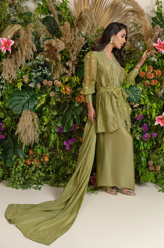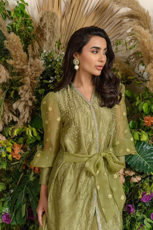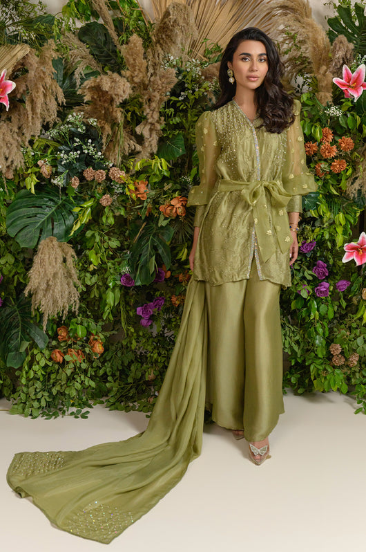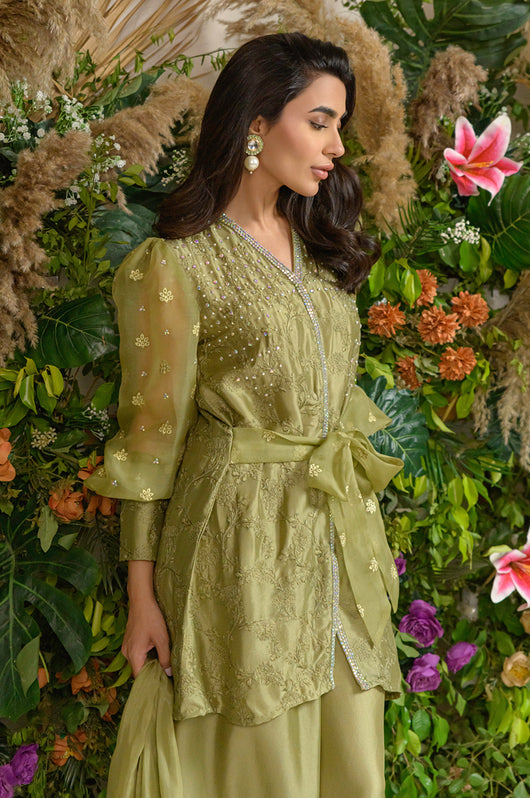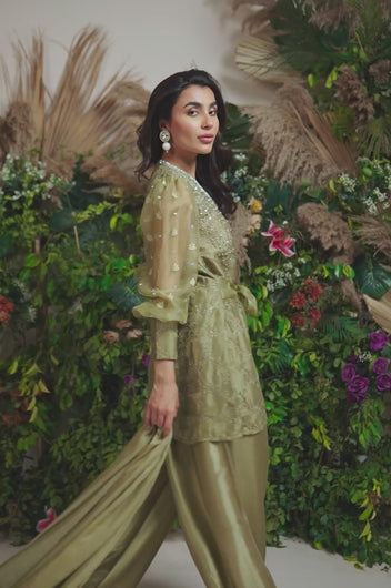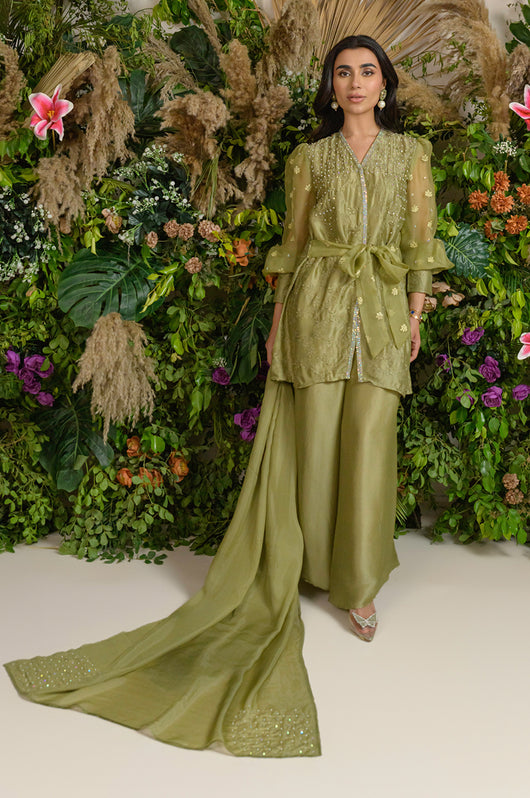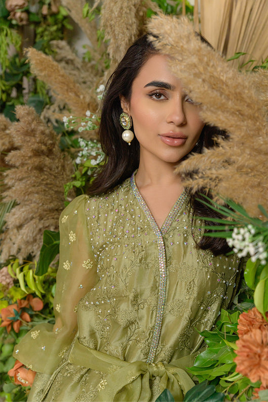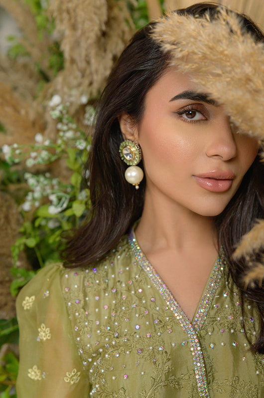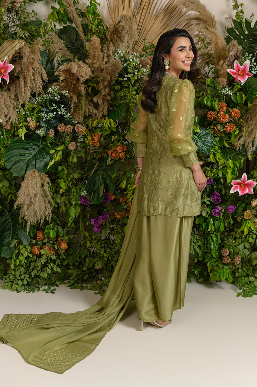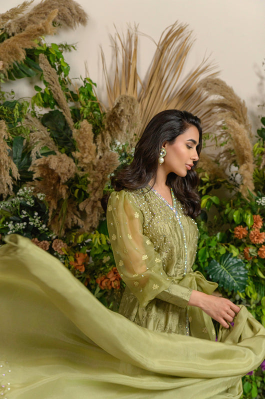 The olive green outfit is made on pure seesha silk with pure organza sleeves and heavily embellished neckline. The outfit comes with seesha silk pants and a medium silk dupatta with chan and embellished work all over.