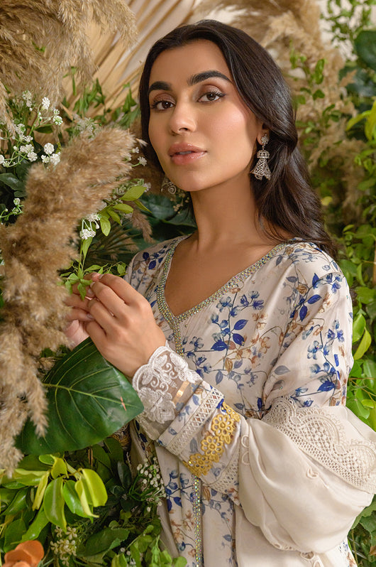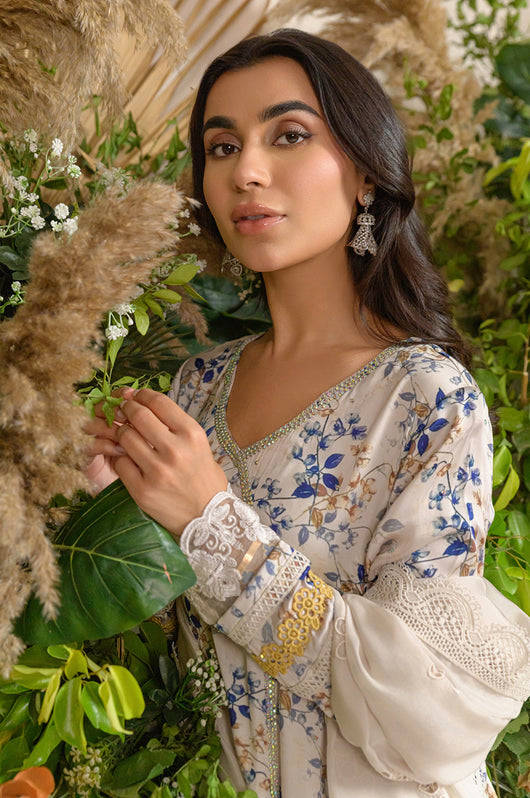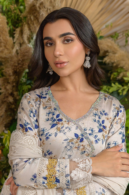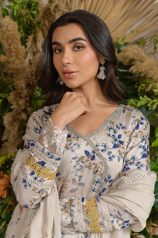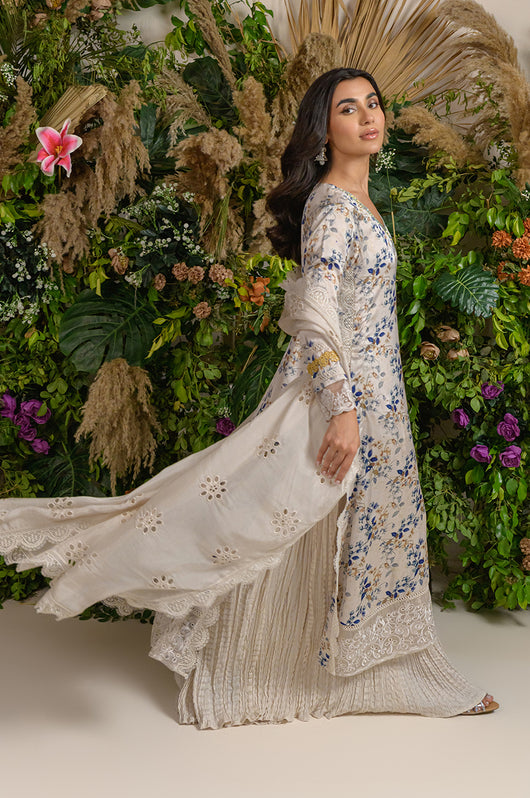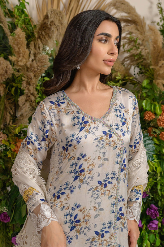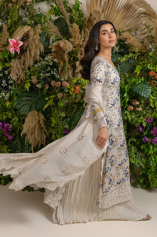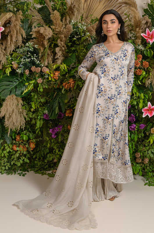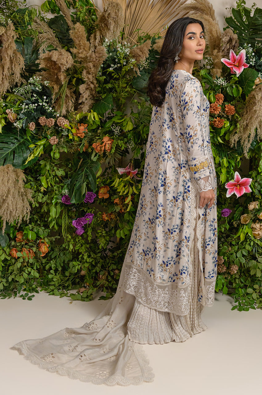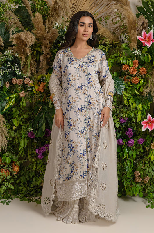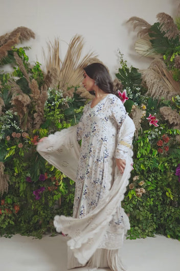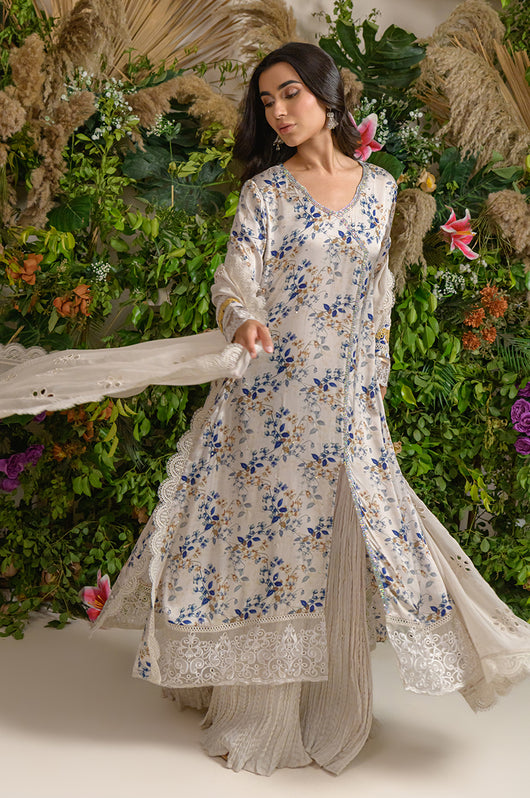 Pearl grey is a long length shirt with a subtle print on it made in pure Charmeuse silk with an angrakha look in the front and heavily embellished borders in the sides of the shirt with square chaks. The shirt has embroidered border details on the daman. The outfit comes with crushed pants and a schiffli dupatta with lace borders to complete the look.