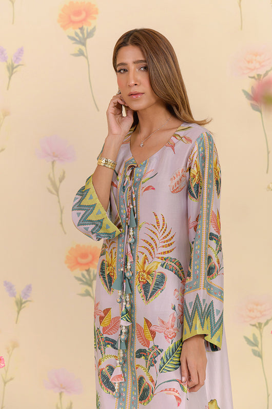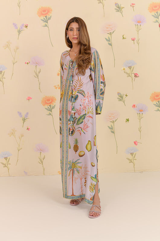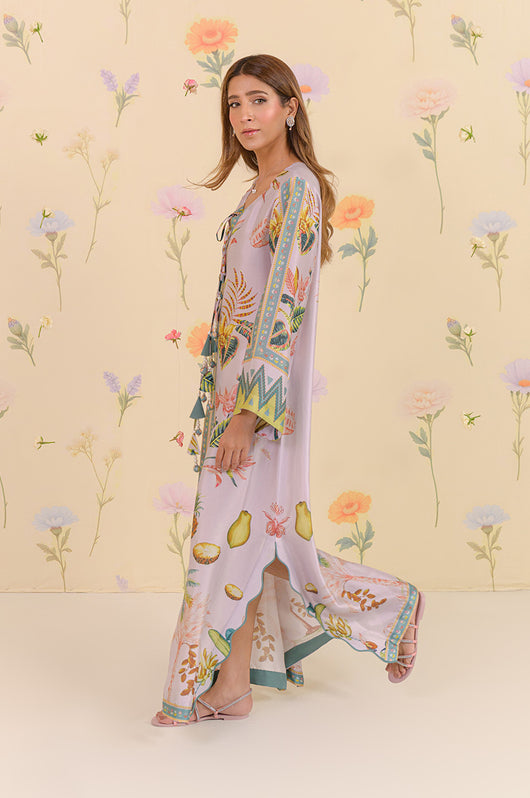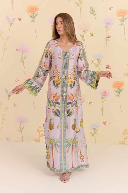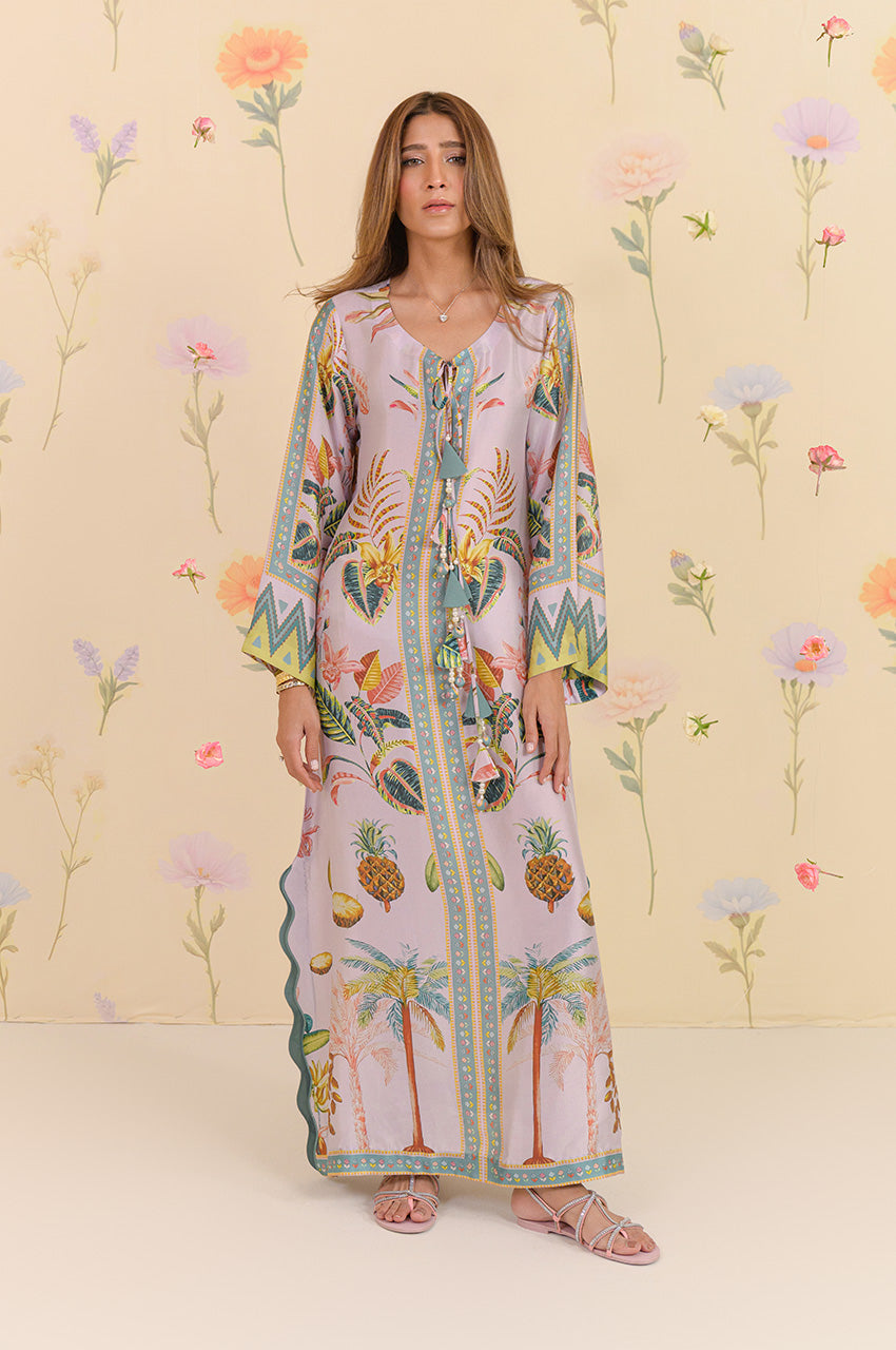 The dress is a long kaftan with a bold pattern inspired by pineapple trees and forest feels. Straight fit dress with side slits in wave pattern with touches of teal. The dress is embellished in tassel details on the neckline and clean straight lines for the effortless look.