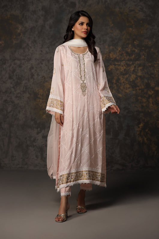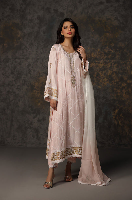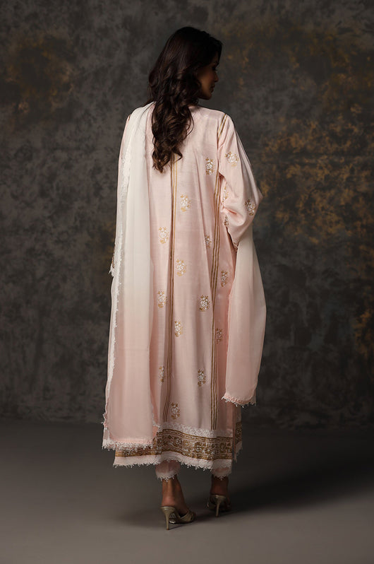 This powder pink beauty has block print all over front and bank also hand embellished on the neckline with lace details all over the shirt and pants. Pair it with a two toned dupatta with lace finishes to complete the look.