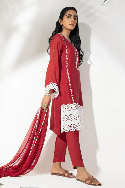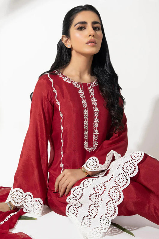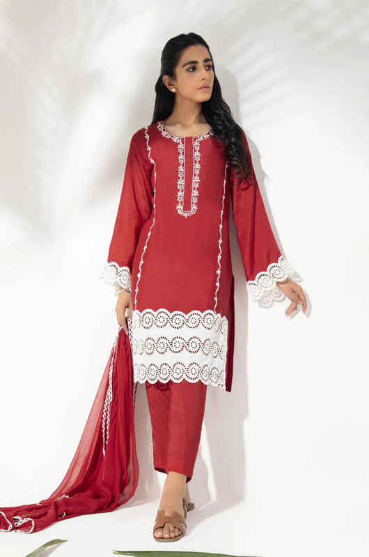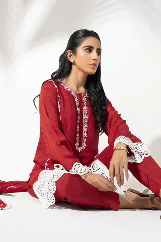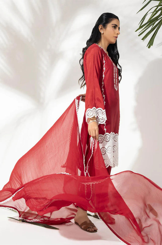 This cotton silk dress in red color is embroidered with sequins embellished detailing all over and cutwork border to complete the look on the front and sleeves of the shirt. Paired with a chiffon one piece dupatta with lace finishes.