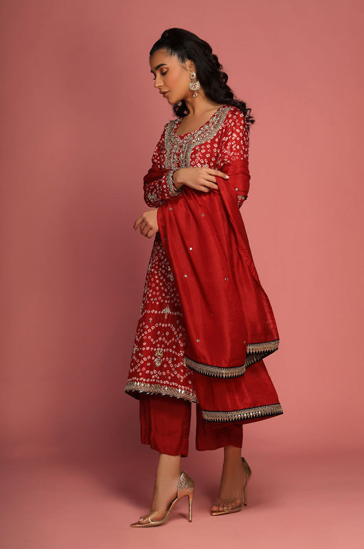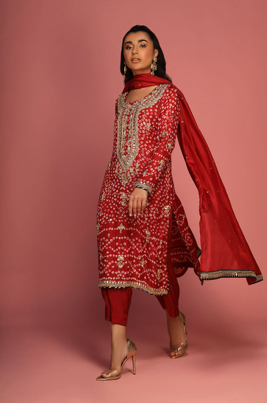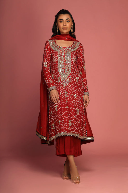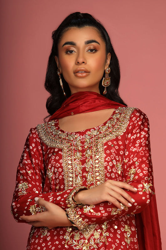Red Chunri is always a winter weddings staple. Comes with a heavy embellished shirt and a dhaka pants. Complete the look with the china silk dupatta with chan and lace finishes all over.