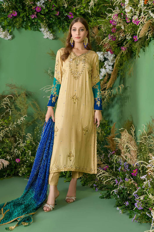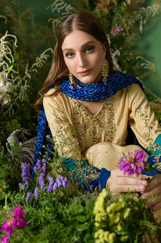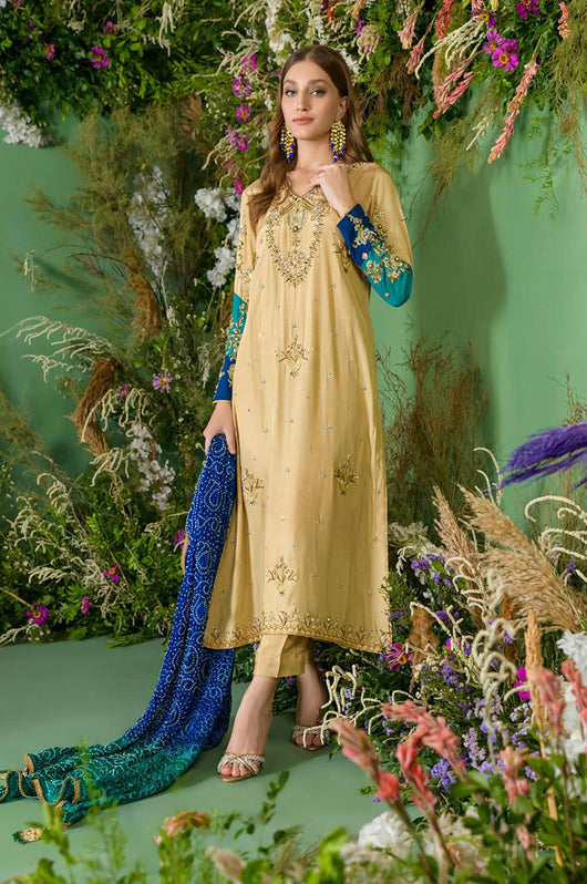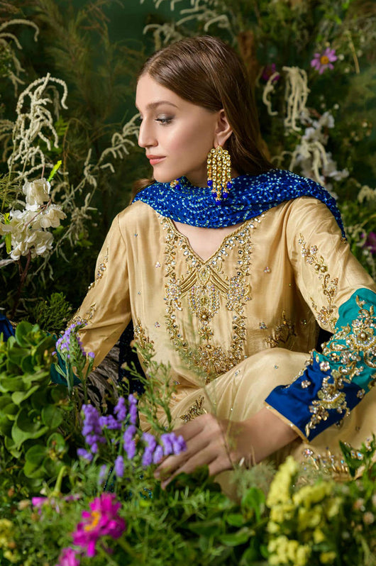 This piece plays a melodic symphony of colors the beige zari colored shirt is detailed with emerald green and royal blue sleeves with zardozi, stones, kora work in gold and silver shades. It is offset with a self colored trouser with the stunning two shade chunri dupatta that completes the look with heavy motifs touching on the corners of the dupatta.