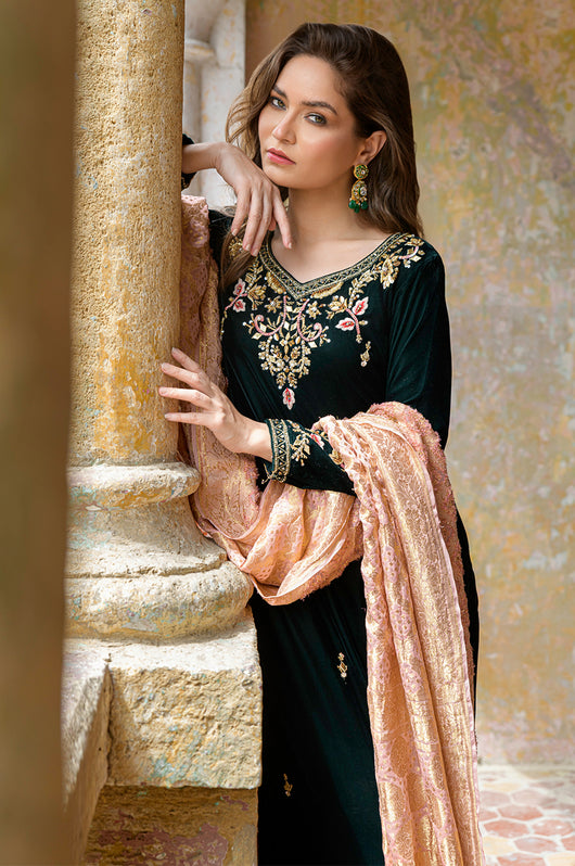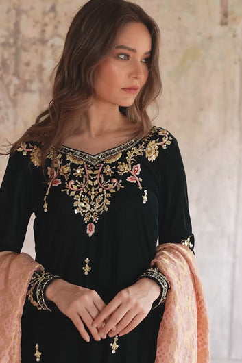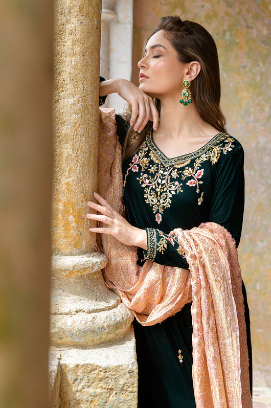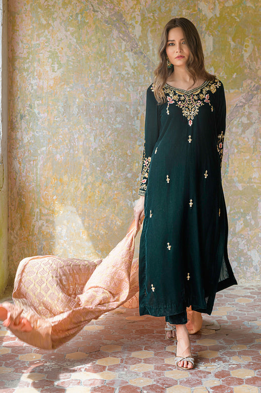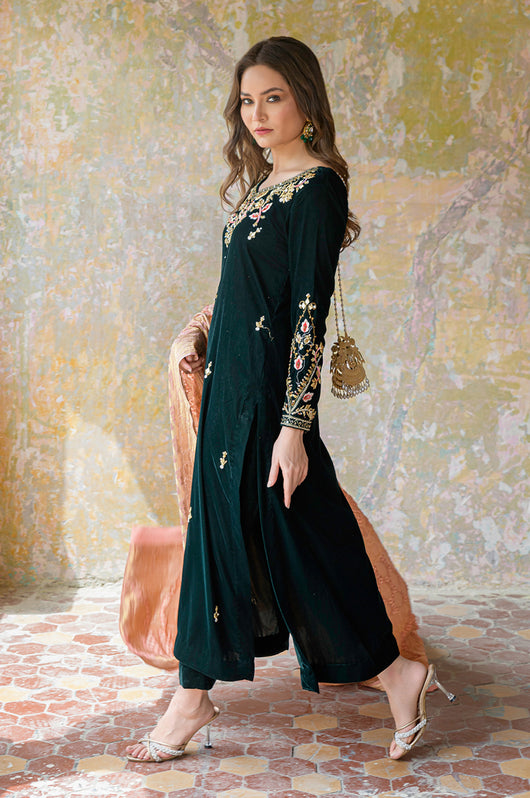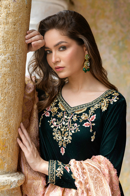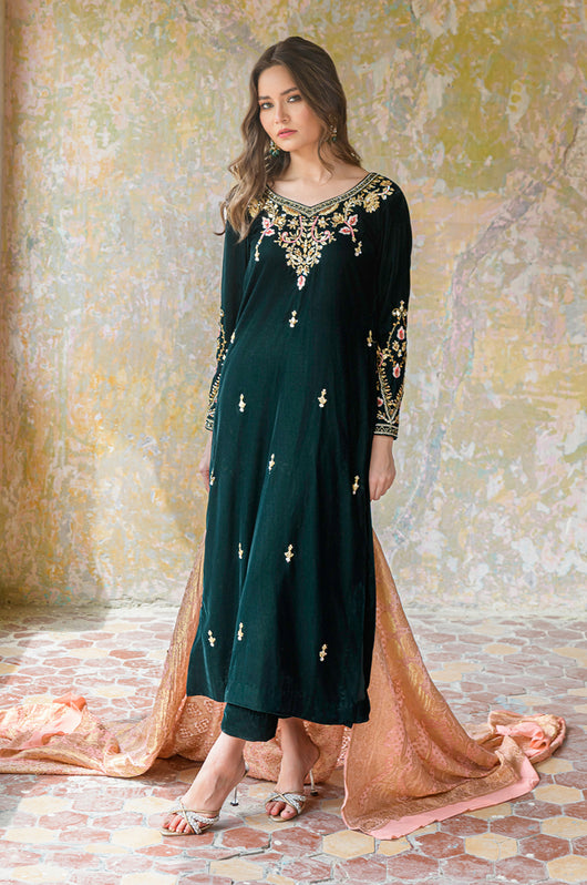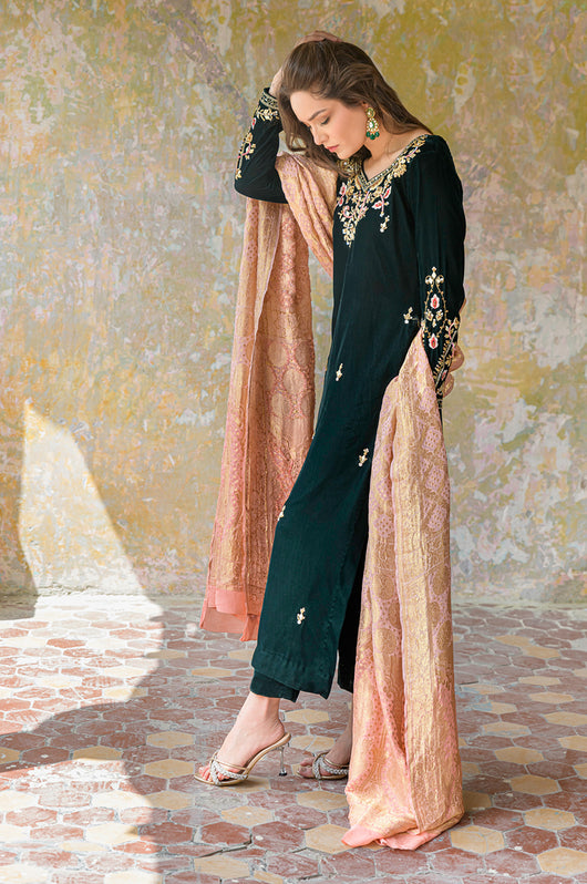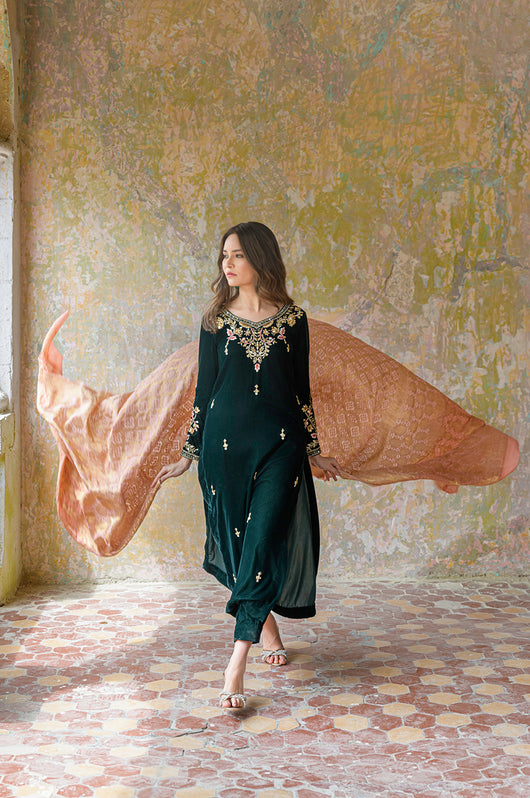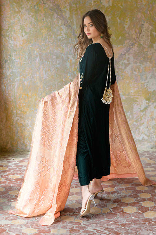 Riya is a green velvet suit made with a heavily embellished neckline and sleeves with notes of pink and gold with a contrasting dupatta. The length of the shirt is 48 inches. There are tassel details in the back of the shirt and a chiffon banarsi dupatta to complete the look. Customize the length by mentioning in additional notes section when placing the order.
