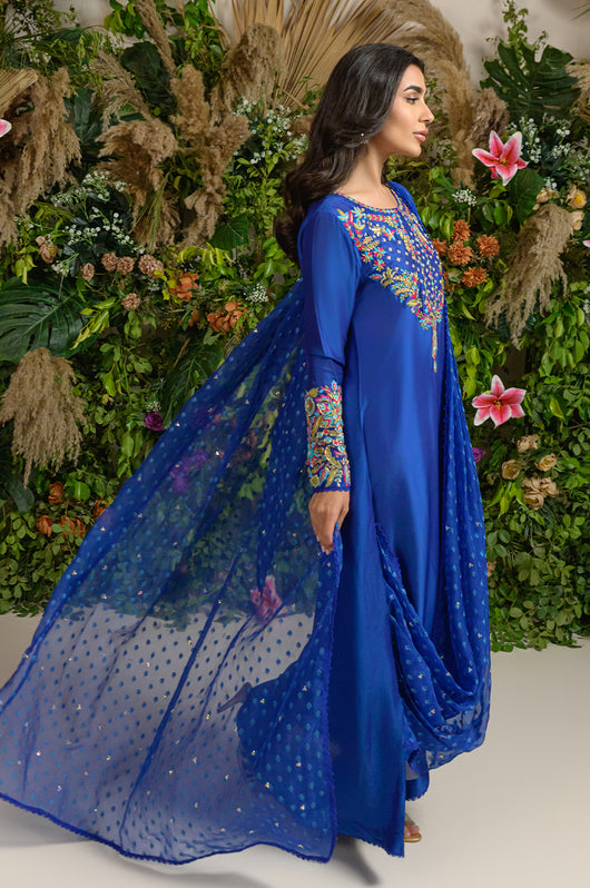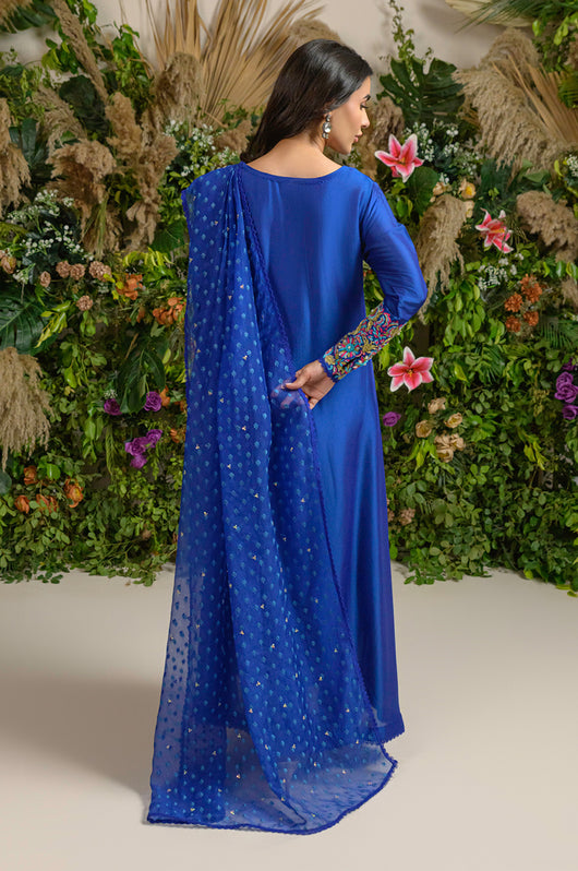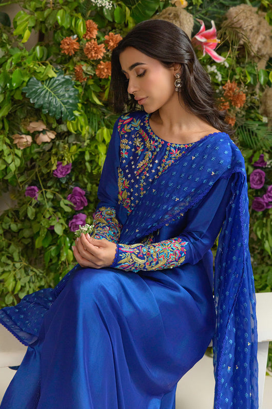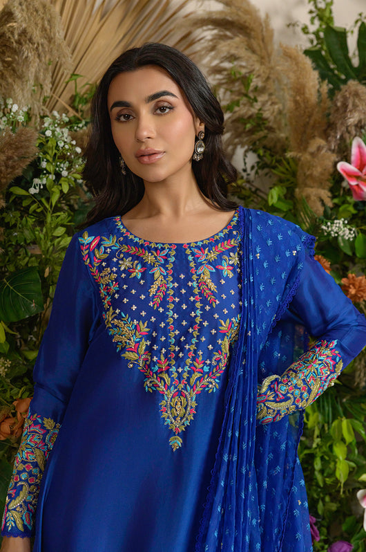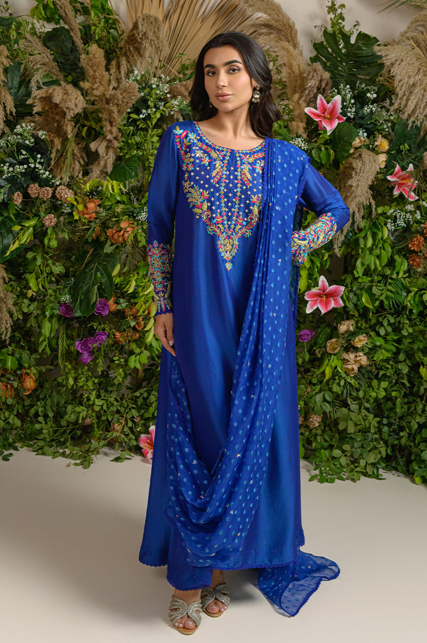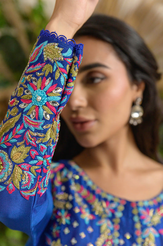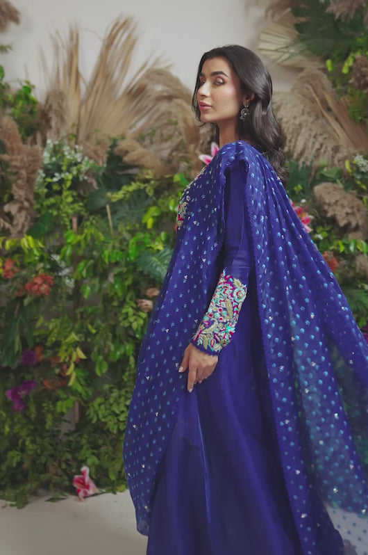 Royal azure blue is our drape style signature saree cut made in sheesha silk shirt with an attached pure organza silk dupatta which is heavily embroidered and embellished. The outfit comes with straight sheesha silk pants.
