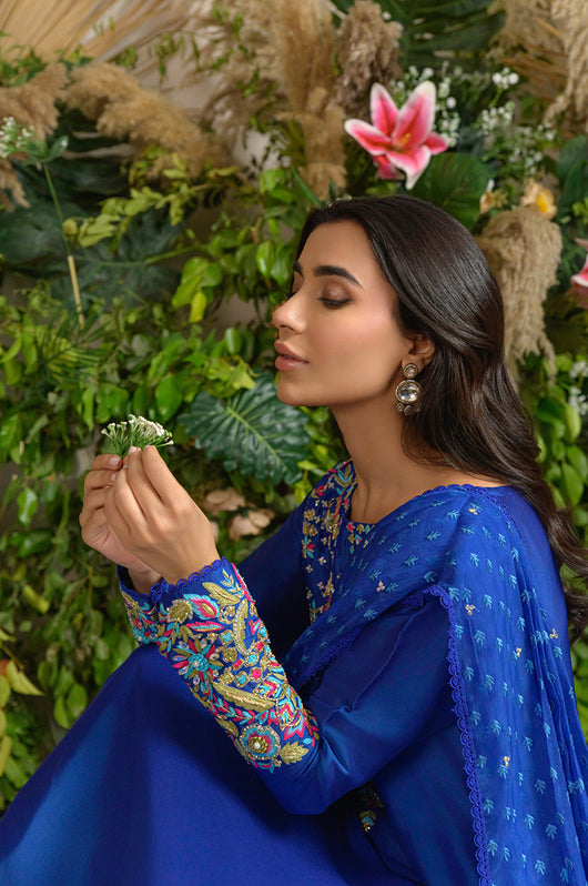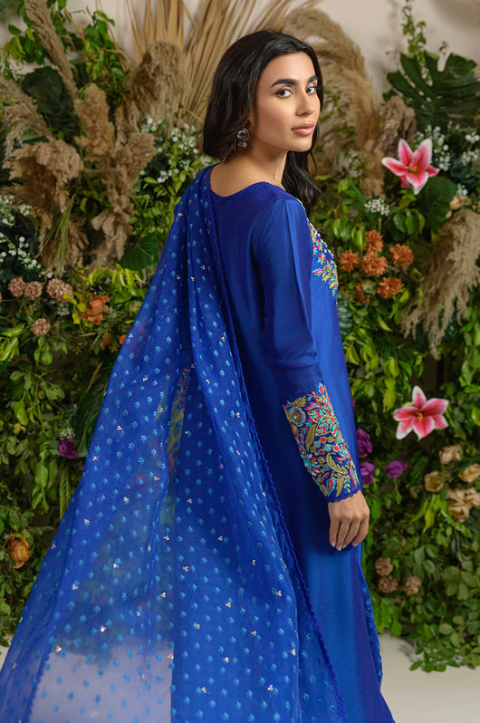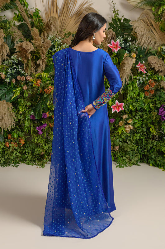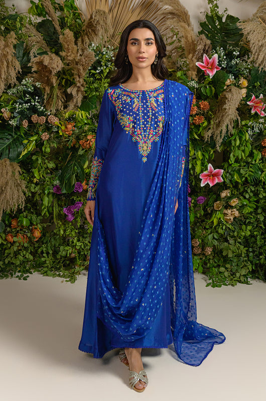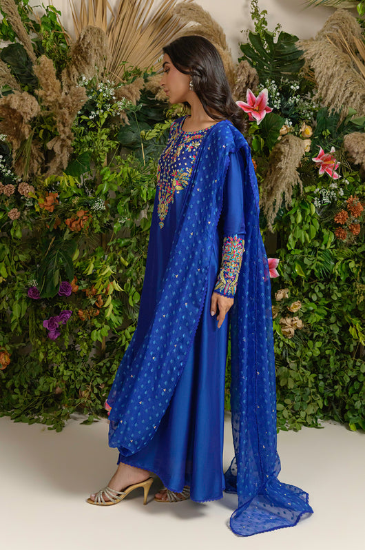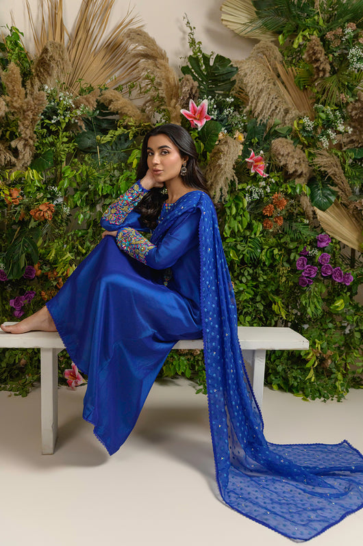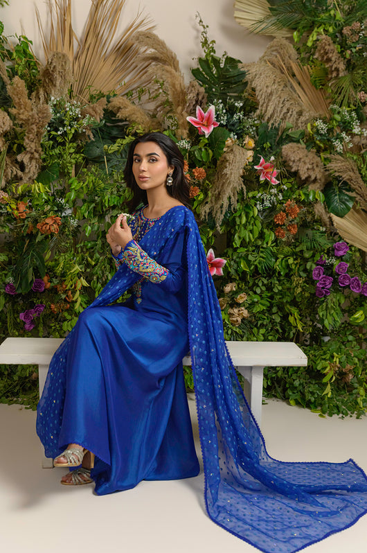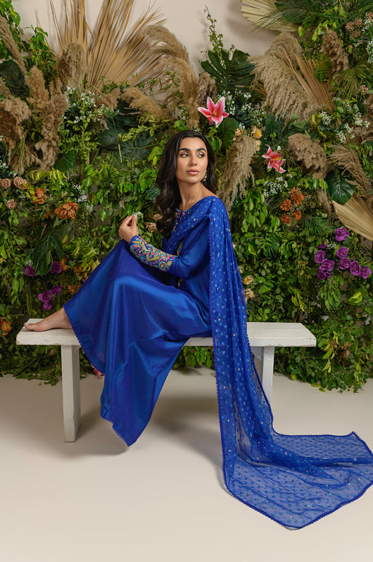 Royal azure blue is our drape style signature saree cut made in sheesha silk shirt with an attached pure organza silk dupatta which is heavily embroidered and embellished. The outfit comes with straight sheesha silk pants.