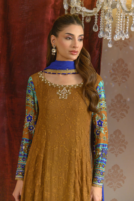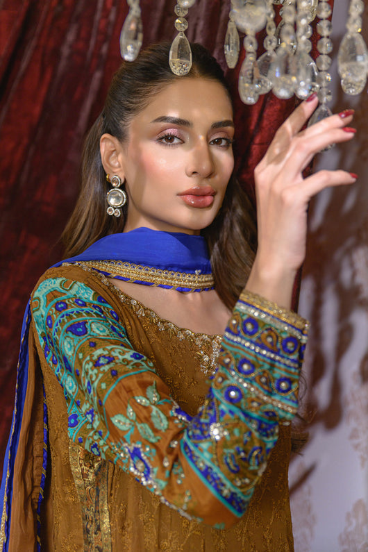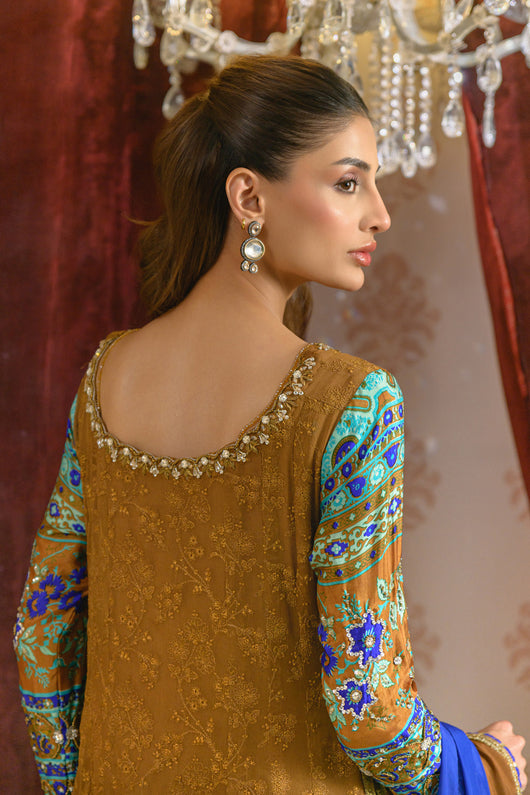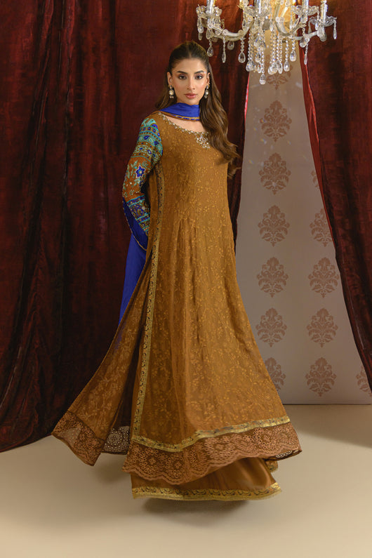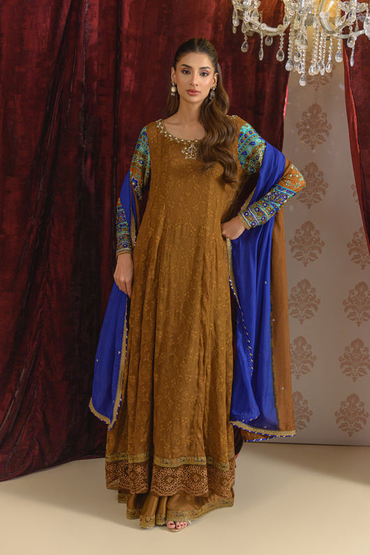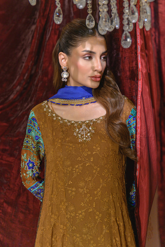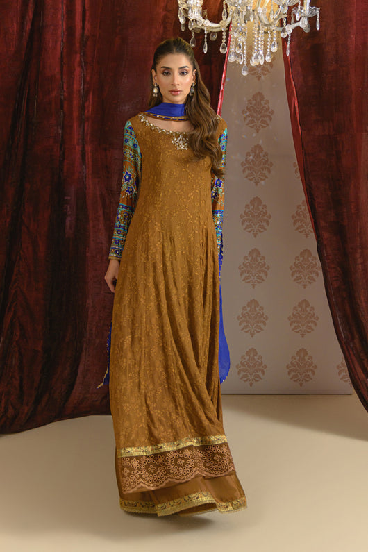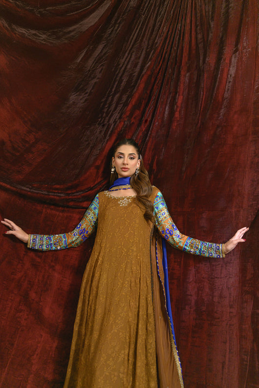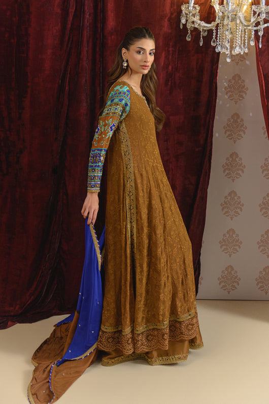 A dreamy kalidar in notes of bronze made in pure georgette chiffon with self-embroidered base, and jamawar finishing alongside the border on the long length shirt. Sleeves made in pure medium silk 60 gms and heavily embellished with a detailed neck and backline. The outfit comes with a flared pant which also has jamawar finishes and a silk two-toned dupatta with lace and chan details all over for a complete look.