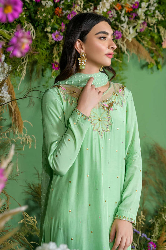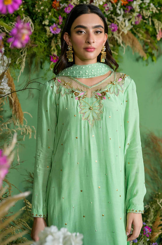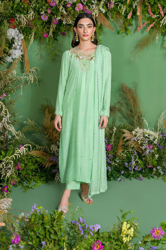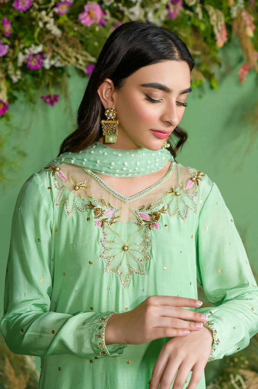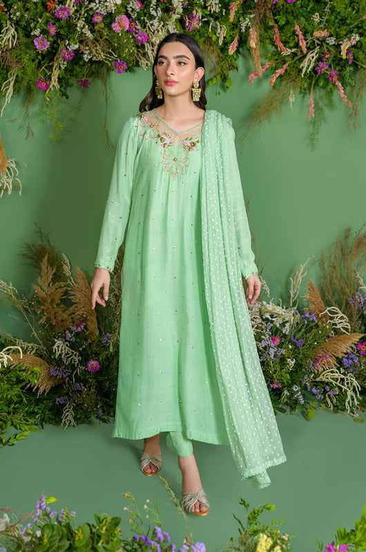 This gorgeous mint cotton silk has flecks of gold Swarovski crystals that are complimented through the pops of light pink. The neckline is detailed with organza patches and work surrounding it. This outfit comes with a dotted net dupatta that adds charm to the outfit, and the same colored pants.