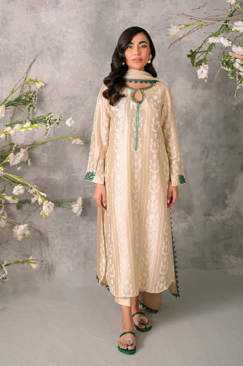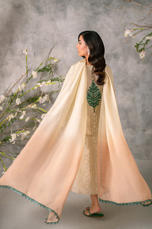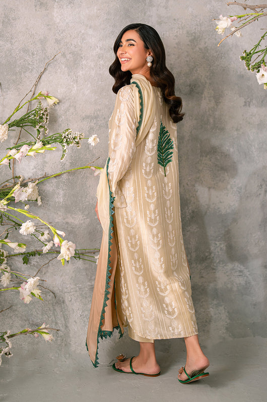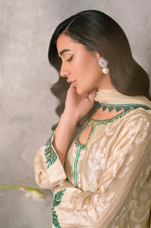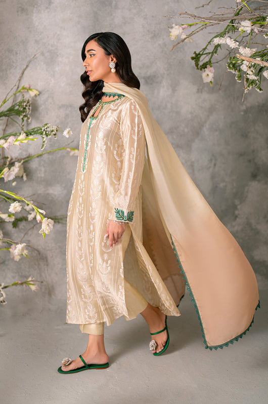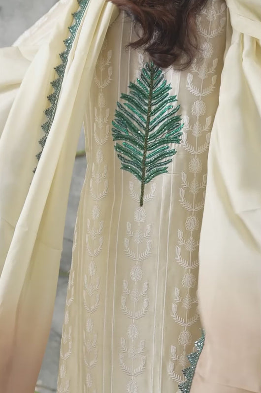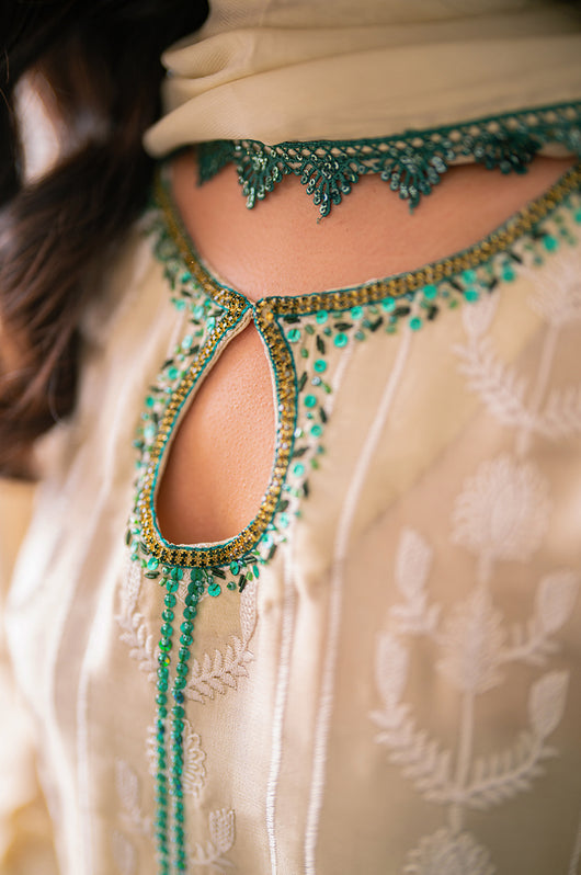 Samara is a pure butter silk shirt made in Gardenia color. The dress is embroidered and comes with hand work details all over the front and back of the shirt all with notes of emerald green. Comes with sleeves made with a cuff style with motifs on it as well. The dress comes with straight pants made in the same fabric. Along with a dupatta that is made in silk and double shaded latte colored palu. Dupatta is finished with emerald green lace finishes as well to complete the look.