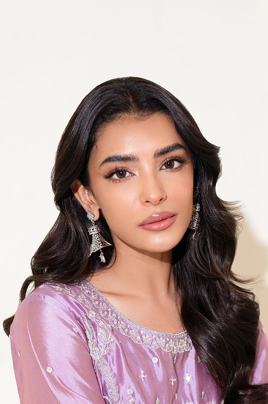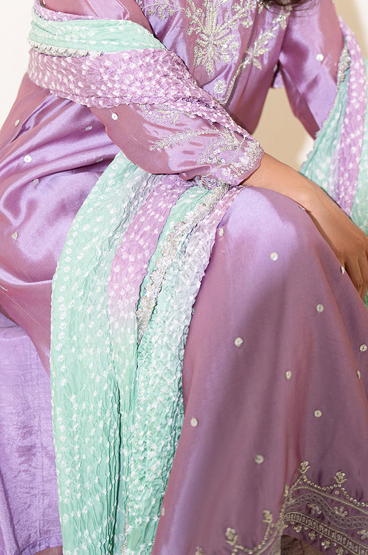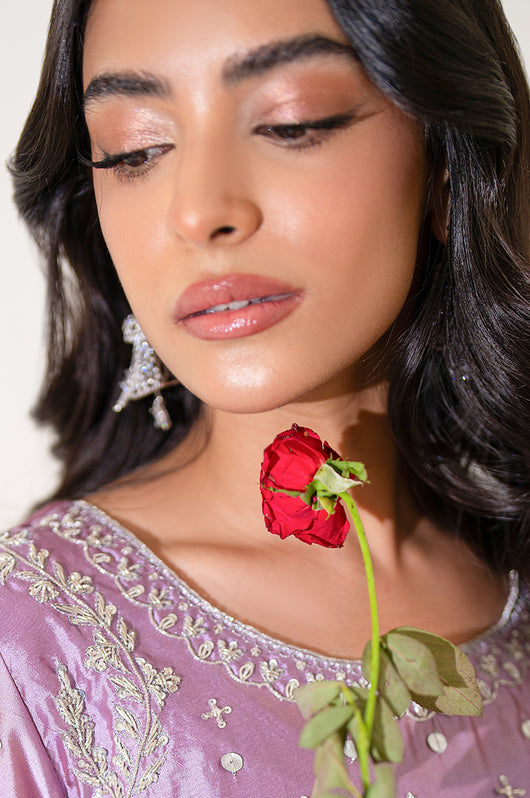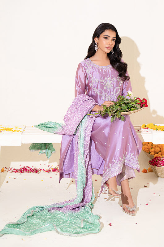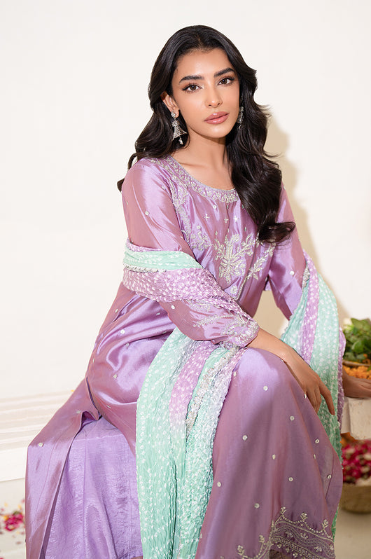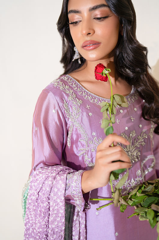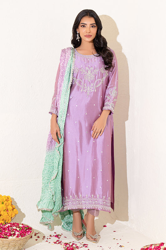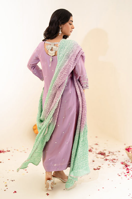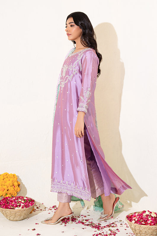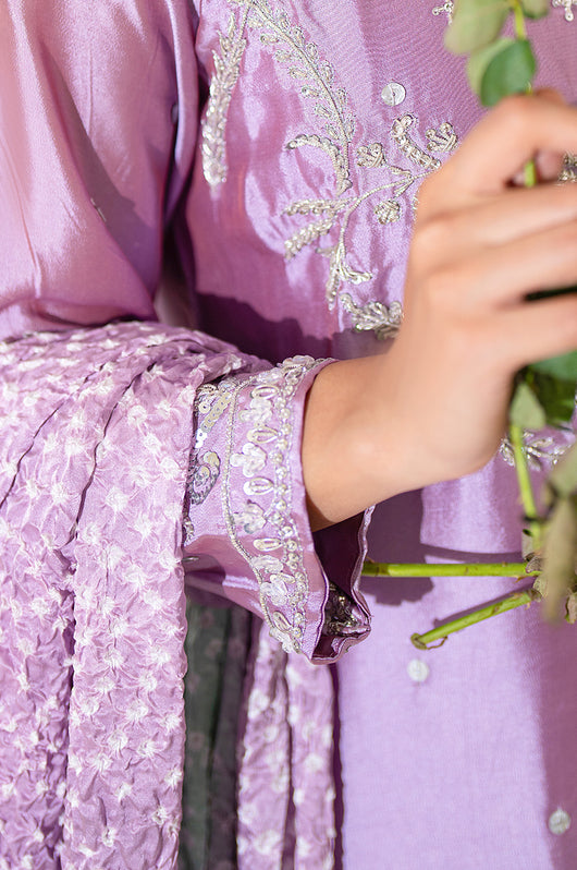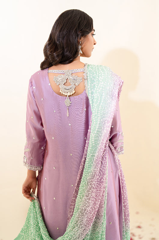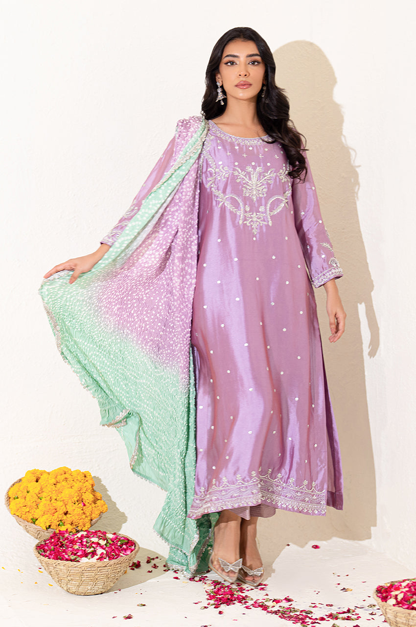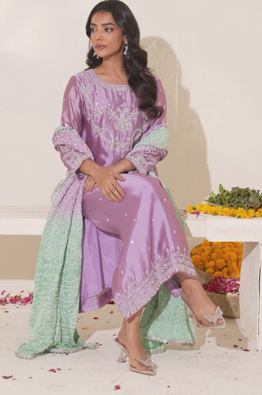 The Lilac pure seesha silk shirt is a long A line shirt with heavily embellished neckline, sleeves and daman. The look is completed with a heavily hand embellished motif in the back and chan all over. The dress comes with a chunri dupatta in double shade and a jamawar pants to complete the look.