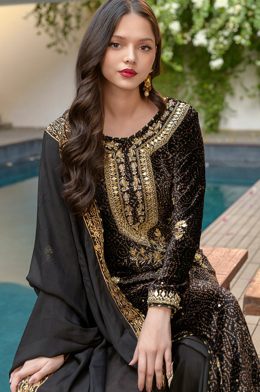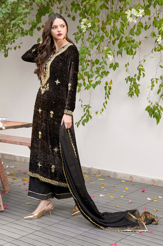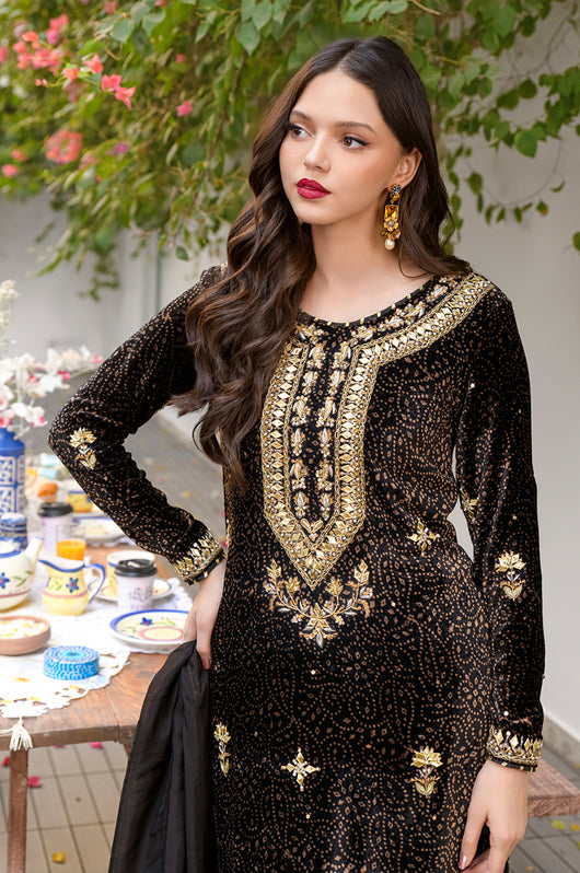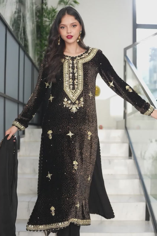 Sareena is a pure black velvet made in Chunri digitally printed shirt. Heavily hand embellished front with neckline, daman and sleeves with motifs and chan all over the shirt. The dress comes with Bosci silk culotte pants with gota details and a silk dupatta with block printed details all over.