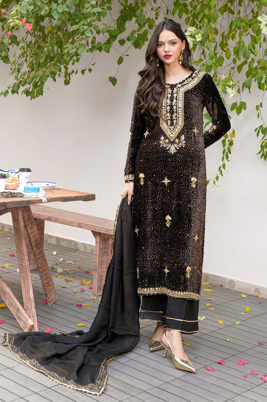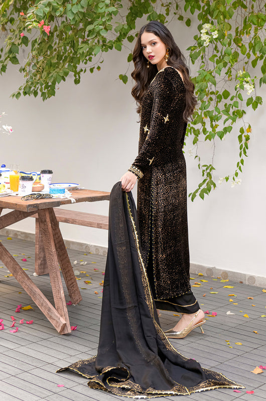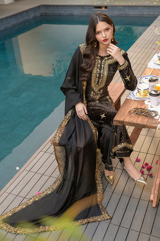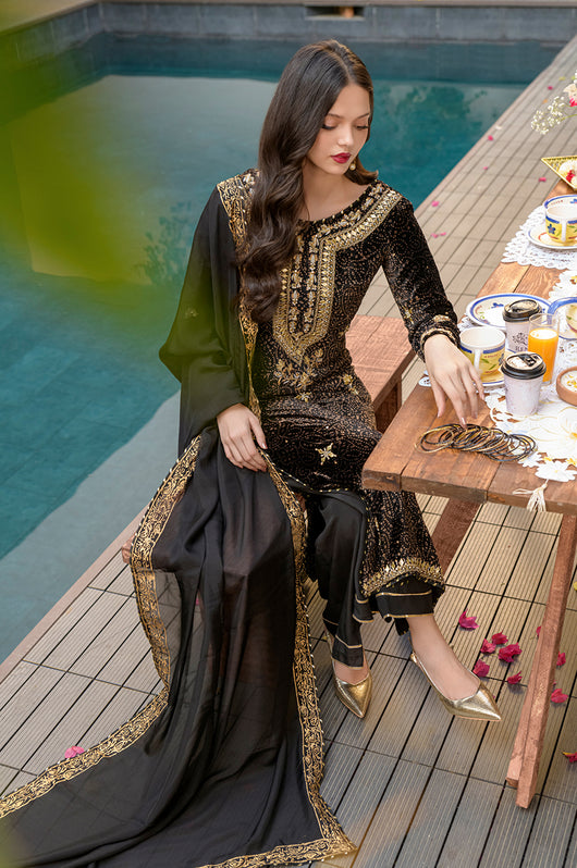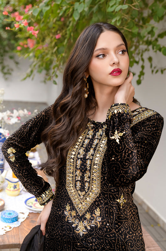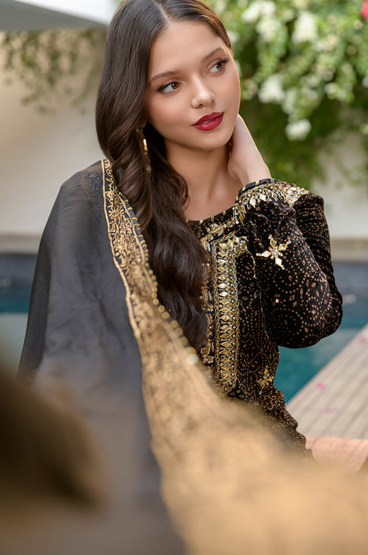 Sareena is a pure black velvet made in Chunri digitally printed shirt. Heavily hand embellished front with neckline, daman and sleeves with motifs and chan all over the shirt. The dress comes with Bosci silk culotte pants with gota details and a silk dupatta with block printed details all over.