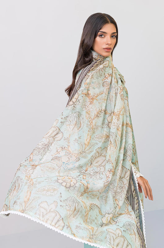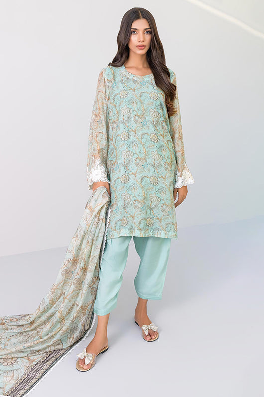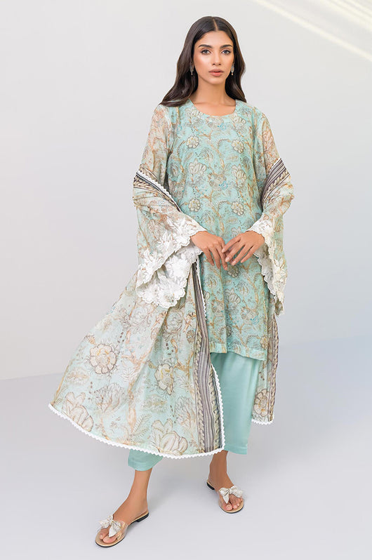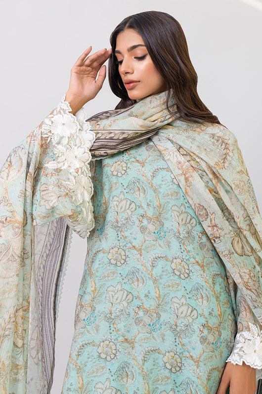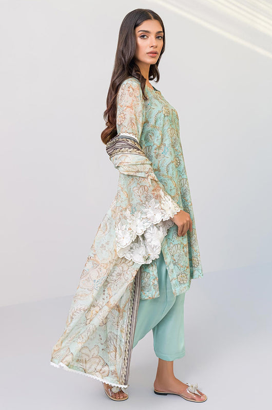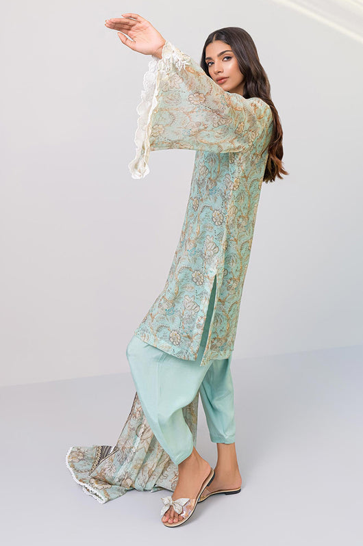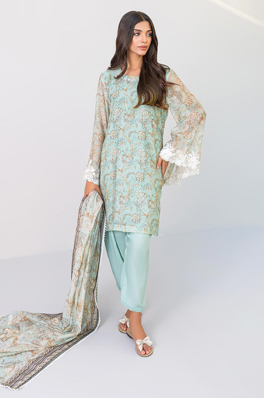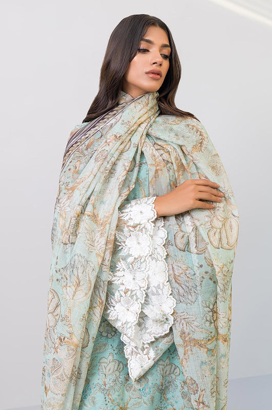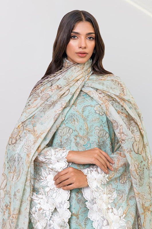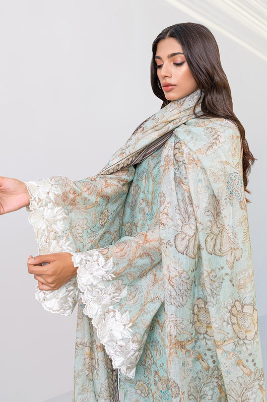 A short tiffany blue cotton net tunic is printed with floral imagery in tones of gray. The long elaborate sleeves with off white embroidery add to the outfit. Comes with a fitted khari shalwar in the same base color and a printed cotton net dupatta.