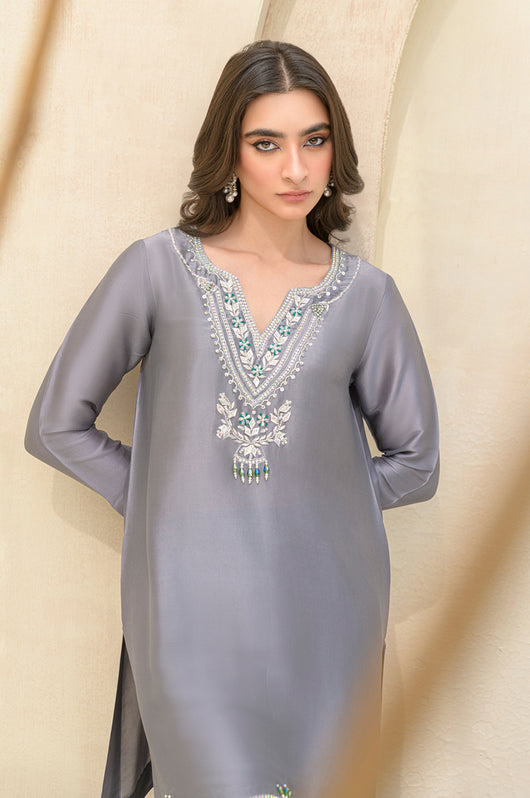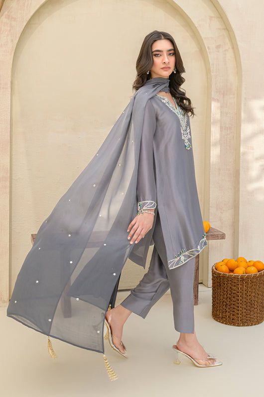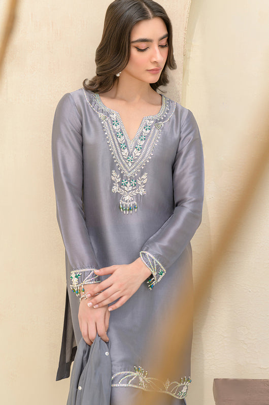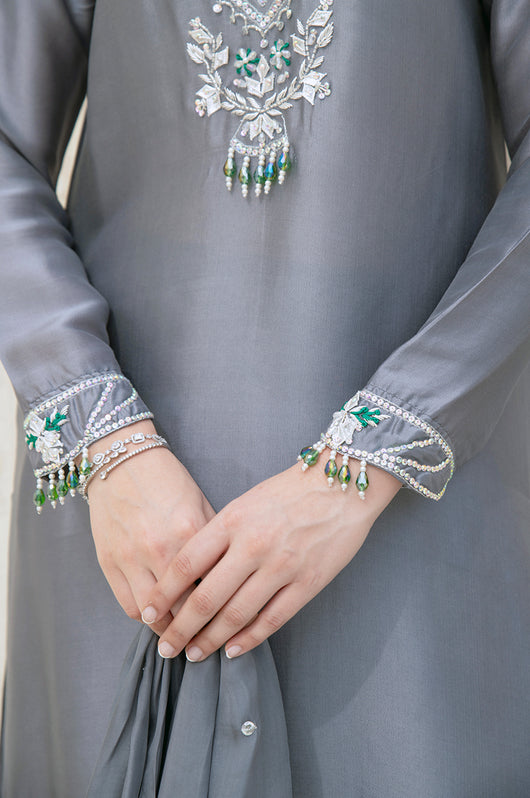 Experience the art of looking effortlessly classy in this sparkling silver ensemble. Crafted from pure seesha/butter silk the Silvia ensemble is decorated with subtly shimmering sequin blooms with emerald green tones of resham. The sleek, uber flattering straight short silhouette of this ensemble will have you reaching for it whenever you really want to make an impact!The elegant, two toned silk dupatta dotted with sequin/chan blooms completes the outfit. Comes with the seesha silk salwar (as shown).