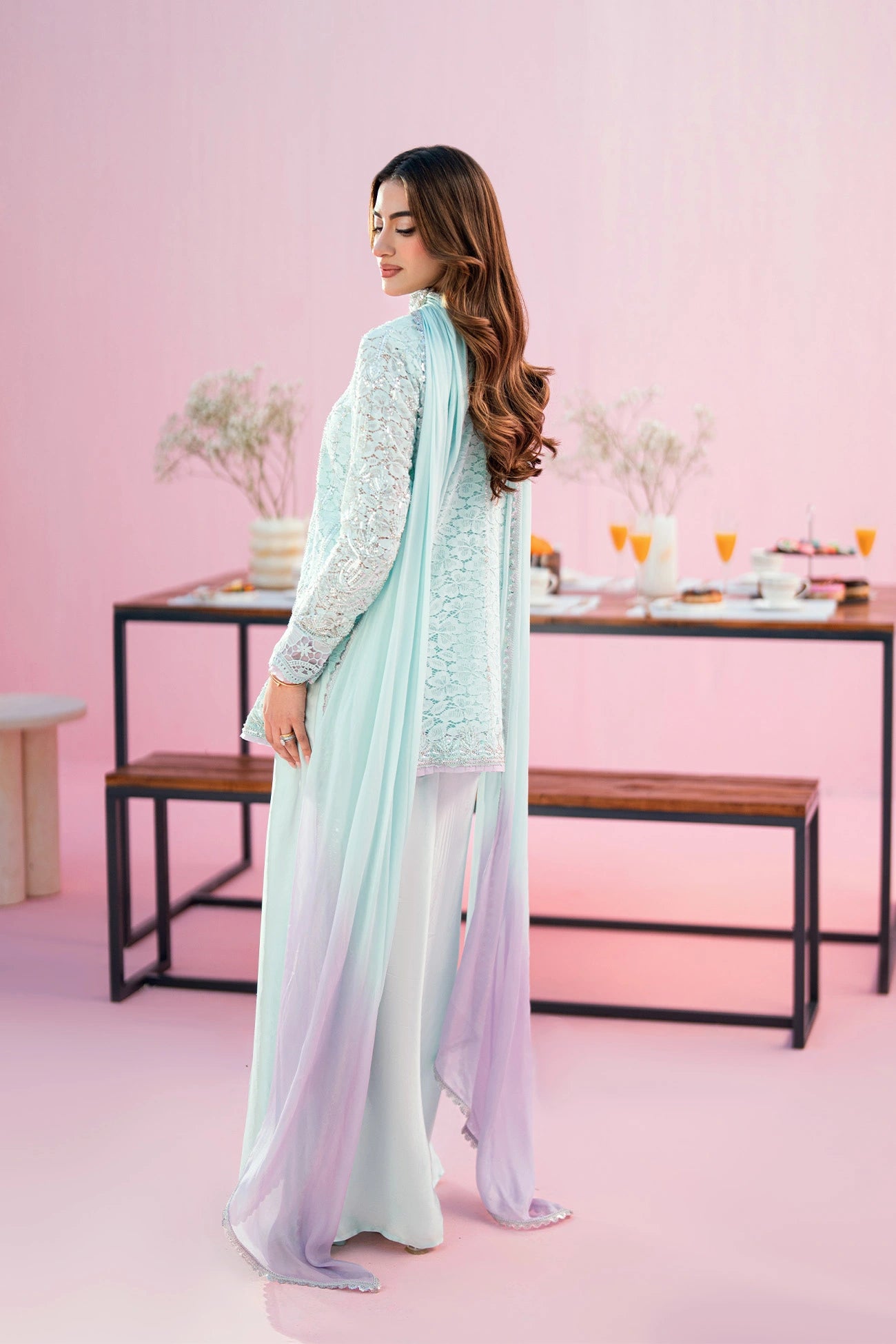 Charmeuse silk saree-style pants introduce a soft drape through the lower half, creating movement that feels considered and graceful. The ensemble is completed with a two-toned asymmetrical dupatta, designed to mirror the neckline and add dimension without excess. The result is a modern festive silhouette that feels poised, polished, and assured.