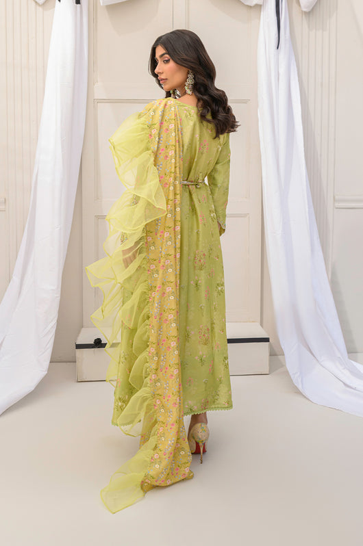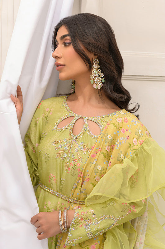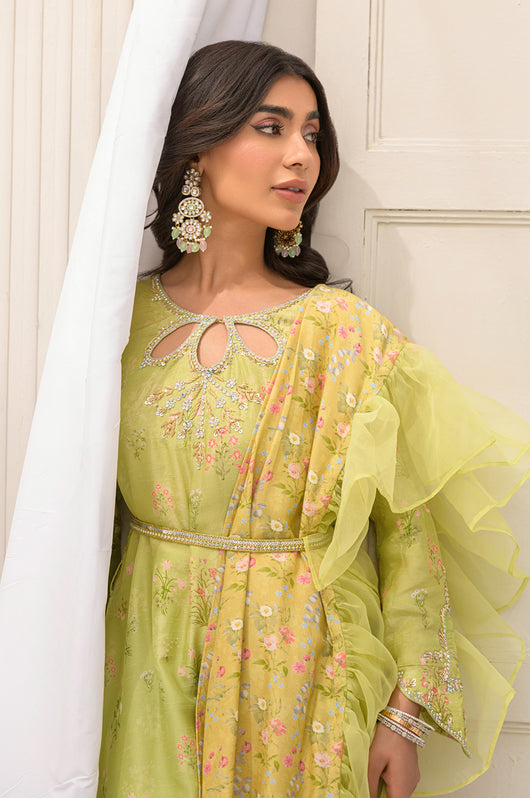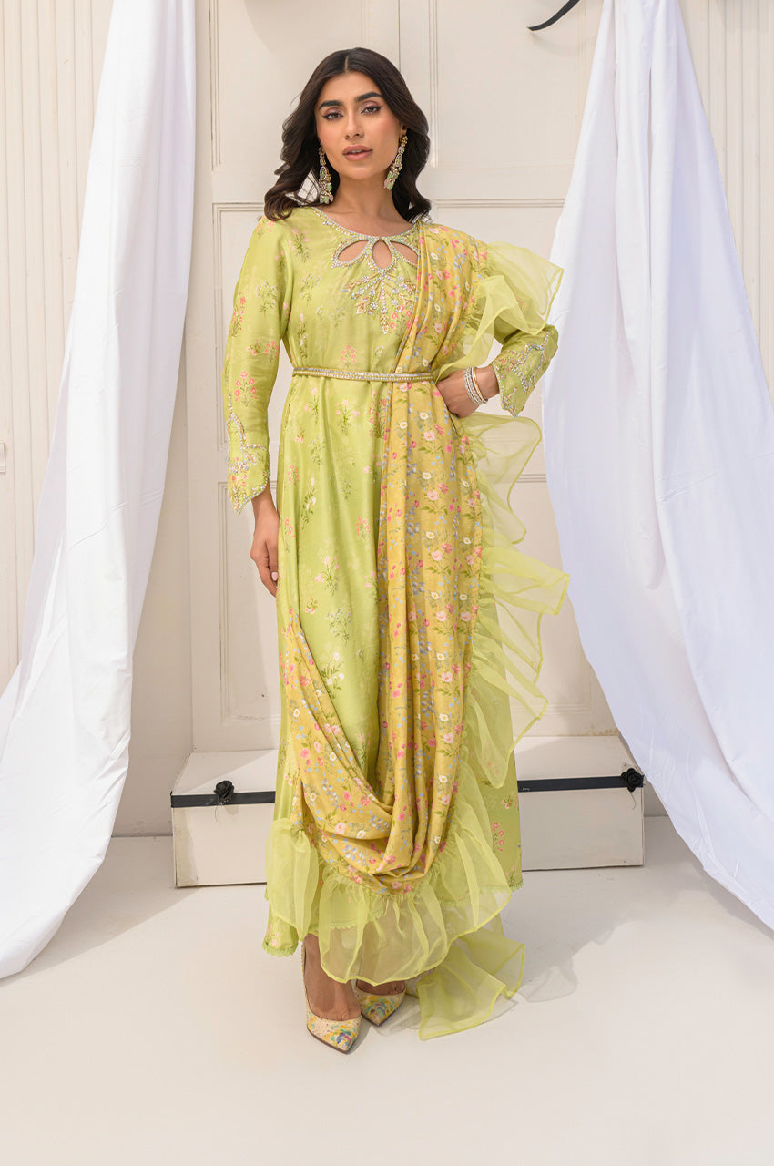 Discover elevated, refined prints created in-house with immaculate tailoring and steal the show this festive season! Sobi is a drape style shirt with attached dupatta in contrast with frill details.. Elevated with a romantic neckline and sleeves hand embellished in premium handwork materials like Swarovski stones, crystals, kora, resham and sitara. The dress can easily become a star at any party you wear it to. Comes with complimentary cotton silk pants.