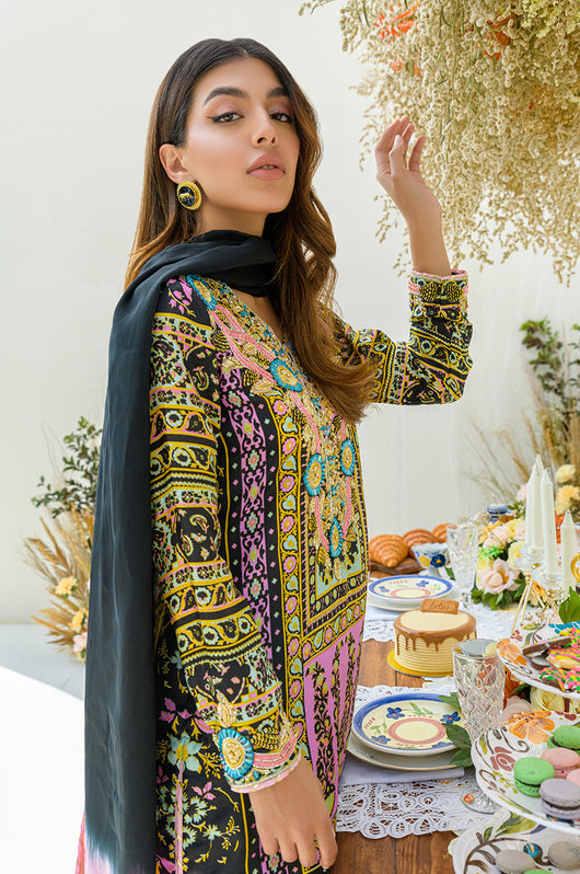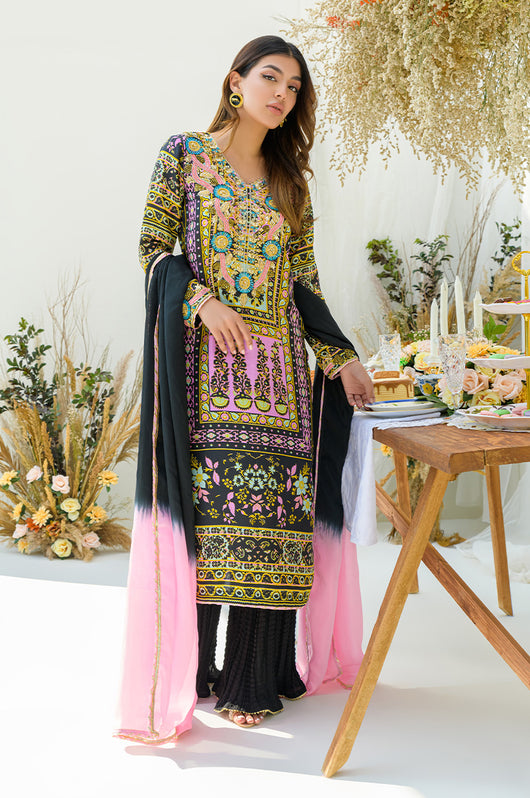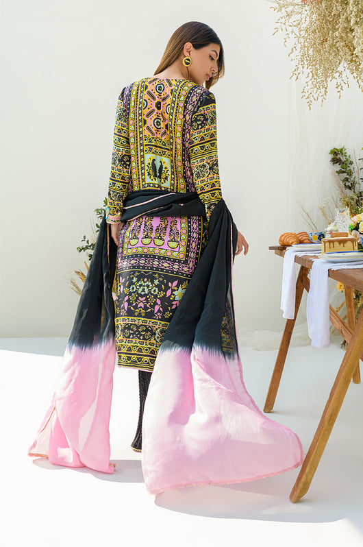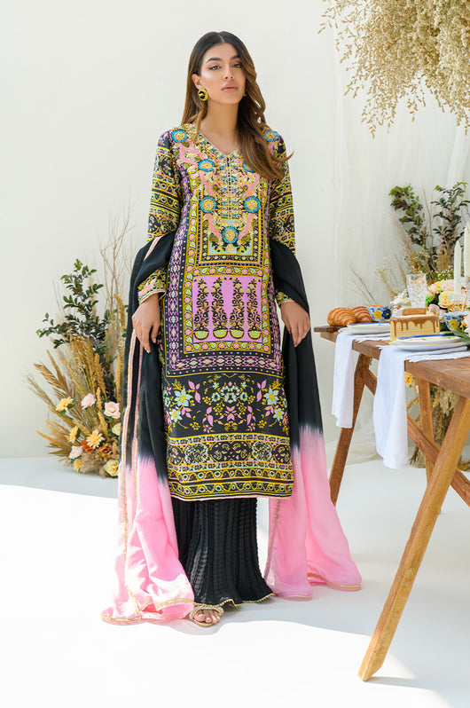 Sofie is a black digital printed shirt with hand embellished neckline, made in pure medium silk. Comes with crushed pants and a two-toned dupatta.