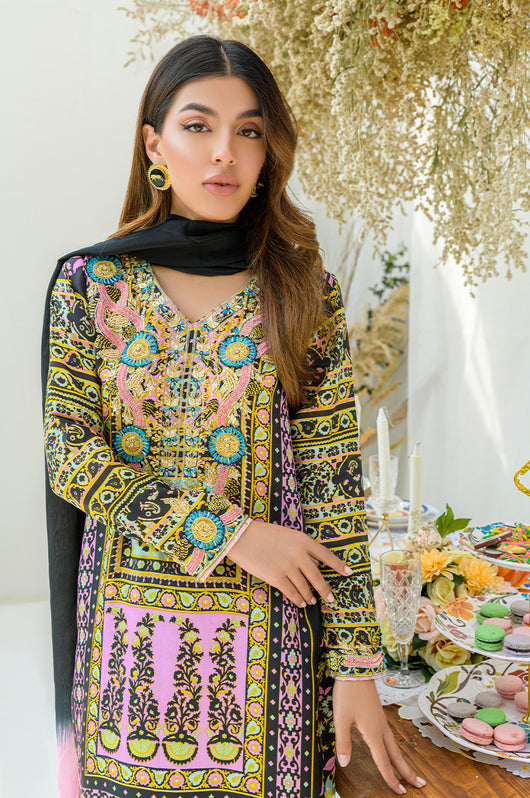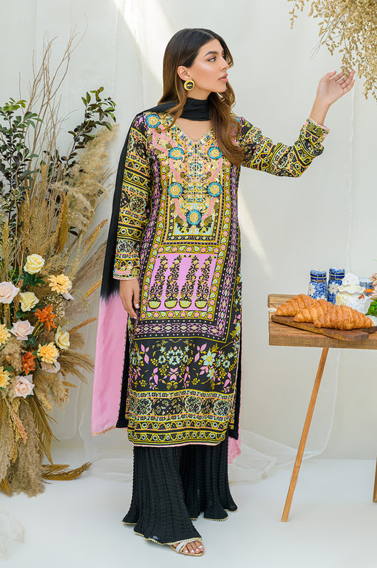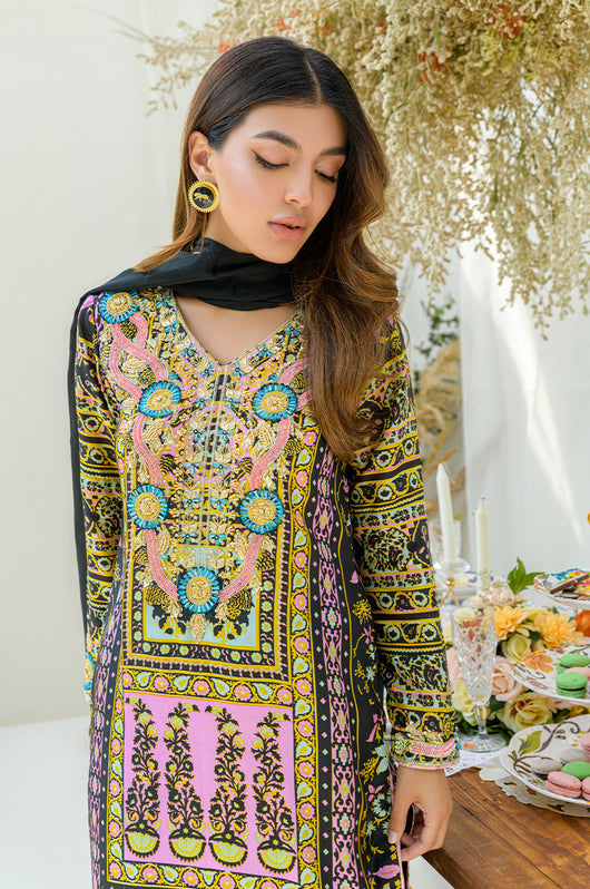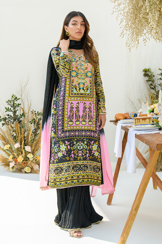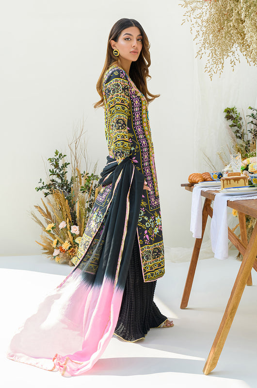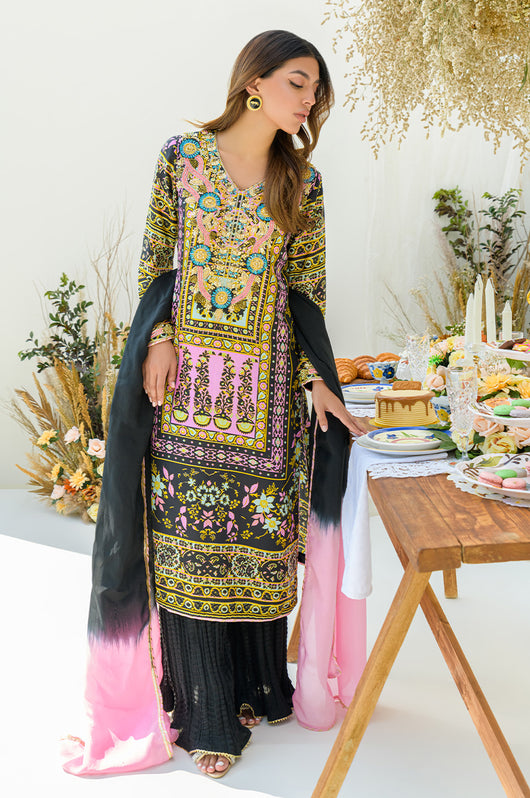 Sofie is a black digital printed shirt with hand embellished neckline, made in pure medium silk. Comes with crushed pants and a two-toned dupatta.