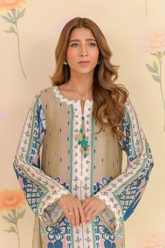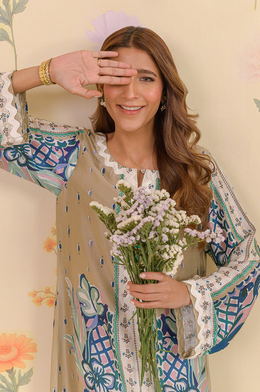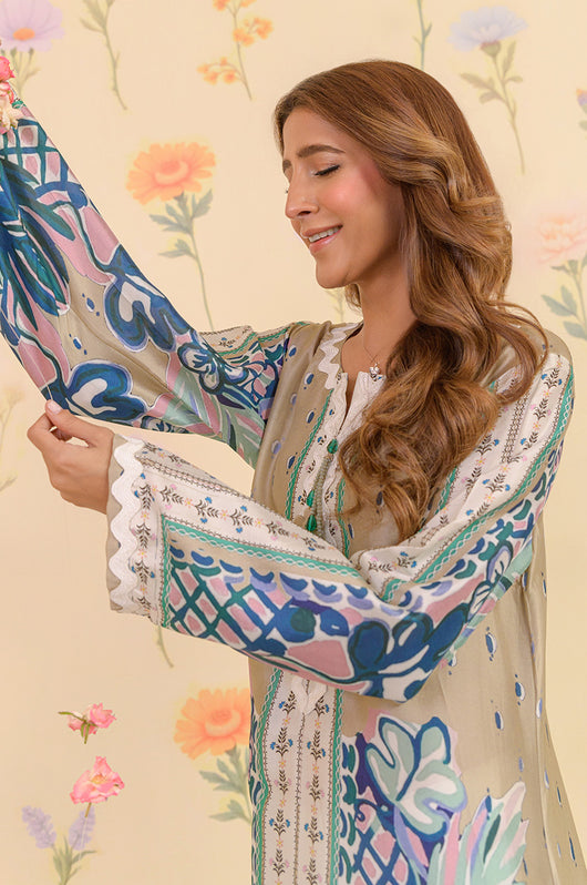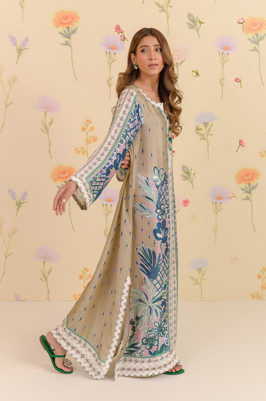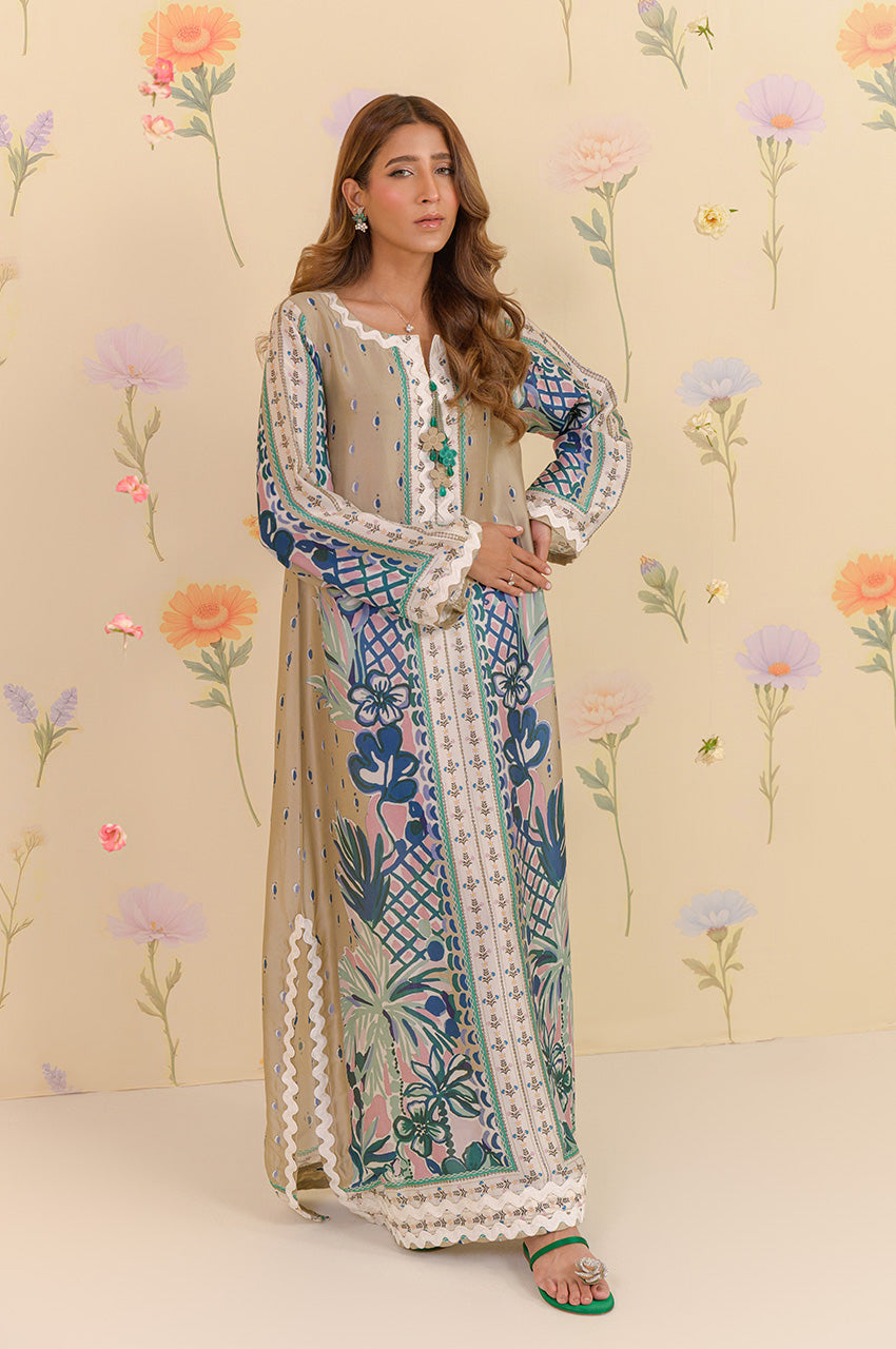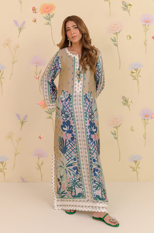 Almond Crunch is a beautiful mocha colored kaftan with embroidered borders at the border and sides in the front and back. The outfit has an embellished tassel in the front on the neckline. Made in pure butter silk perfect for day and nighttime mid-summer season.